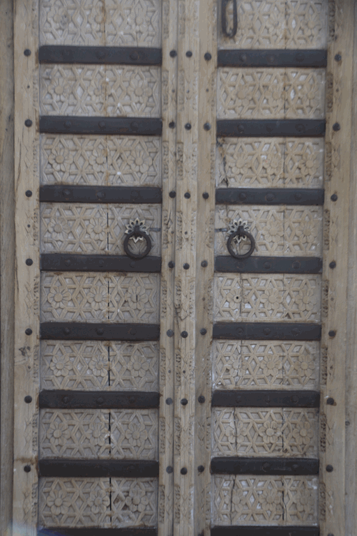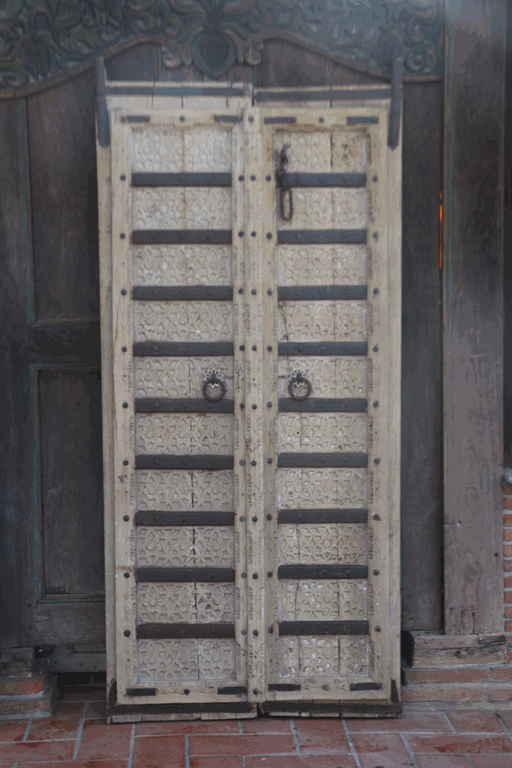 Porta antica indiana in legno schiarito con ante intagliate, borchie ed inserti in ferro battuto