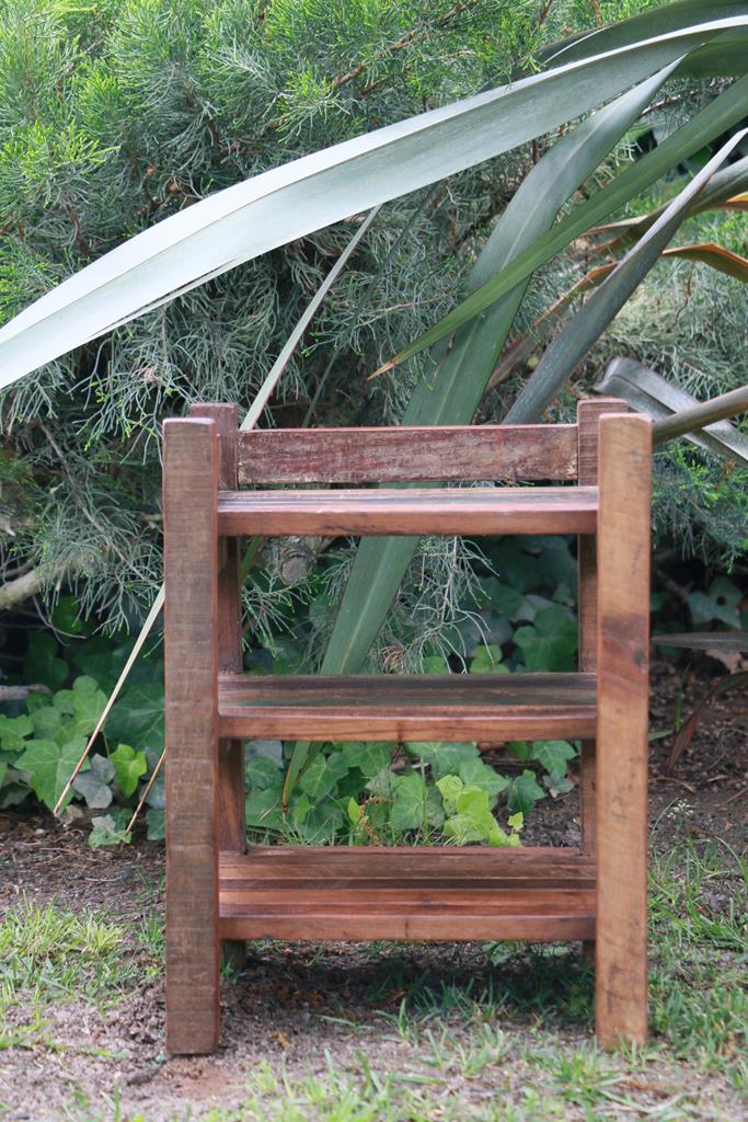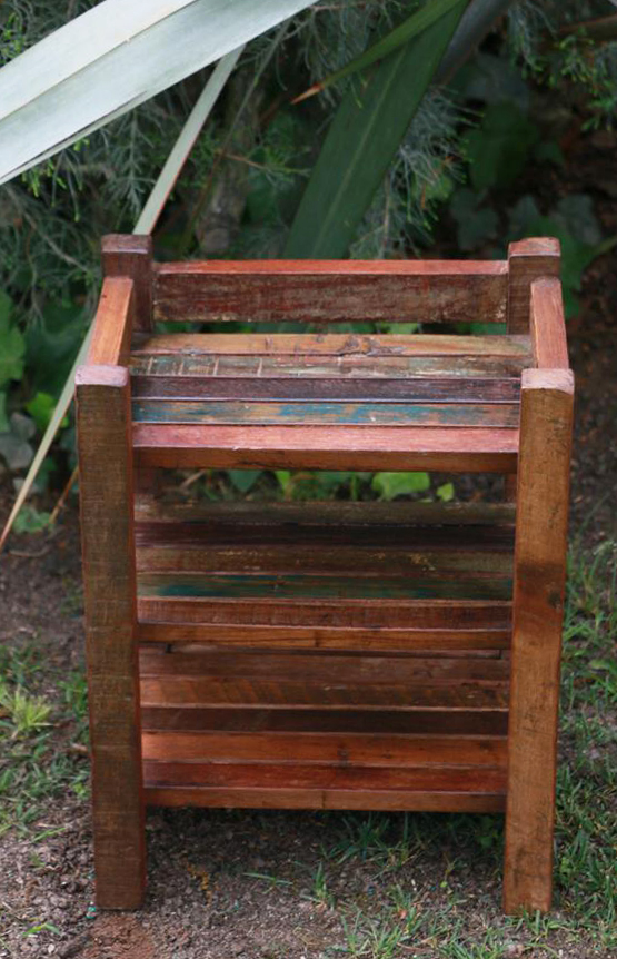 Porta oggetti in legno di teak sporcato in vari colori con tre ripiani a doghe e apertura ai lati. Da appoggio o da appendere