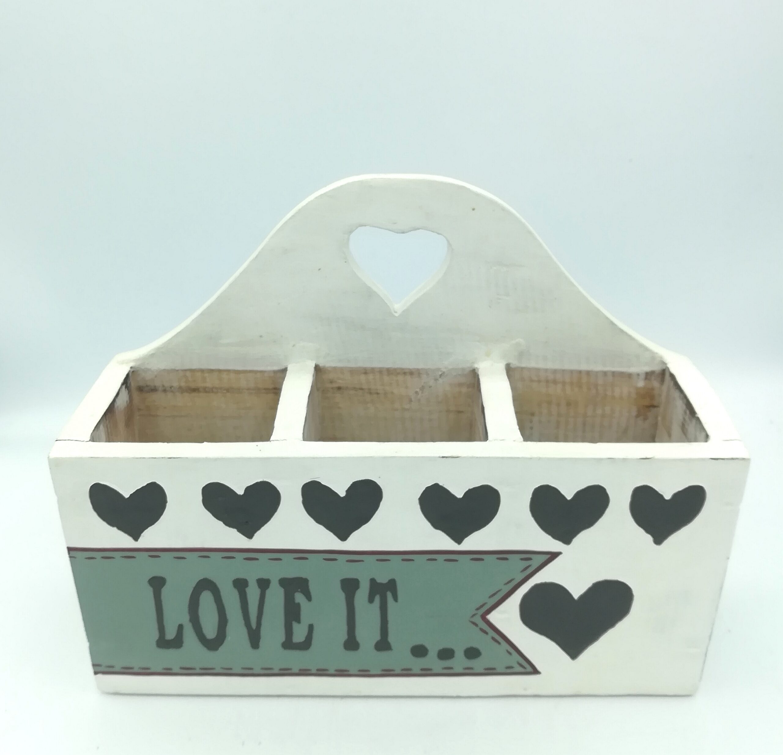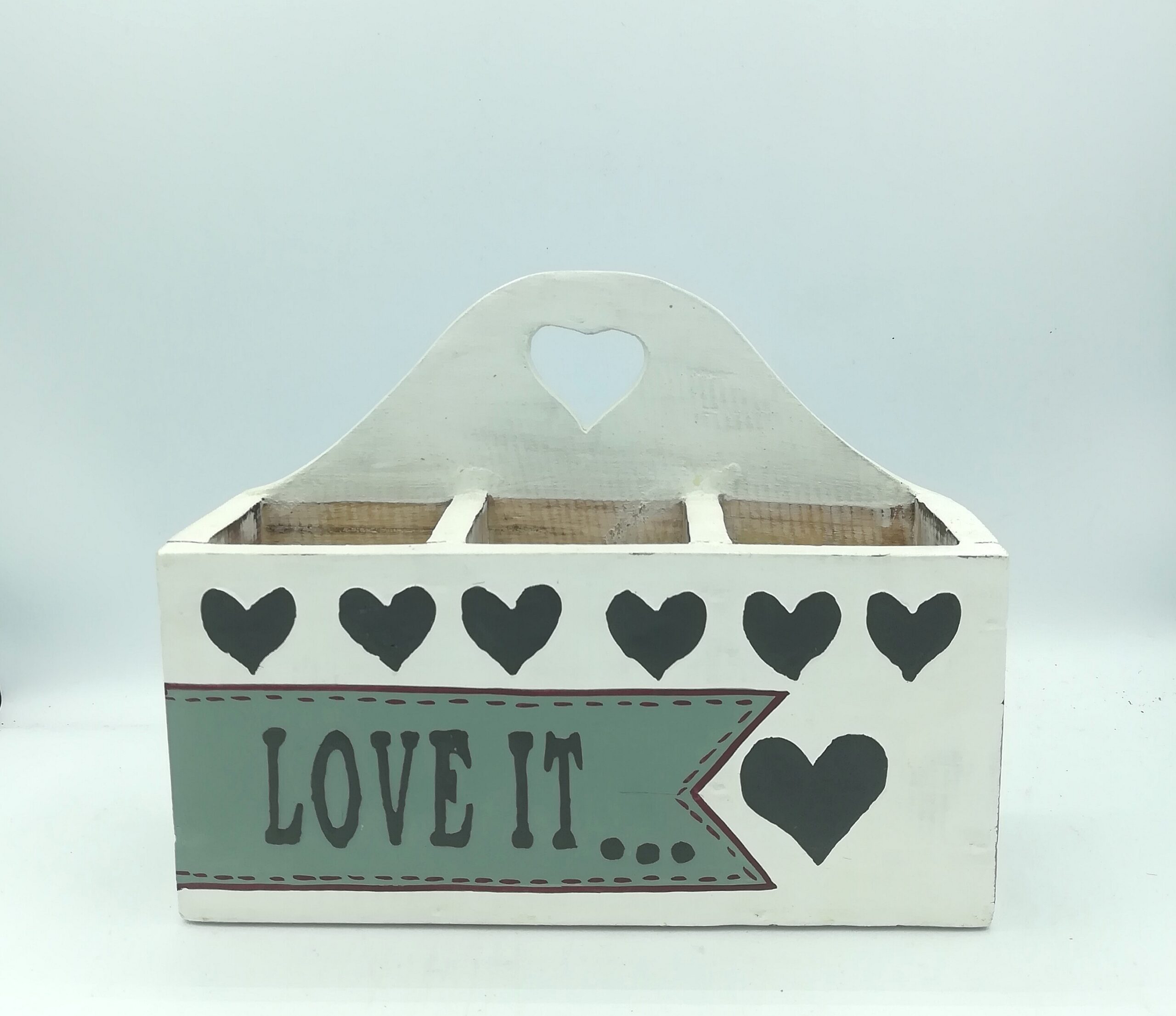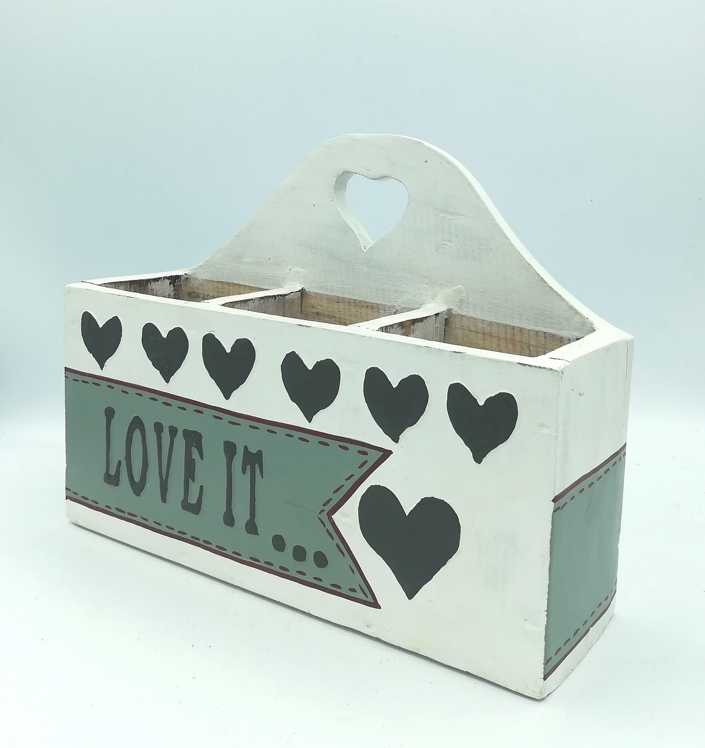 Porta oggetti o portapenne in legno indonesiano in colore bianco con scritta LOVE IT su sfondo verde salvia