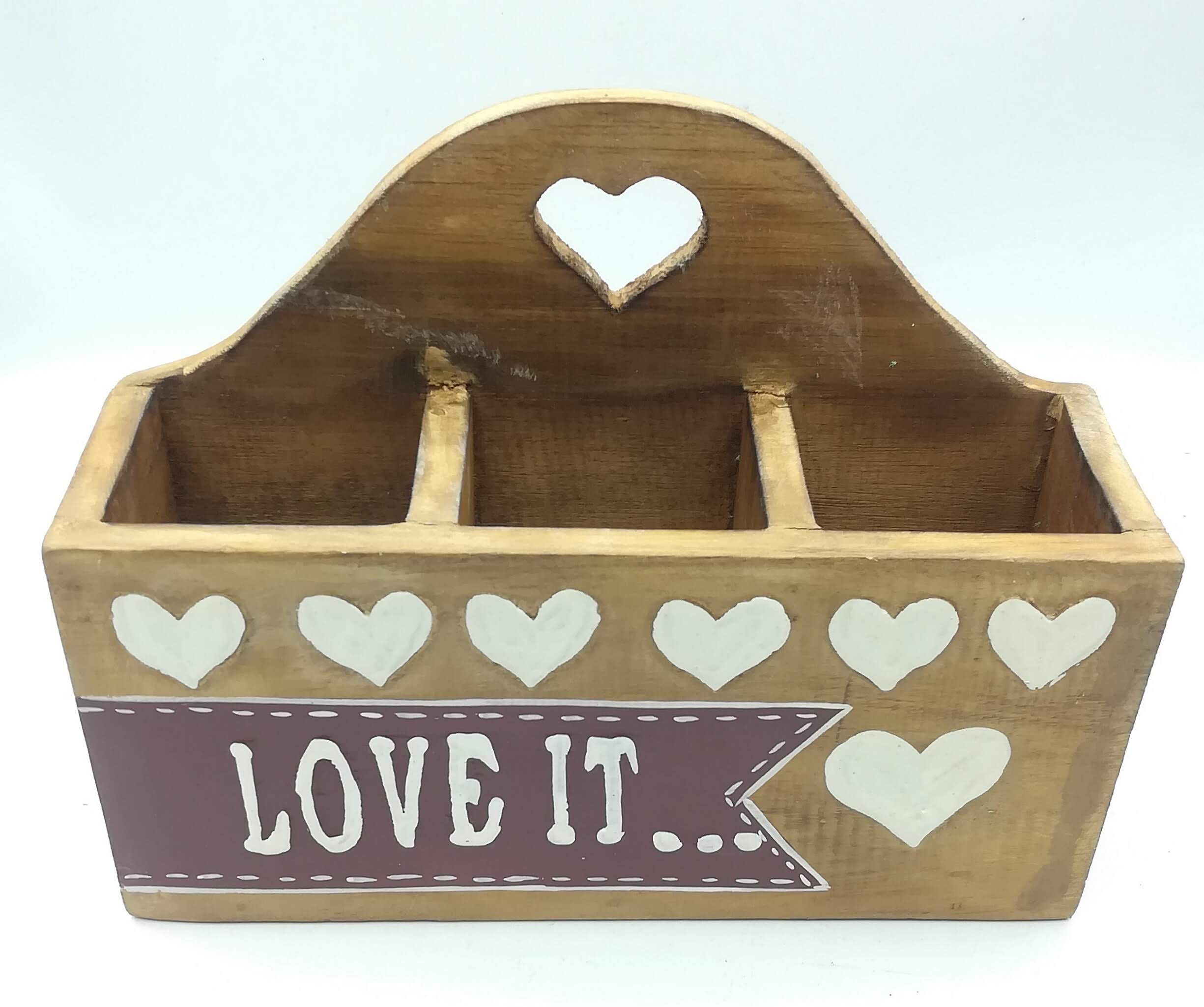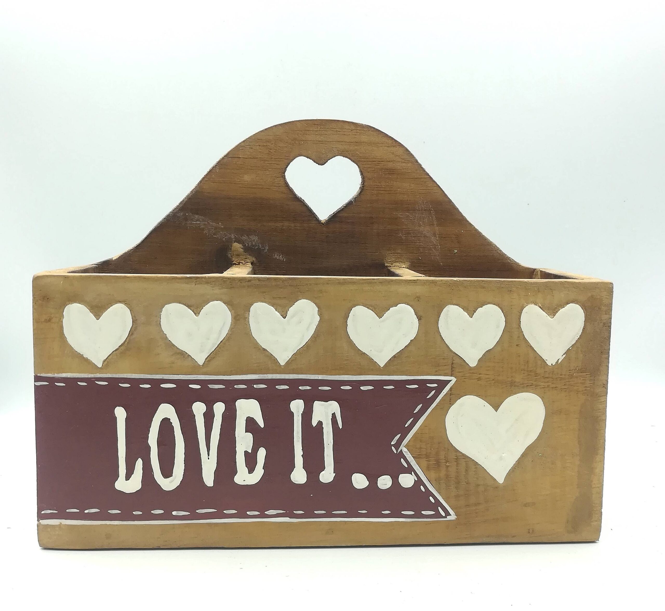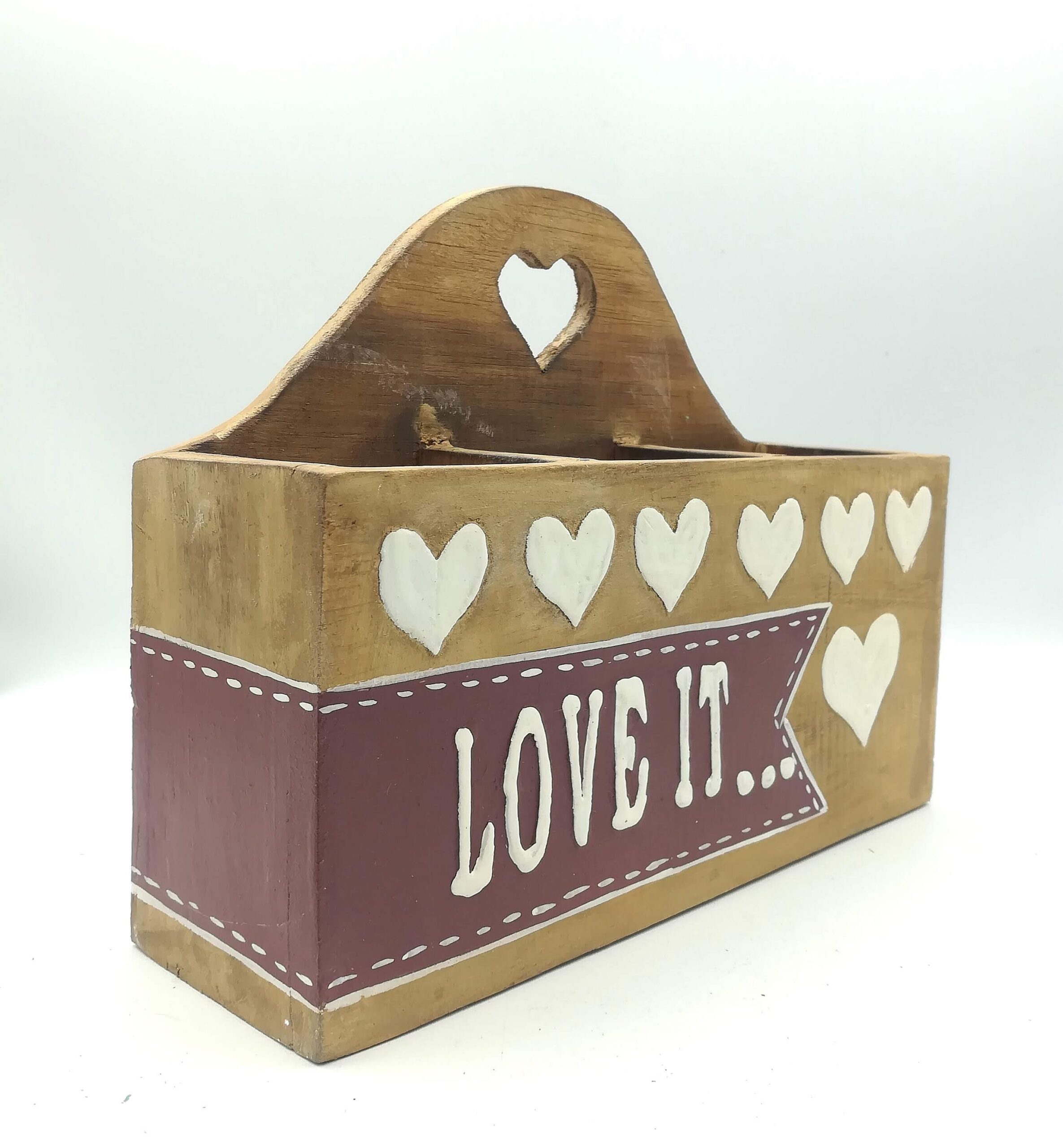 Porta oggetti in legno indonesiano in colore naturale con scritta LOVE IT su sfondo marrone