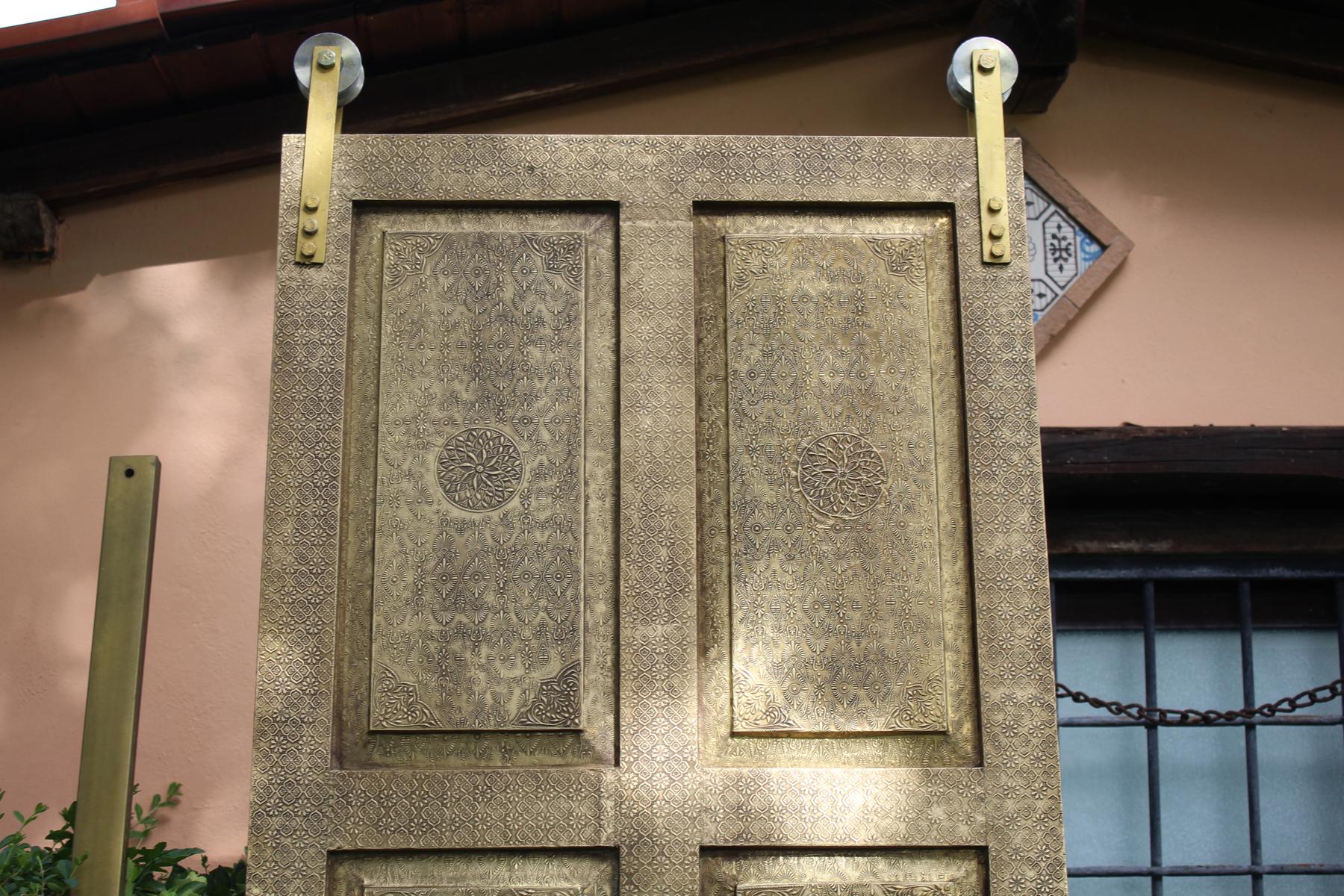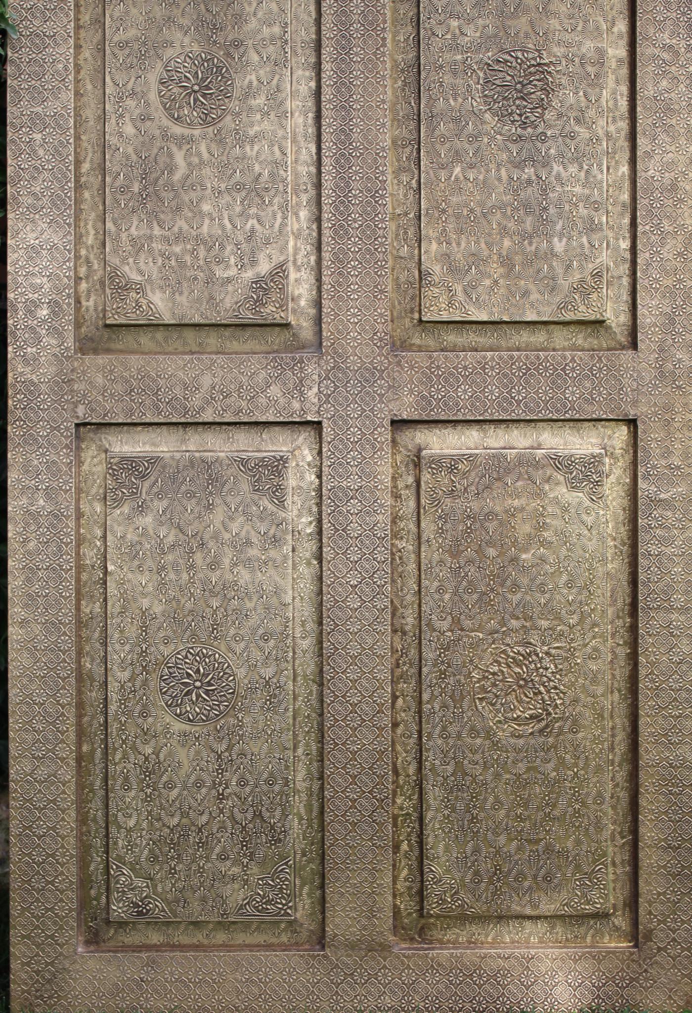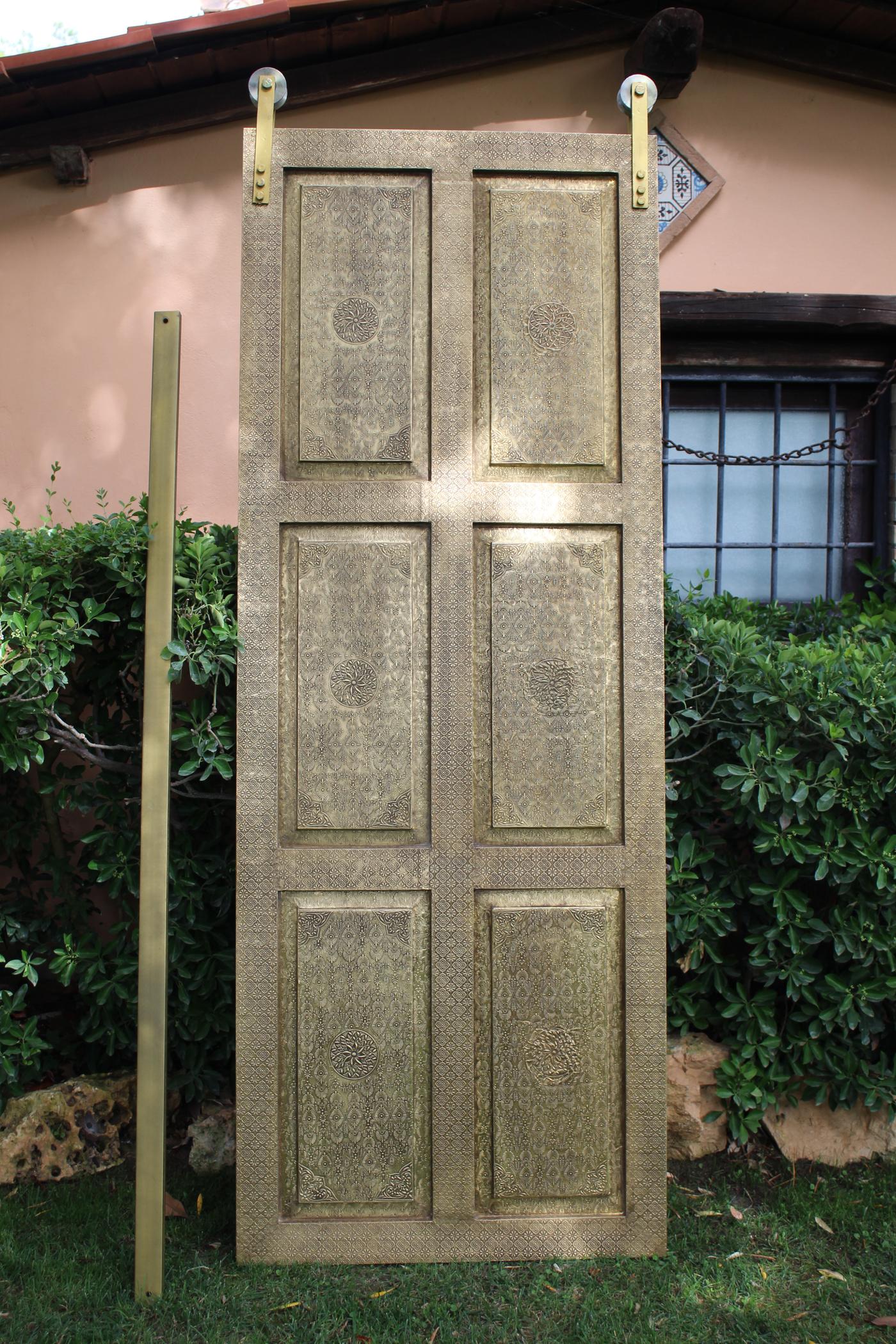 Porta scorrevole indiana, in legno rivestita da una sottile lamina di ottone completamente decorata.
