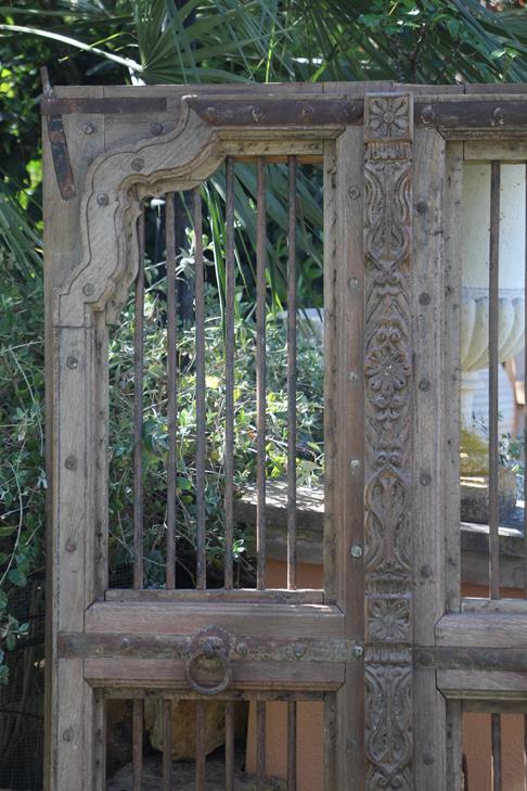 Piccola porta d’antiquariato indiana, in legno di teak naturale con grate e partizioni in ferro