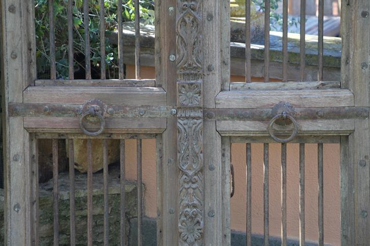 La porta Shiva, espressione affascinante dell’artigianato tradizionale indiano, è stata realizzata in legno di teak schiarito, colore che ben si armonizza con le grate e le partizioni in ferro, creando un effetto visivo affascinante.