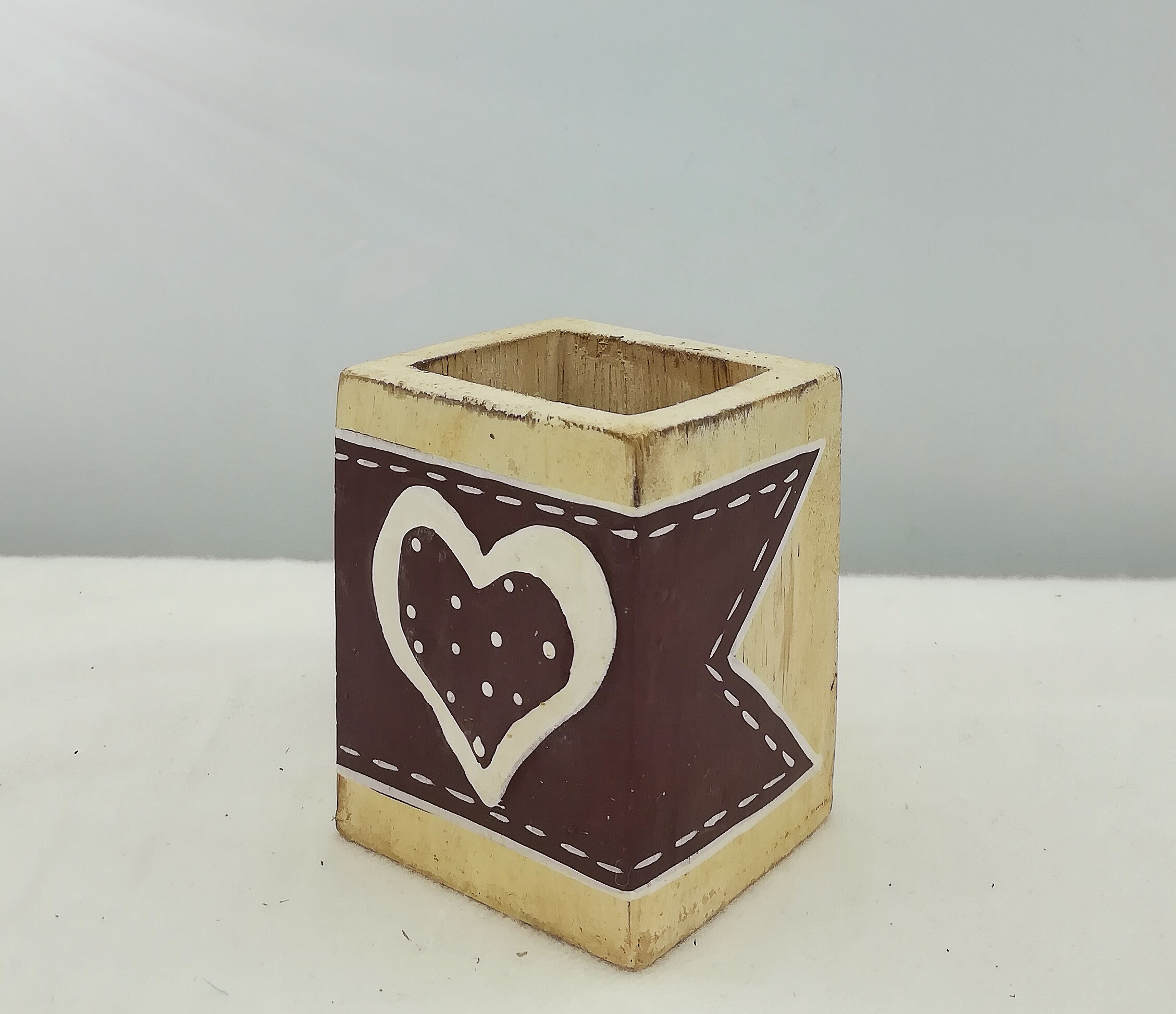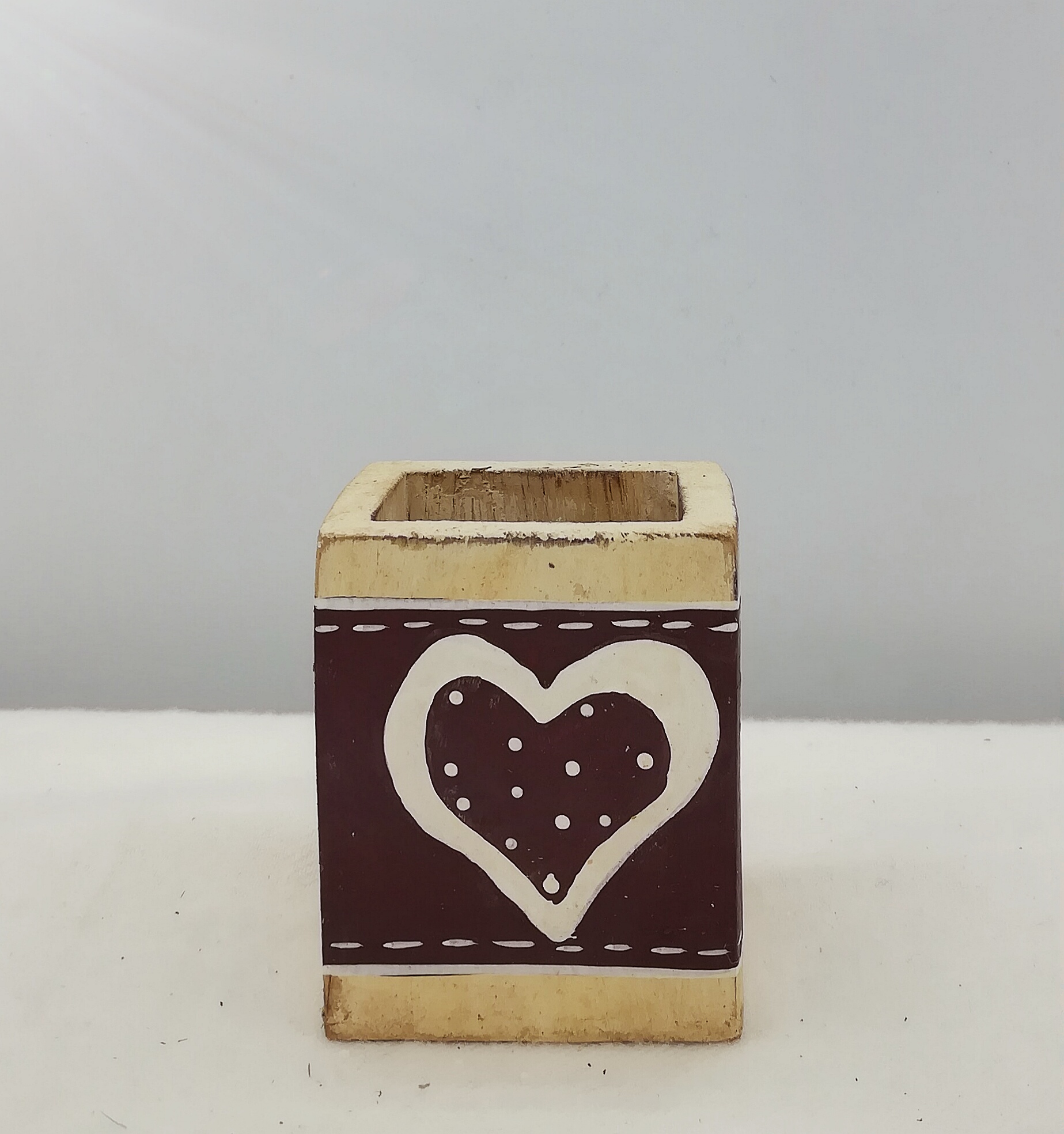 E’ un pratico contenitore rettangolare in legno color marrone e crema con un disegno a cuore sulla parte frontale.