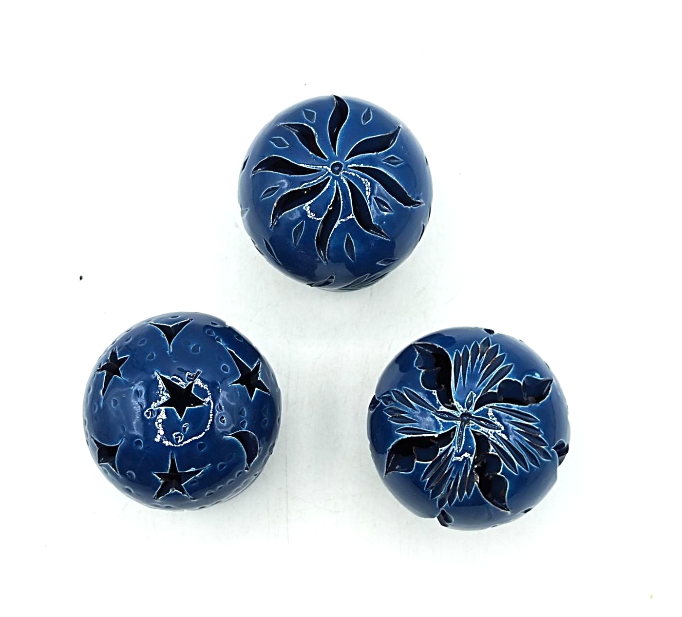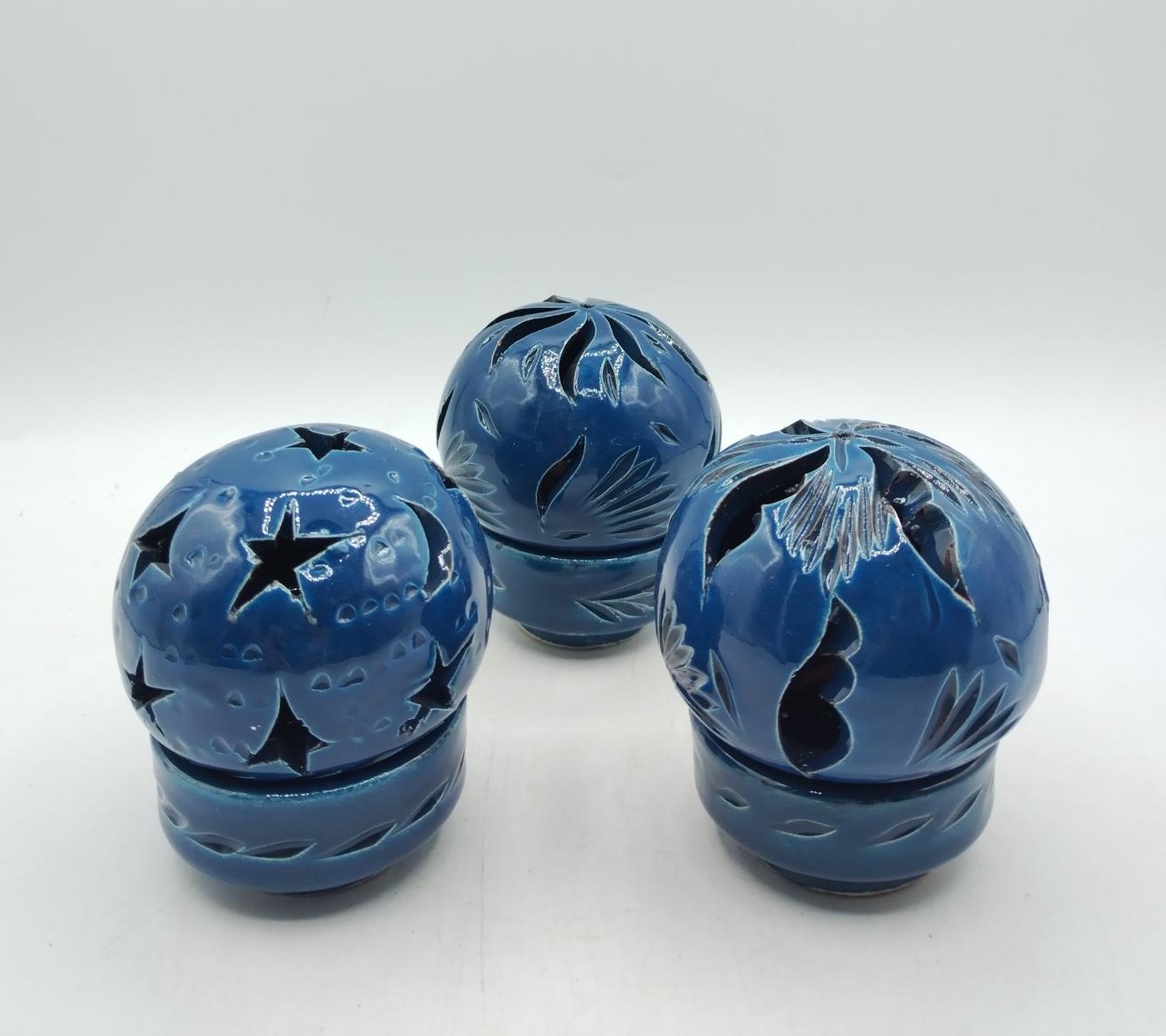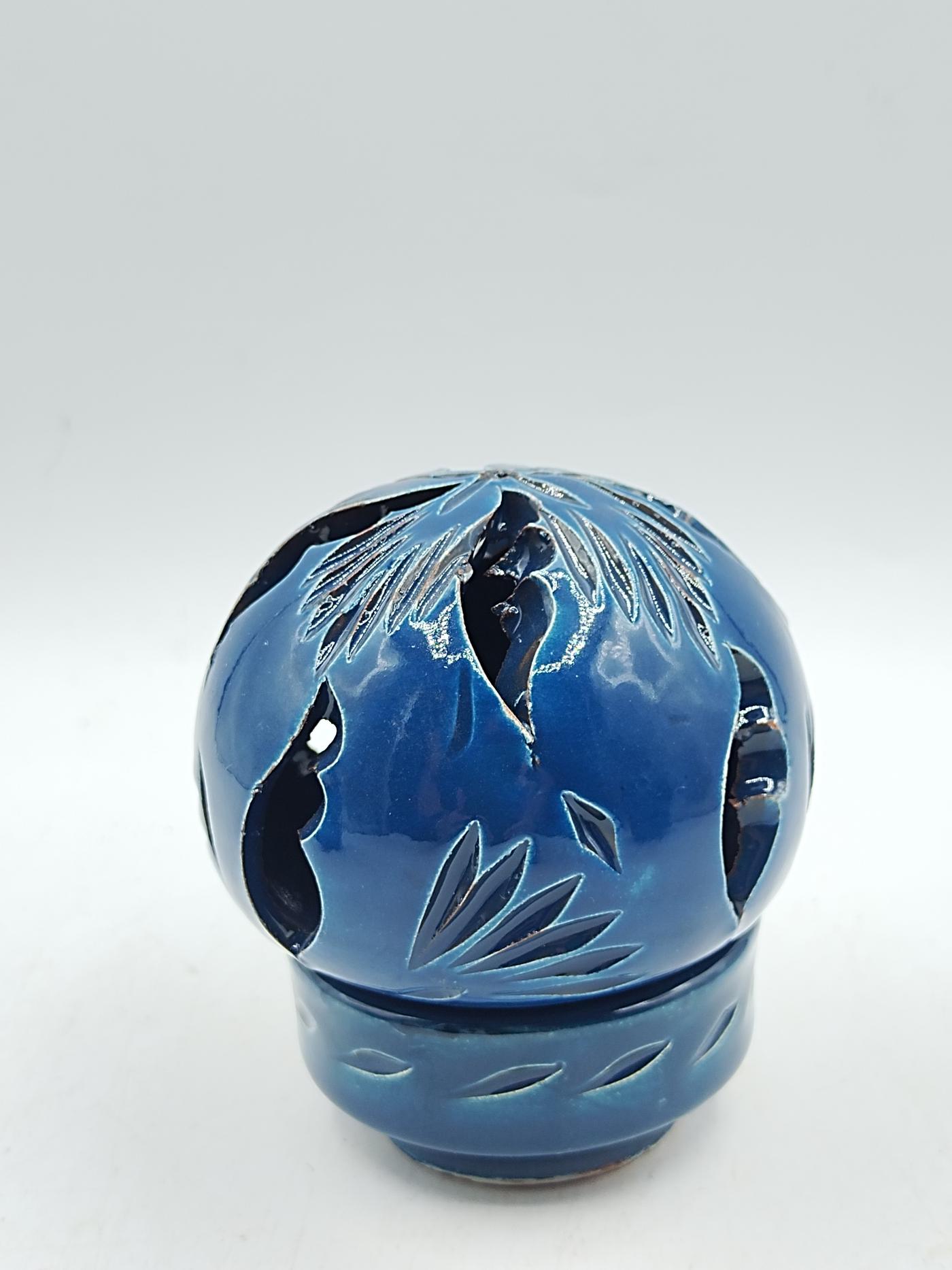La sfera è finemente lavorata a mano, con intagli geometrici e floreali che permettono alla luce o al fumo di diffondersi in modo suggestivo, creando luci ed ombre in un’atmosfera calda e accogliente.
