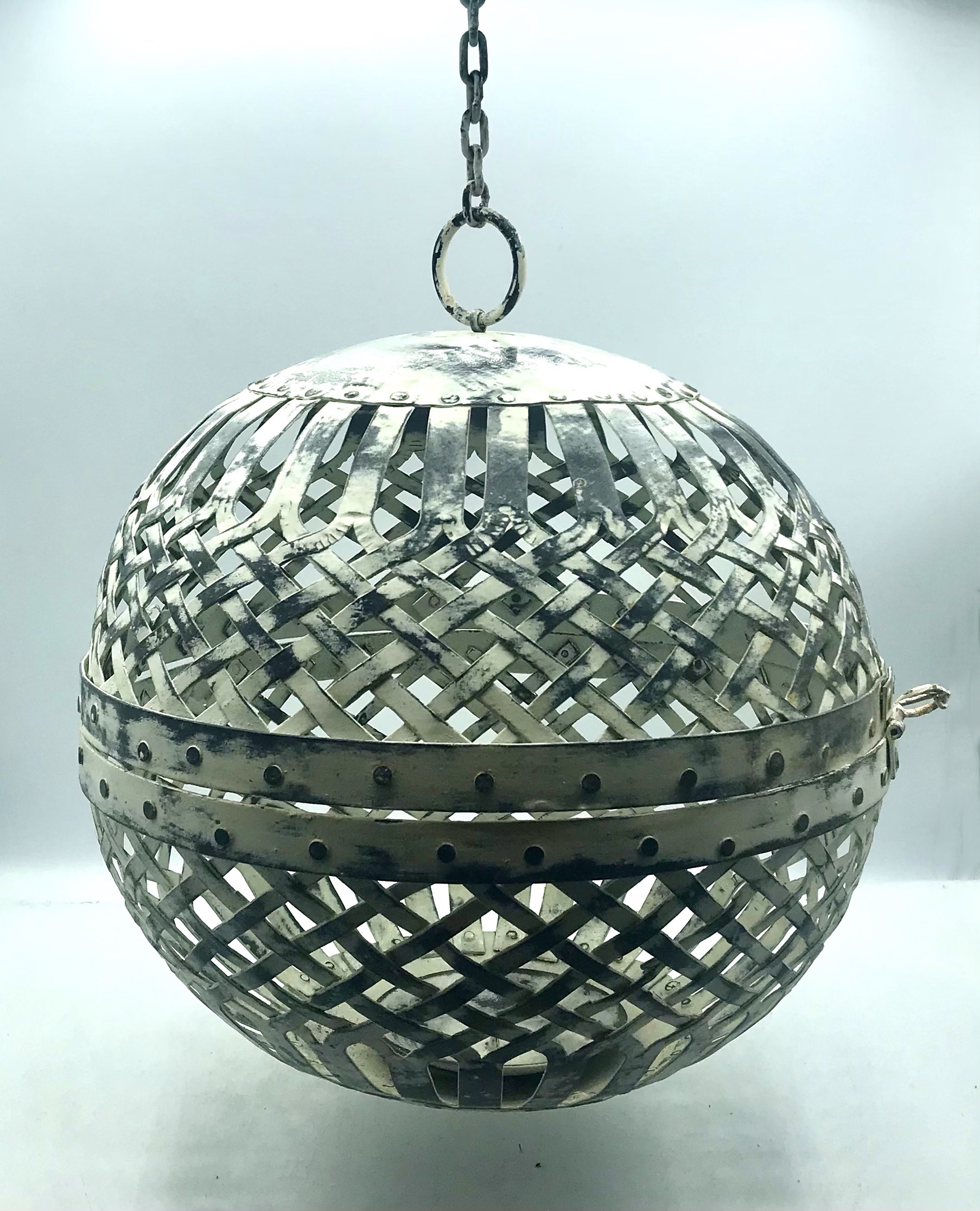 E’ composto da una sfera in ferro traforata, decapata bianca, che si apre nella parte centrale, dove si trova la base in cui posizionare la candela, che viene sospesa attraverso una lunga catena.