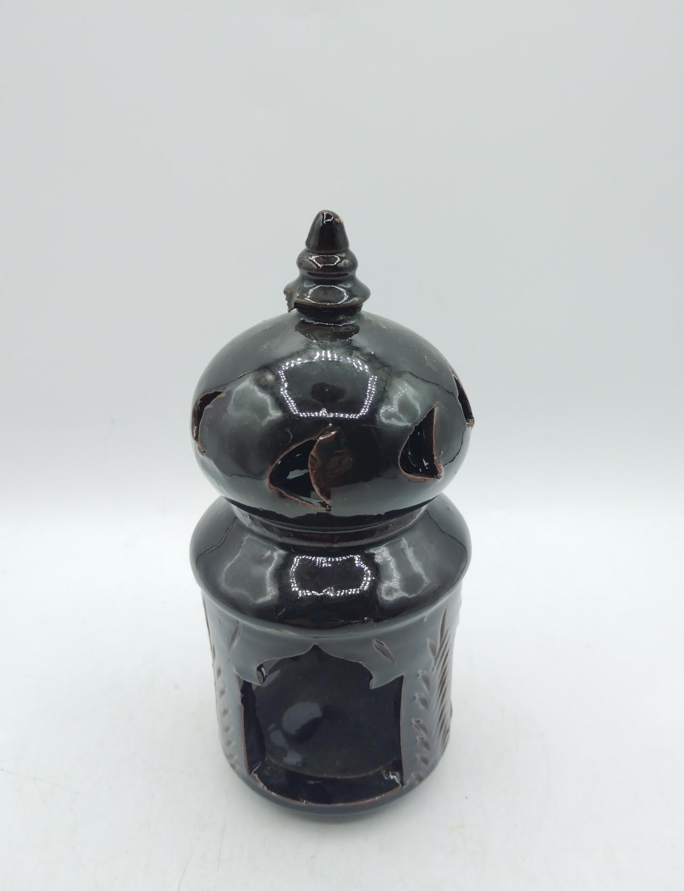 Portacandela realizzato artigianalmente in Marocco in terracotta nera smaltata traforata