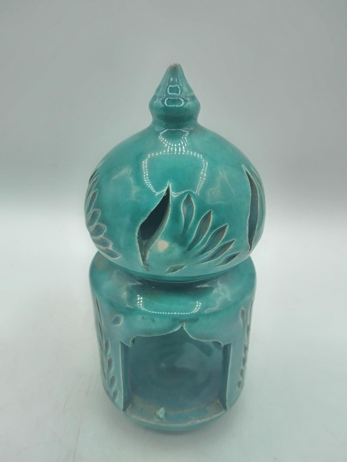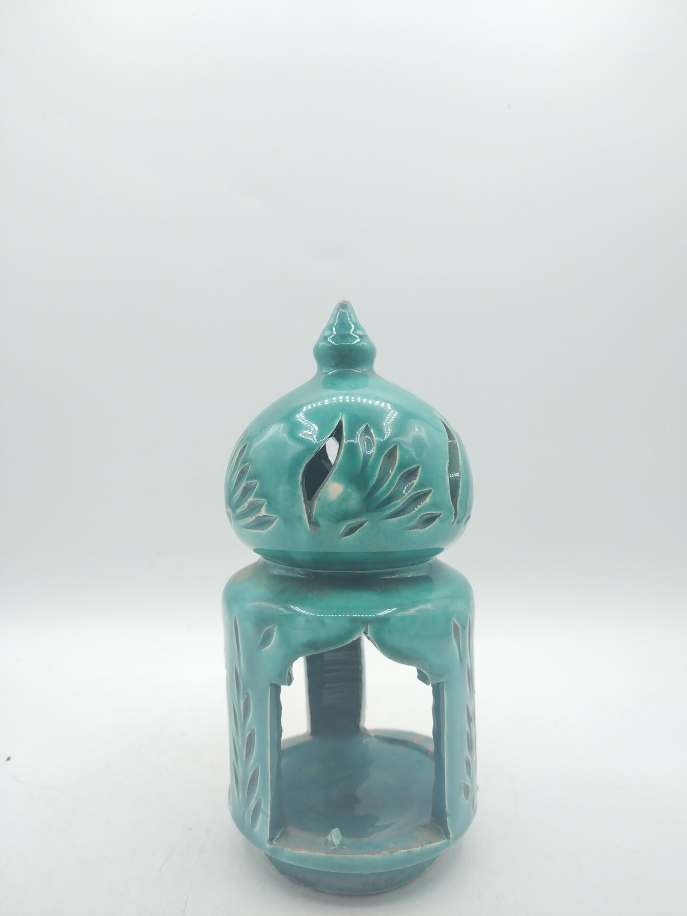 Portacandela realizzato artigianalmente in Marocco in terracotta smaltata turchese traforata