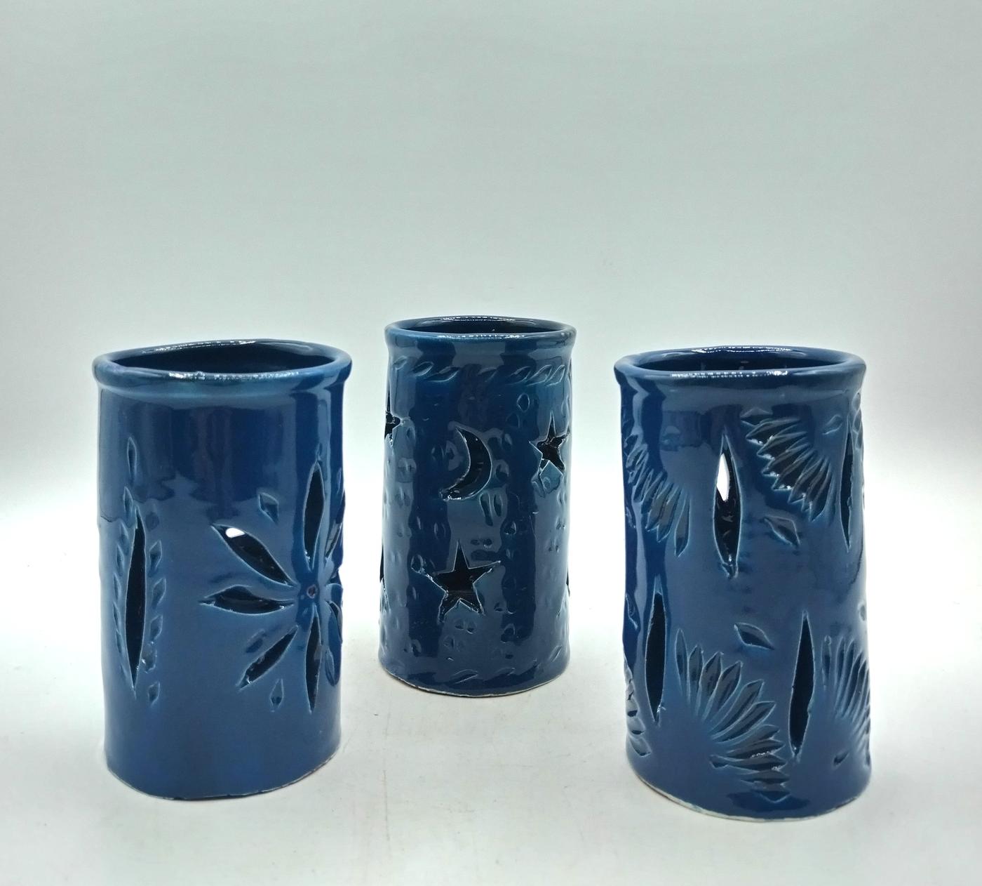 Portacandela realizzato artigianalmente in Marocco in terracotta smaltata traforata con motivi floreali e geometrici.