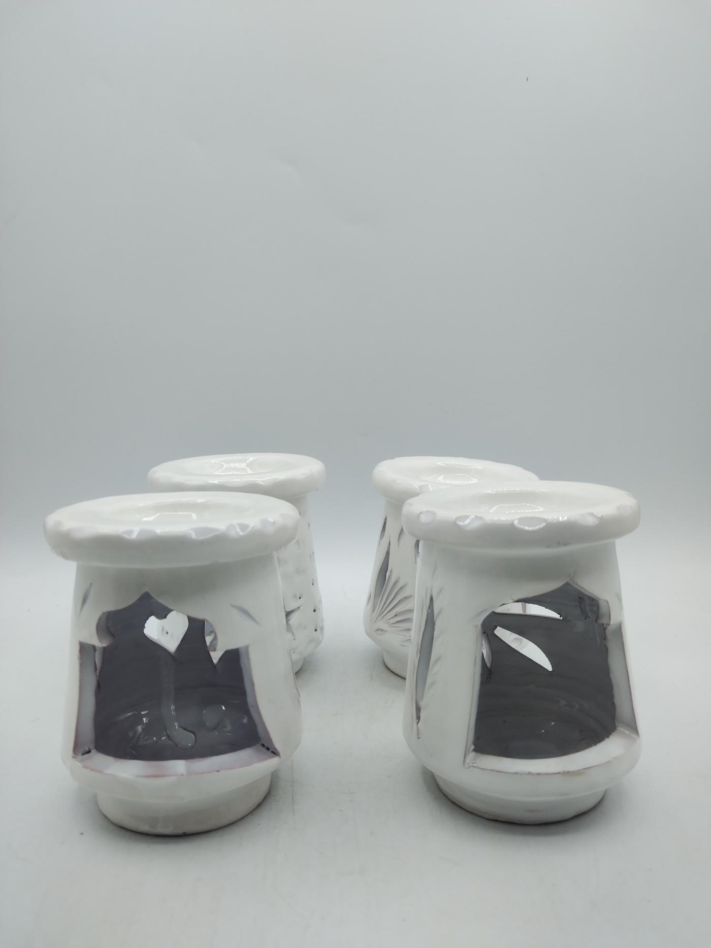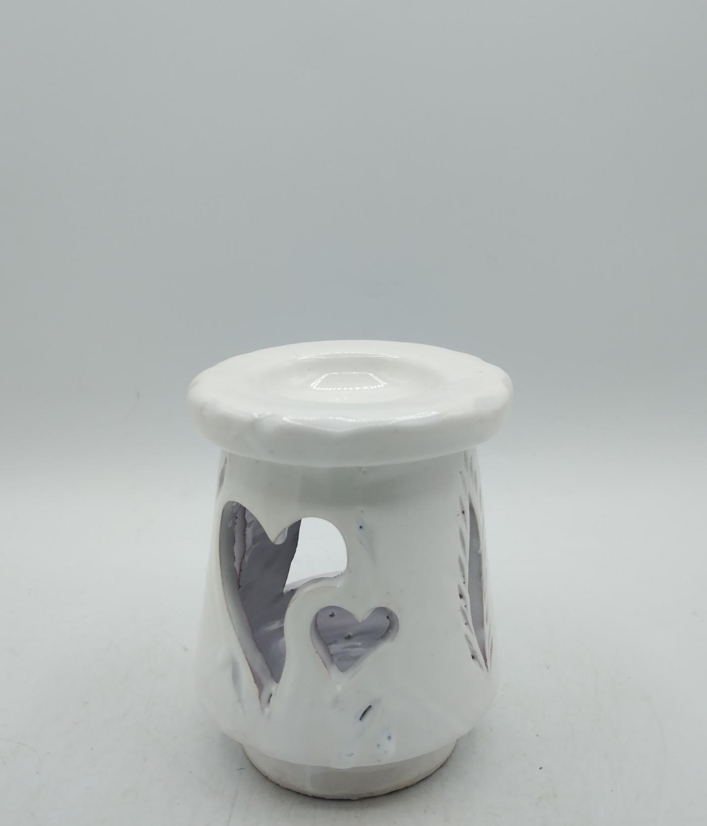 La sua struttura cilindrica è traforata con motivi floreali e geometrici che creano delicati giochi di ombre e bagliori quando la candela è accesa.