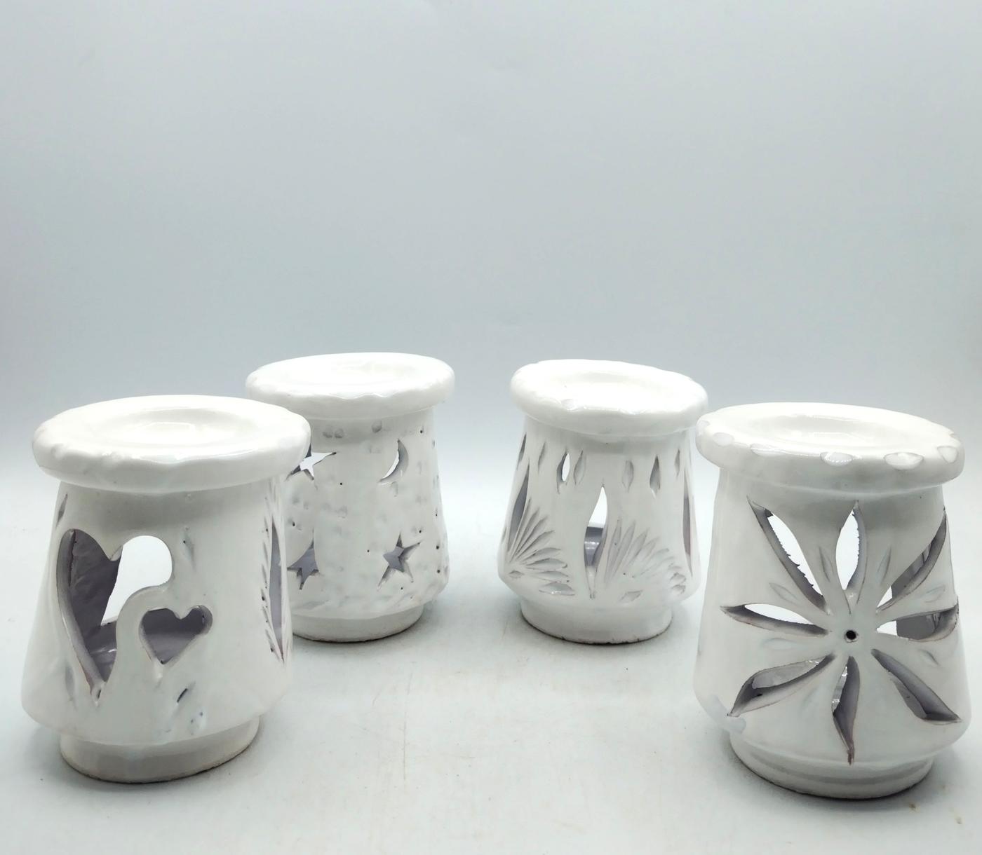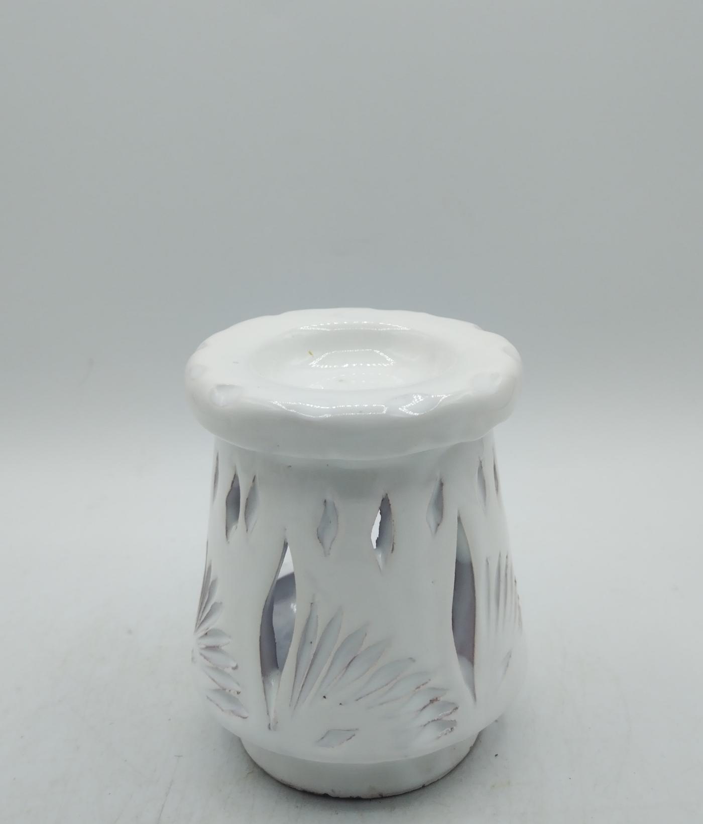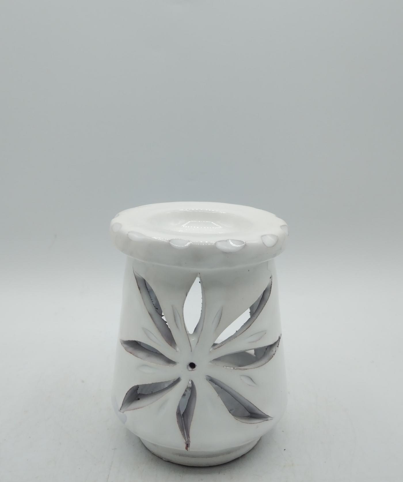 Portacandela realizzato artigianalmente in Marocco in terracotta smaltata traforata con motivi floreali e geometrici.