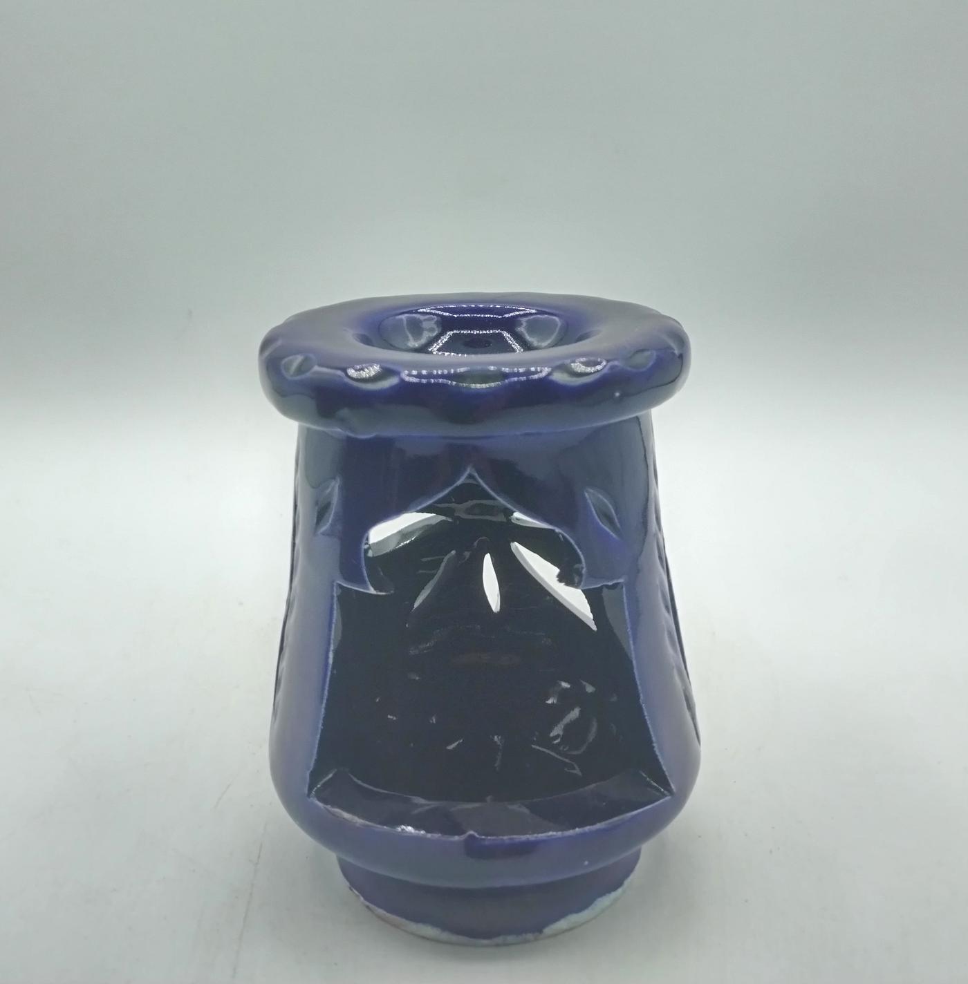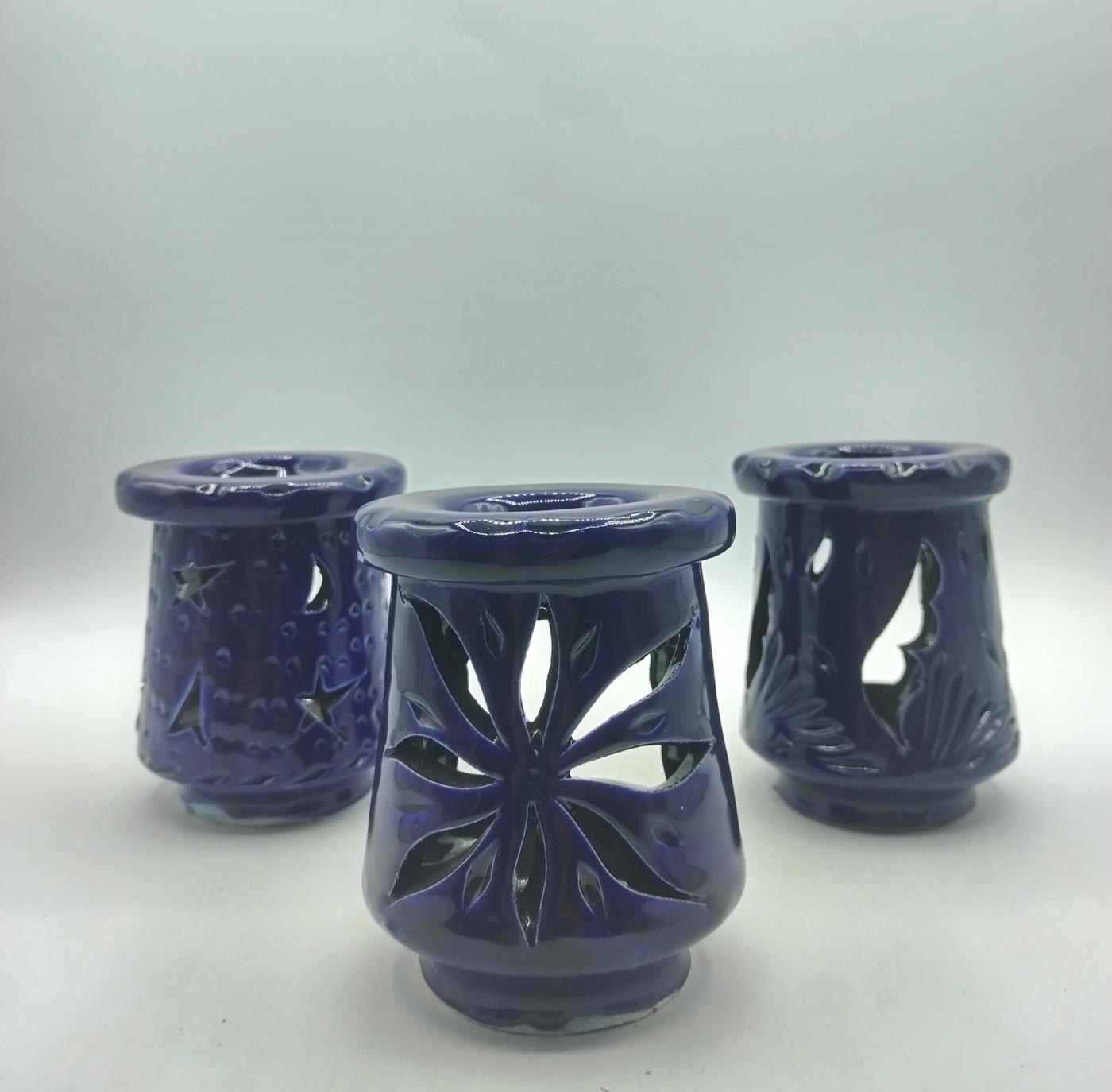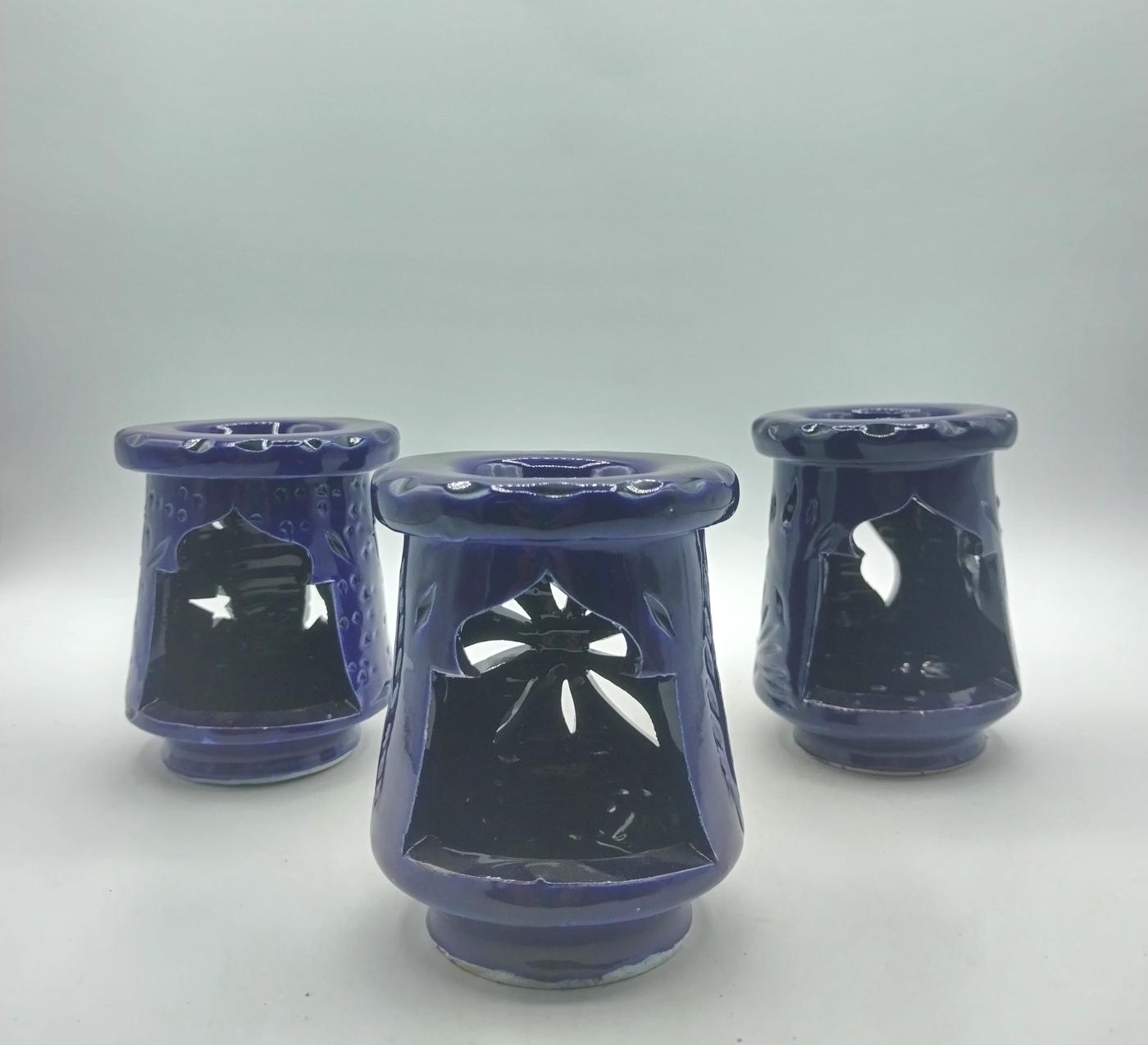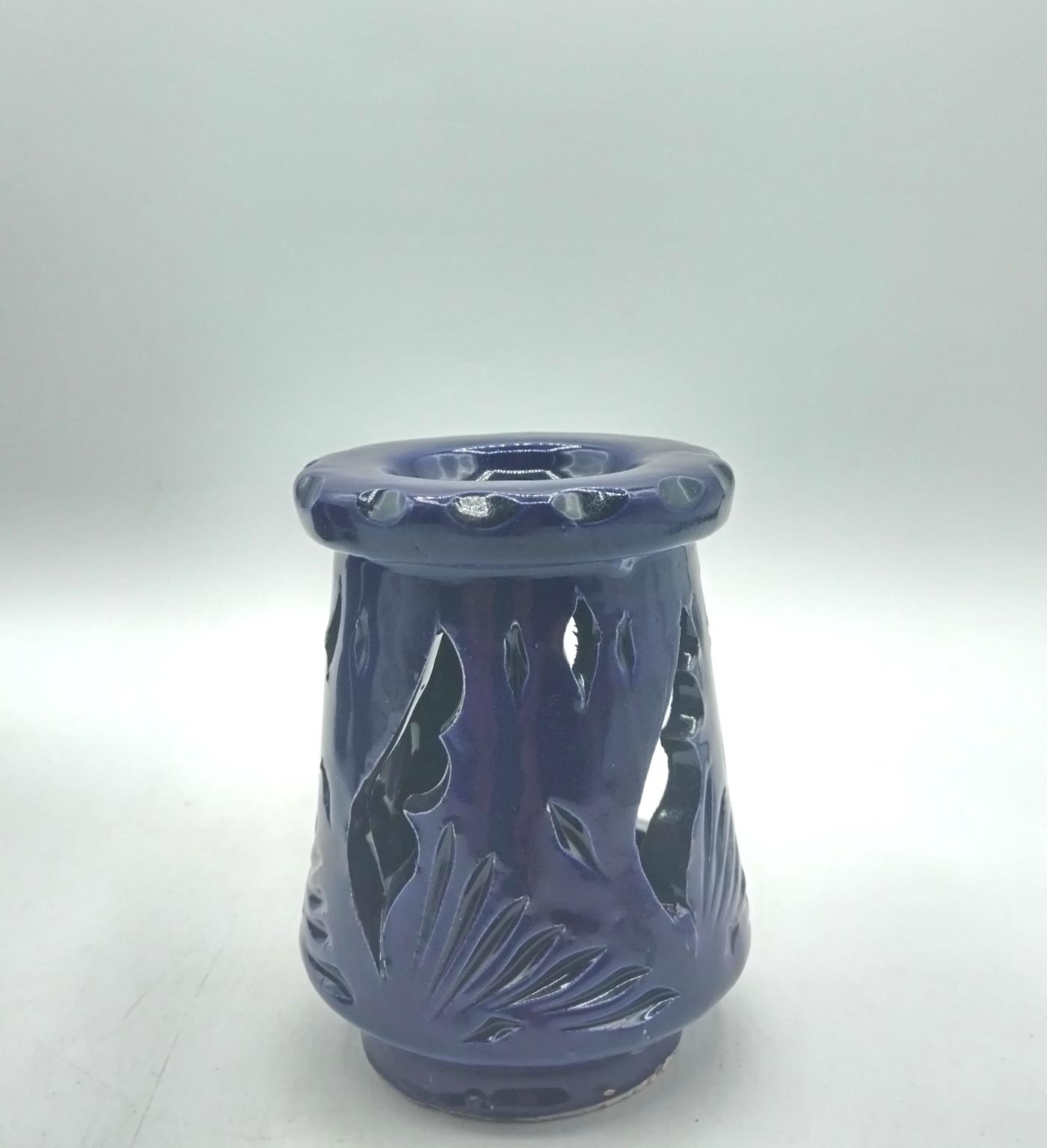 Portacandela realizzato artigianalmente in Marocco in terracotta smaltata color blu, traforata con motivi floreali e geometrici.