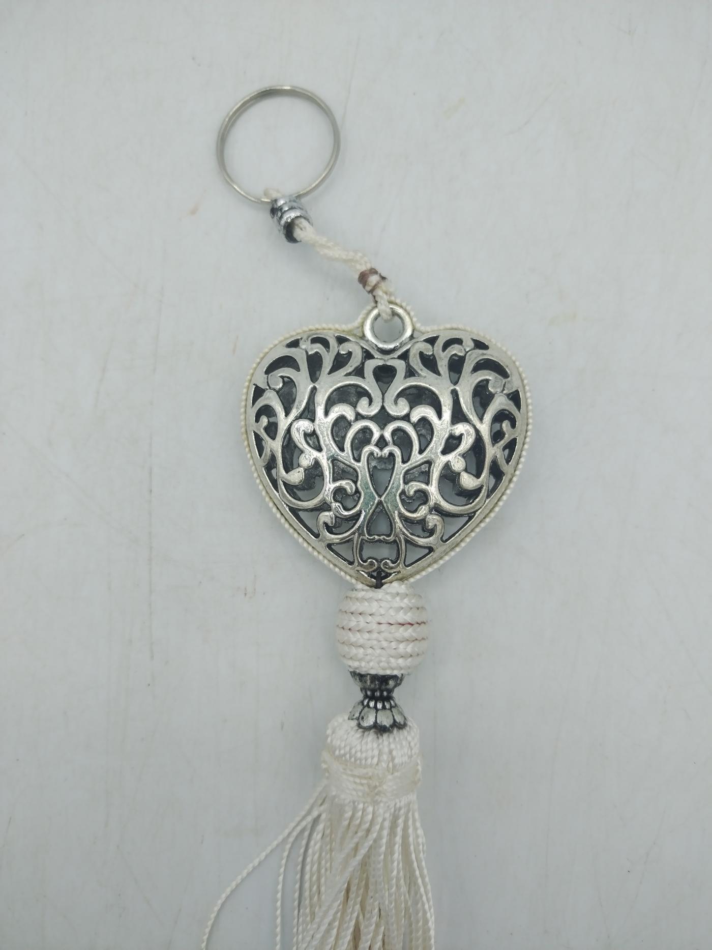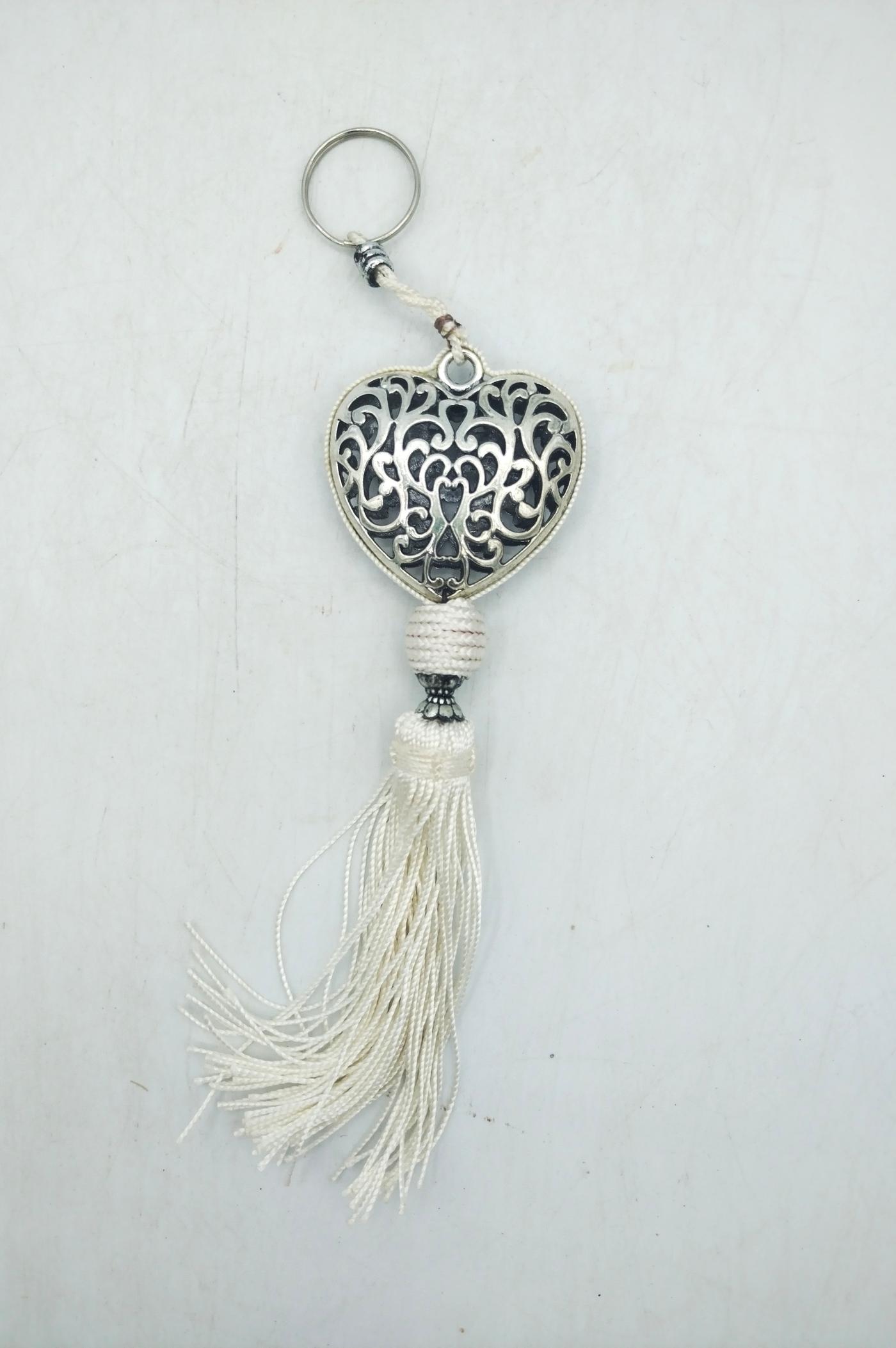 Portachiavi in metallo traforato a forma di cuore con nappa in cotone color bianco, realizzato in Marocco