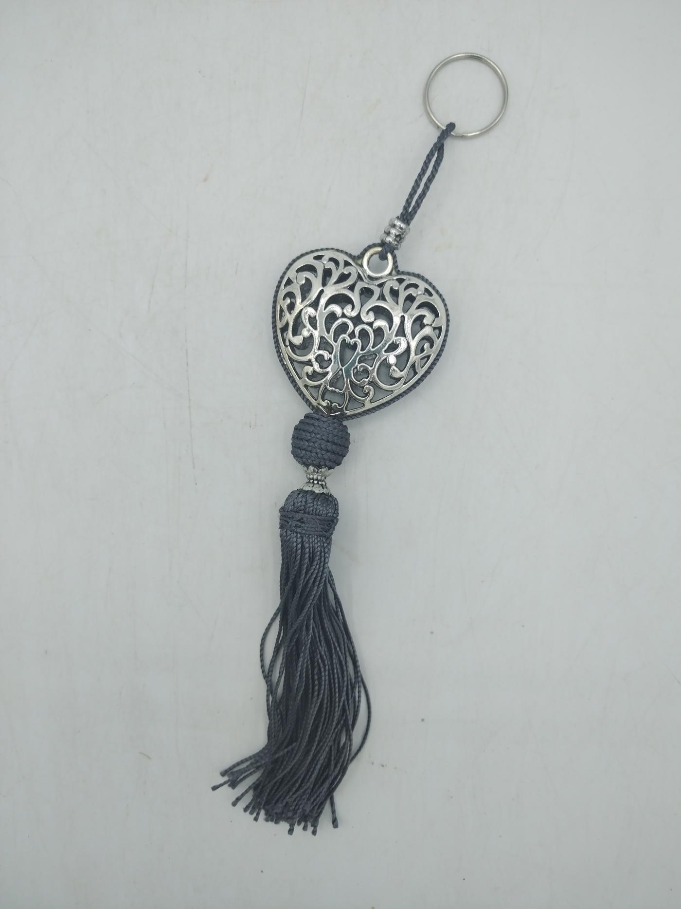 Portachiavi in metallo traforato a forma di cuore con nappa in cotone color grigio, realizzato in Marocco