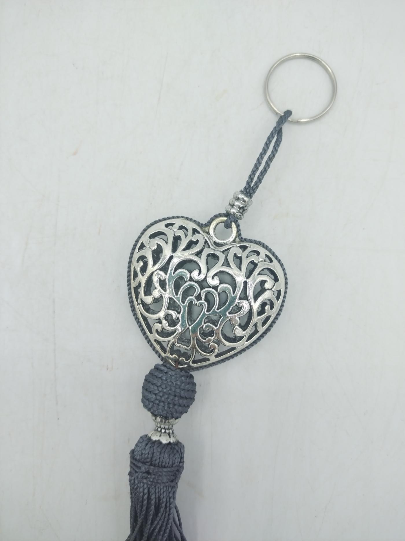 Il portachiavi Heart è stato realizzato artigianalmente in Marocco, con un cuore in metallo traforato con motivi floreali a cui è collegata una palla in tessuto e sotto una lunga nappa colorata, posta come decorazione finale, composta da fili intrecciati di colore grigio.