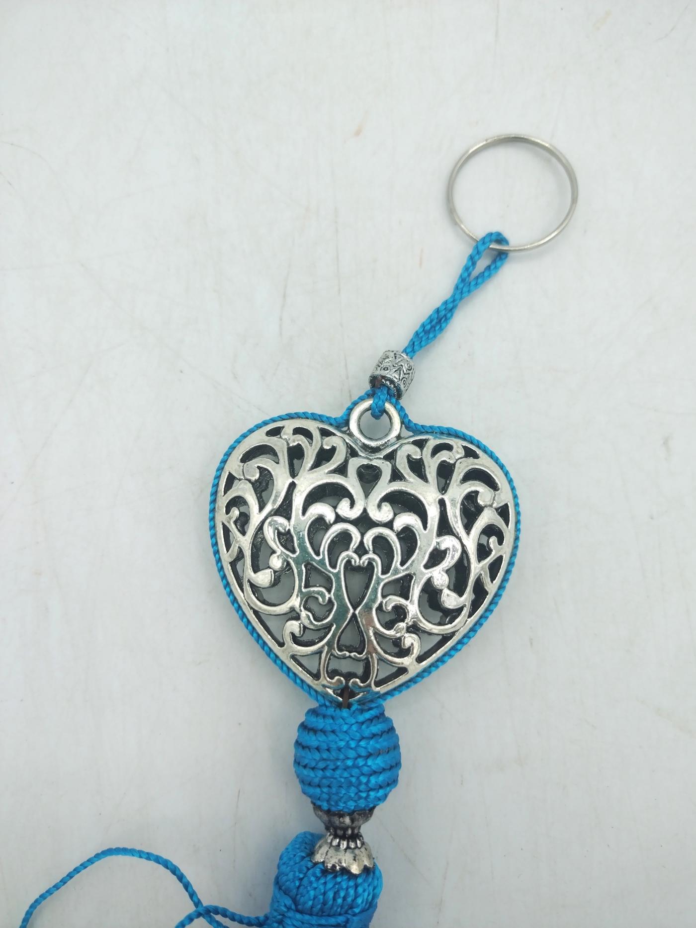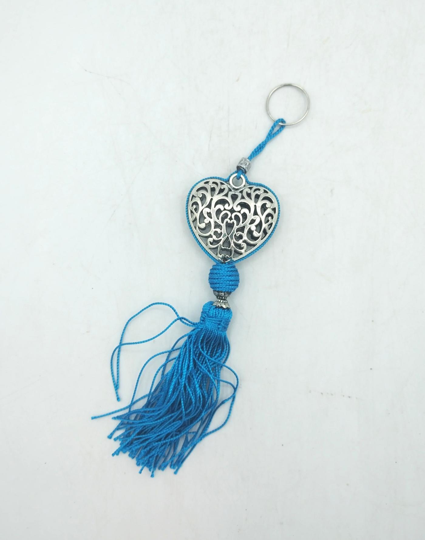 Il portachiavi Heart è stato realizzato artigianalmente in Marocco, con un cuore in metallo traforato con motivi floreali a cui è collegata una palla in tessuto e sotto una lunga nappa colorata, posta come decorazione finale, composta da fili intrecciati di colore turchese.