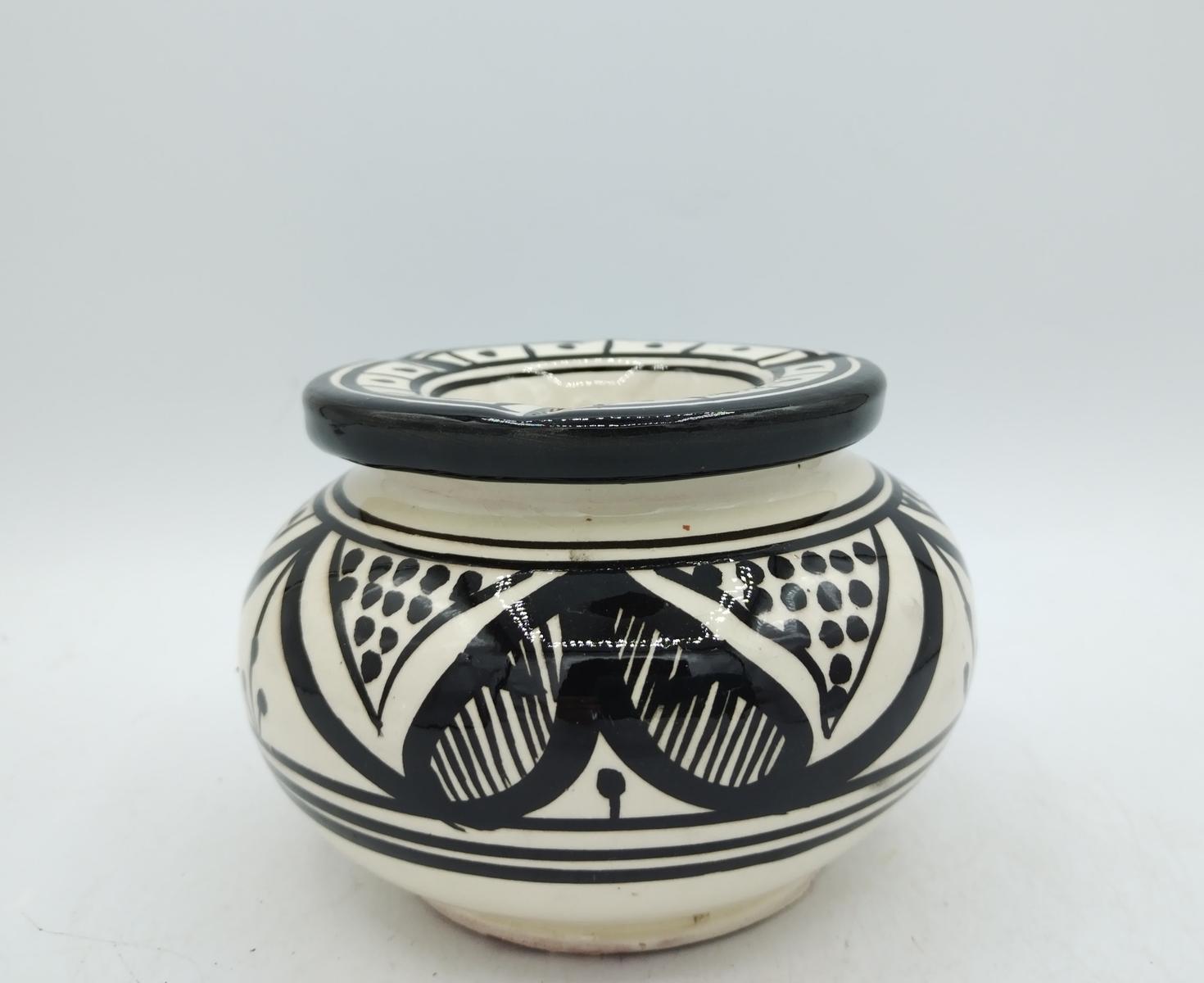 Il posacenere Agadir è stato realizzato in terracotta smaltata decorata con disegni geometrici bianchi e neri tipici orientali.