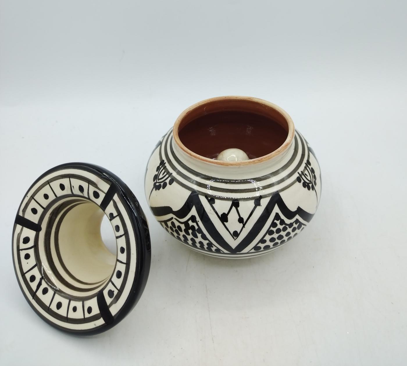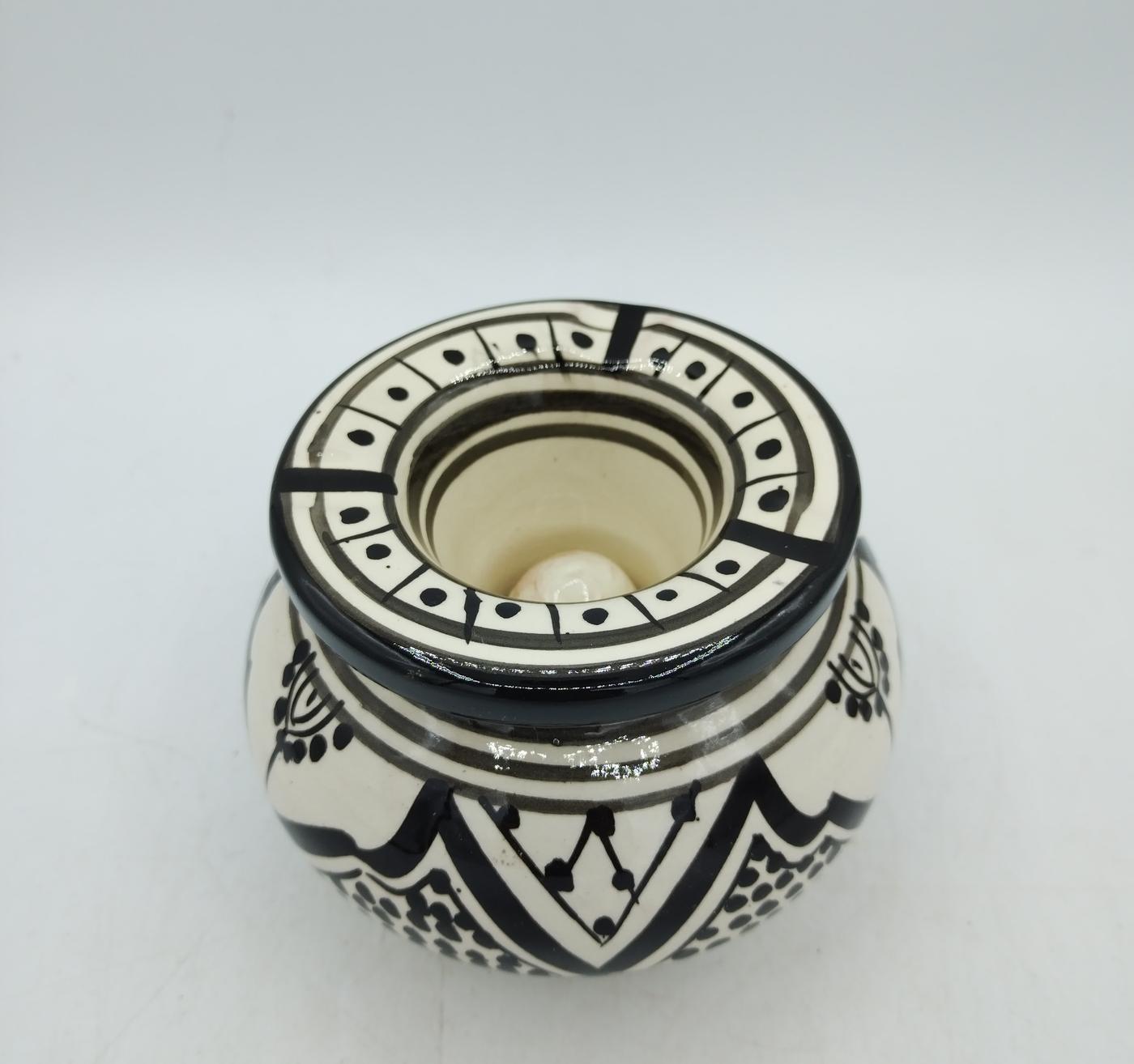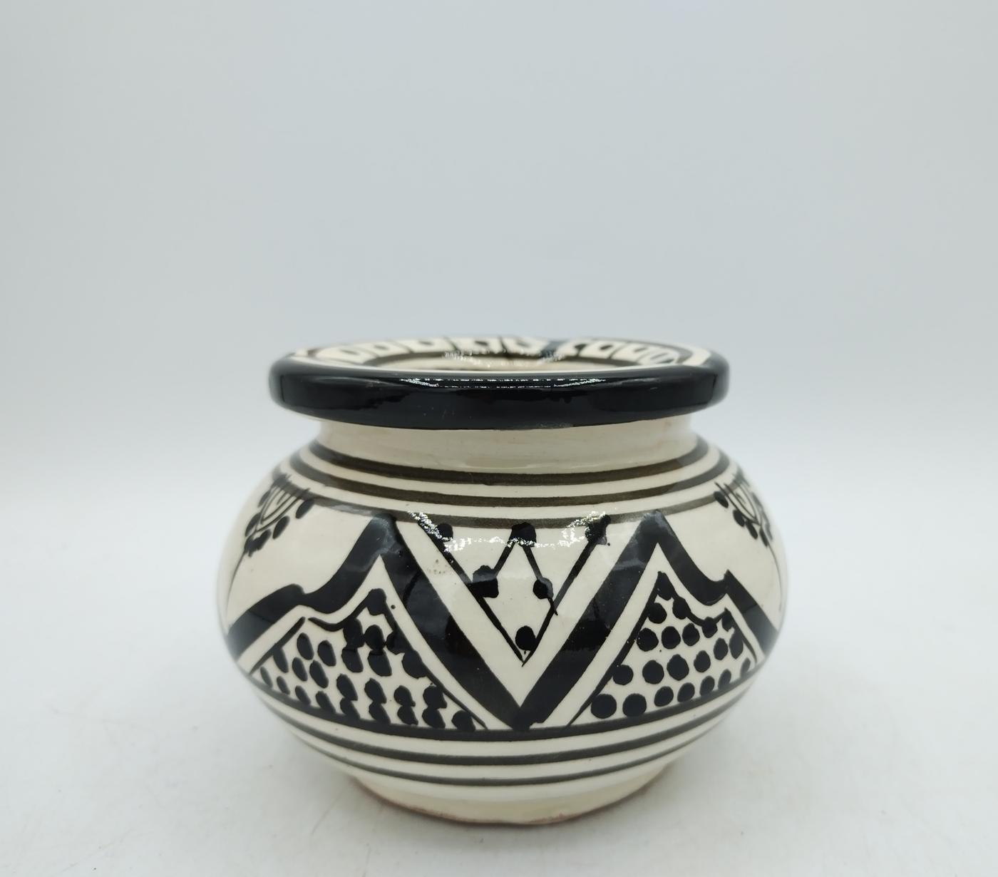 Posacenere in terracotta smaltata con decori geometrici bianchi e neri realizzato artigianalmente in Marocco