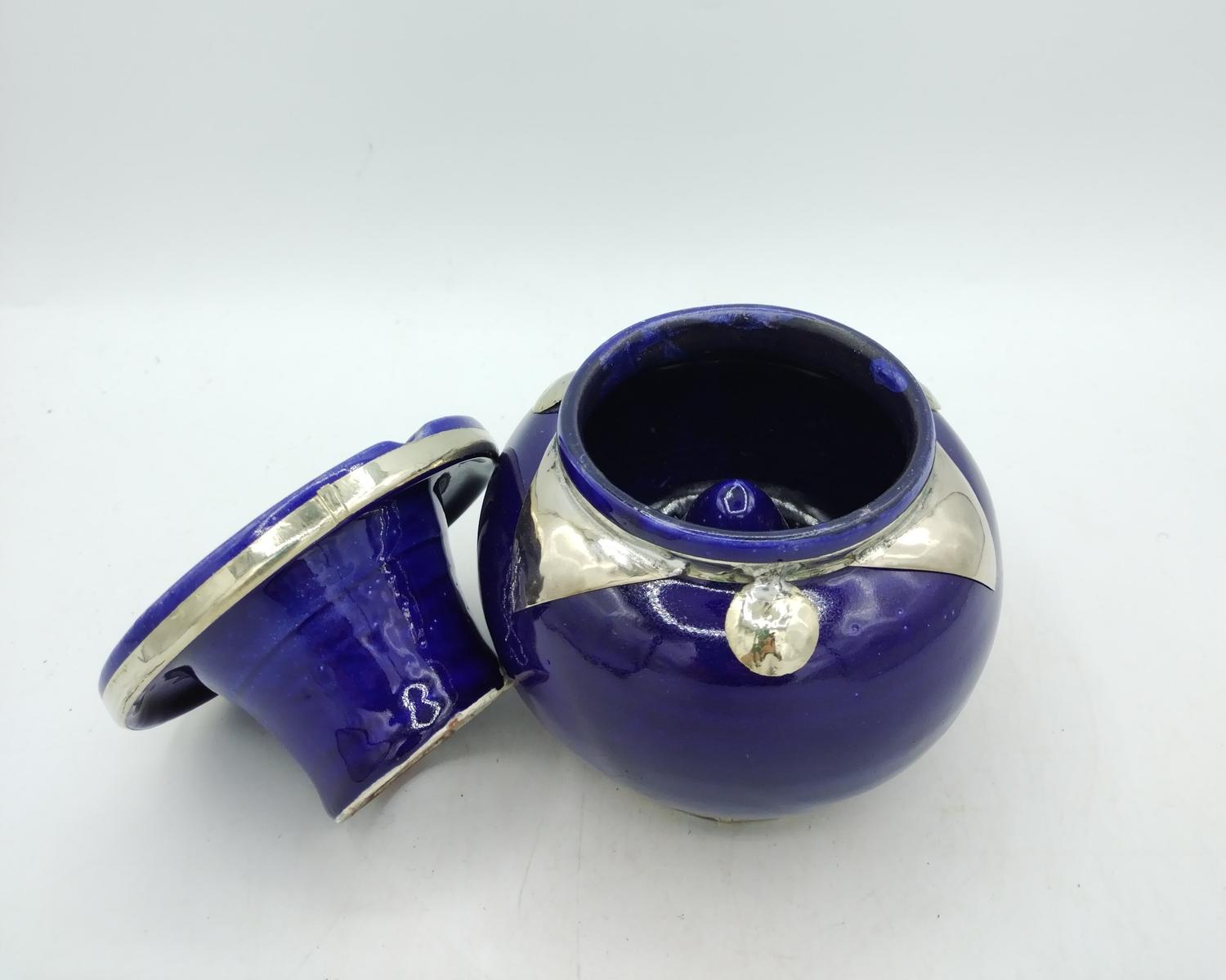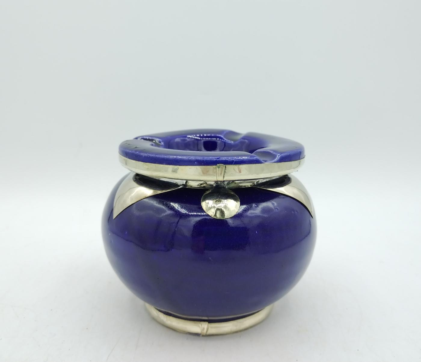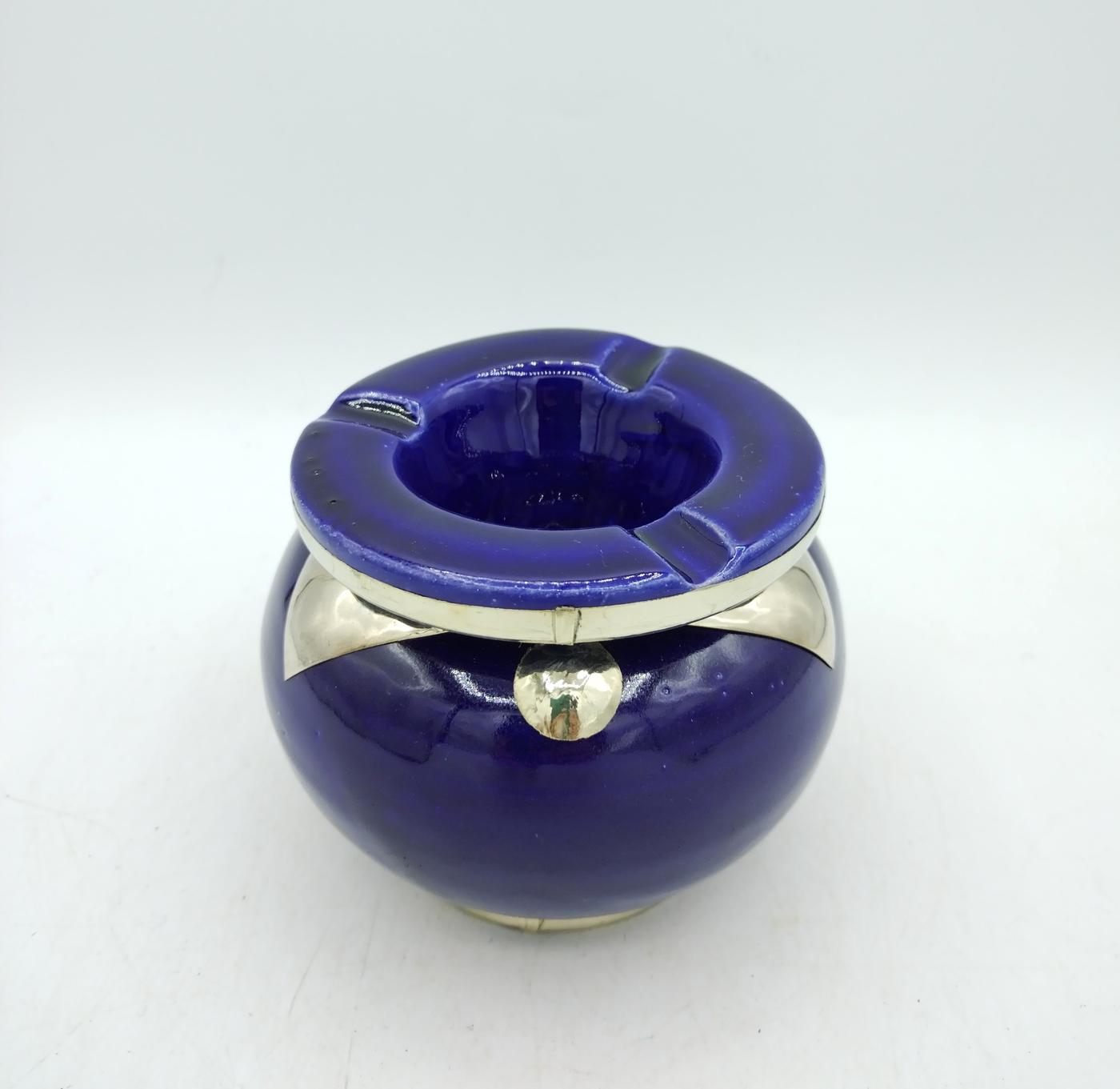Posacenere in terracotta smaltata blu con decorazioni in argentone, realizzato artigianalmente in Marocco