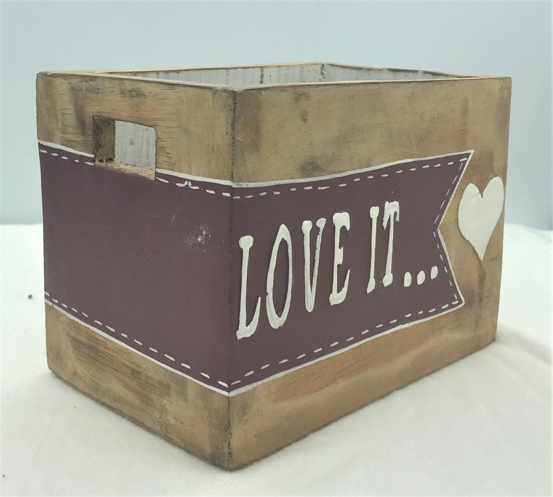 Scatola da utilizzare come contenitore aperto, realizzata in legno artigianalmente in Indonesia, dipinte a mano con la scritta “love it” su sfondo bordeaux