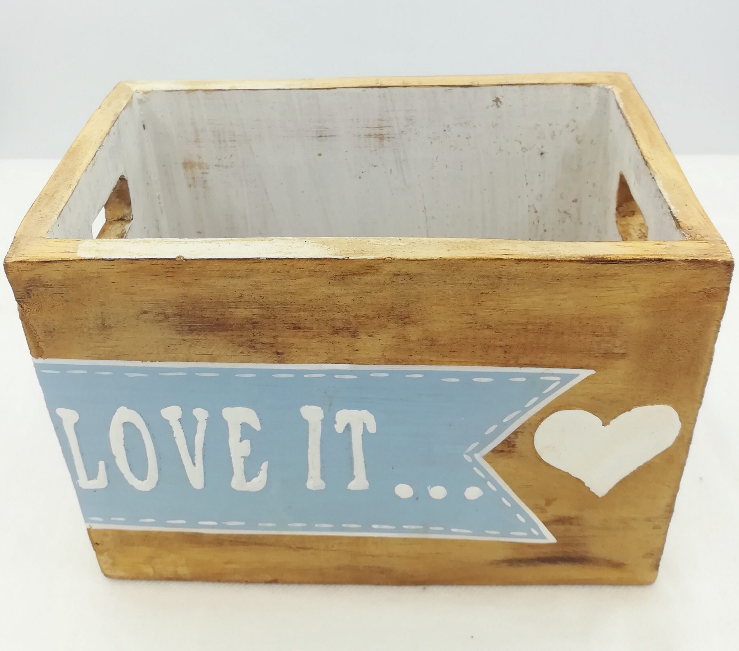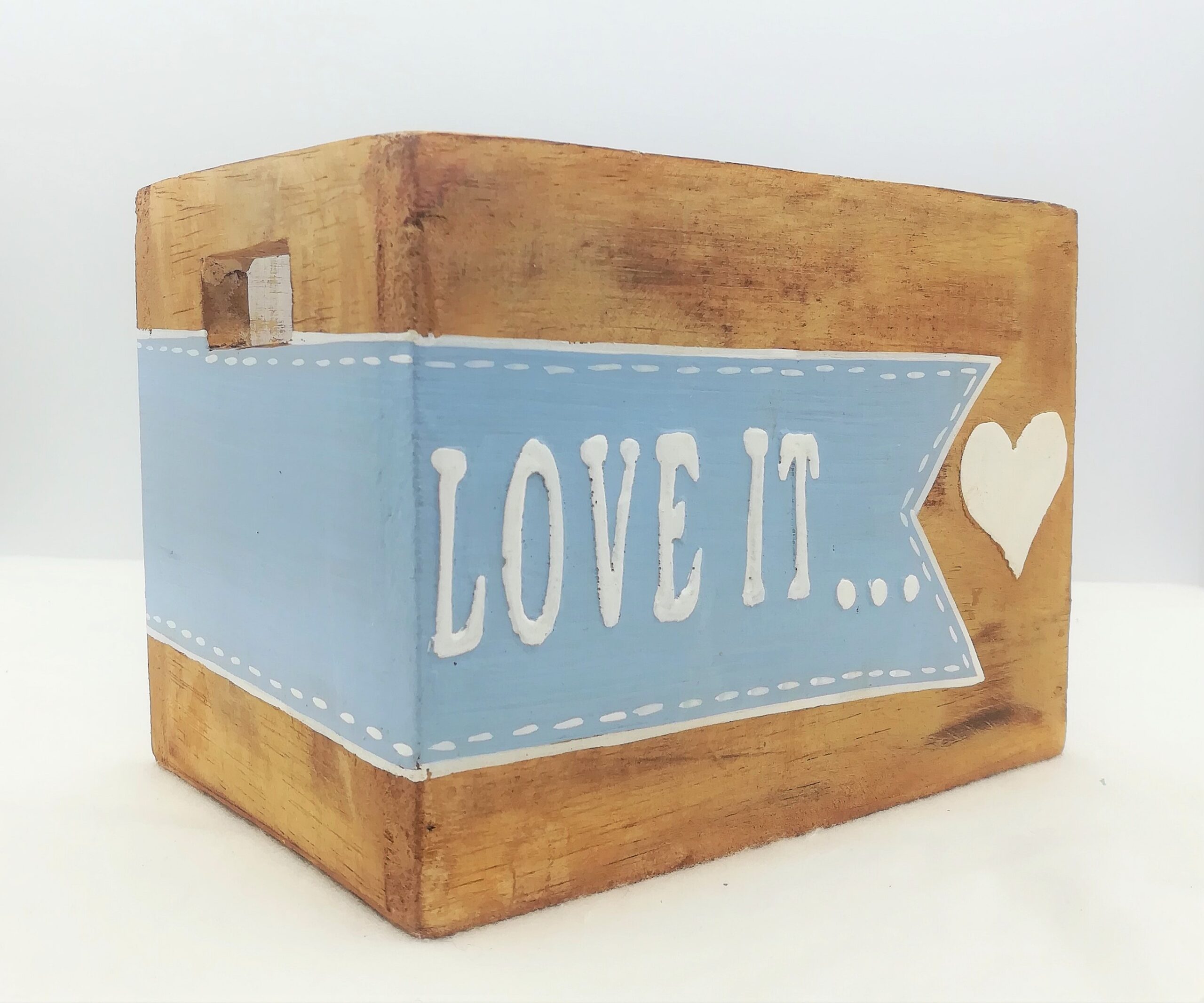 Scatola da utilizzare come contenitore aperto, realizzata in legno artigianalmente in Indonesia,dipinte a mano con la scritta “love it” su sfondo azzurro