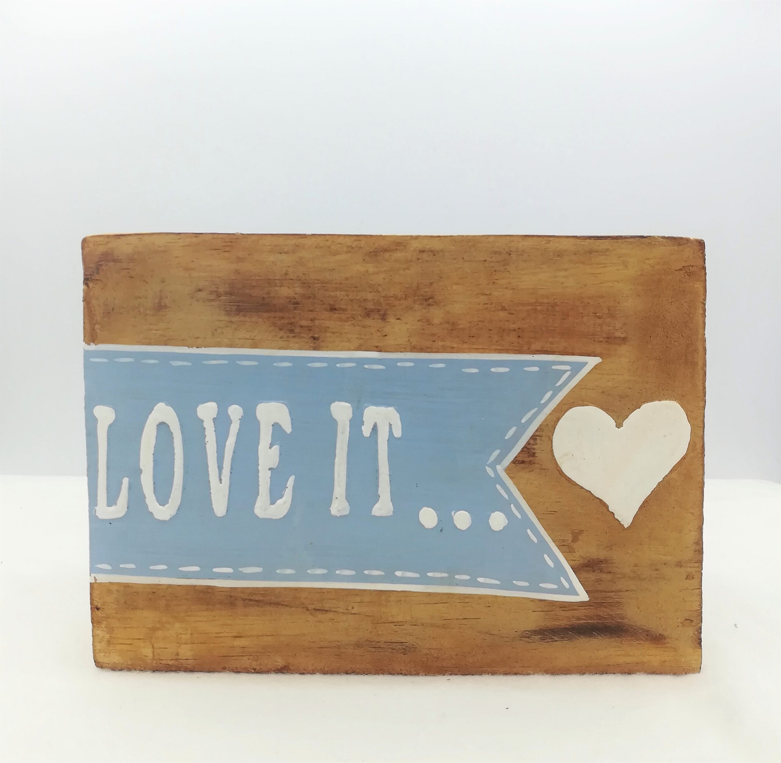 Sul lato frontale della scatola spicca la scritta “Love It” dipinta a mano, con un carattere fluido e accattivante. La scritta è posta su uno sfondo azzurro che crea un contrasto piacevole e luminoso, rendendo l’intera scatola visivamente interessante.