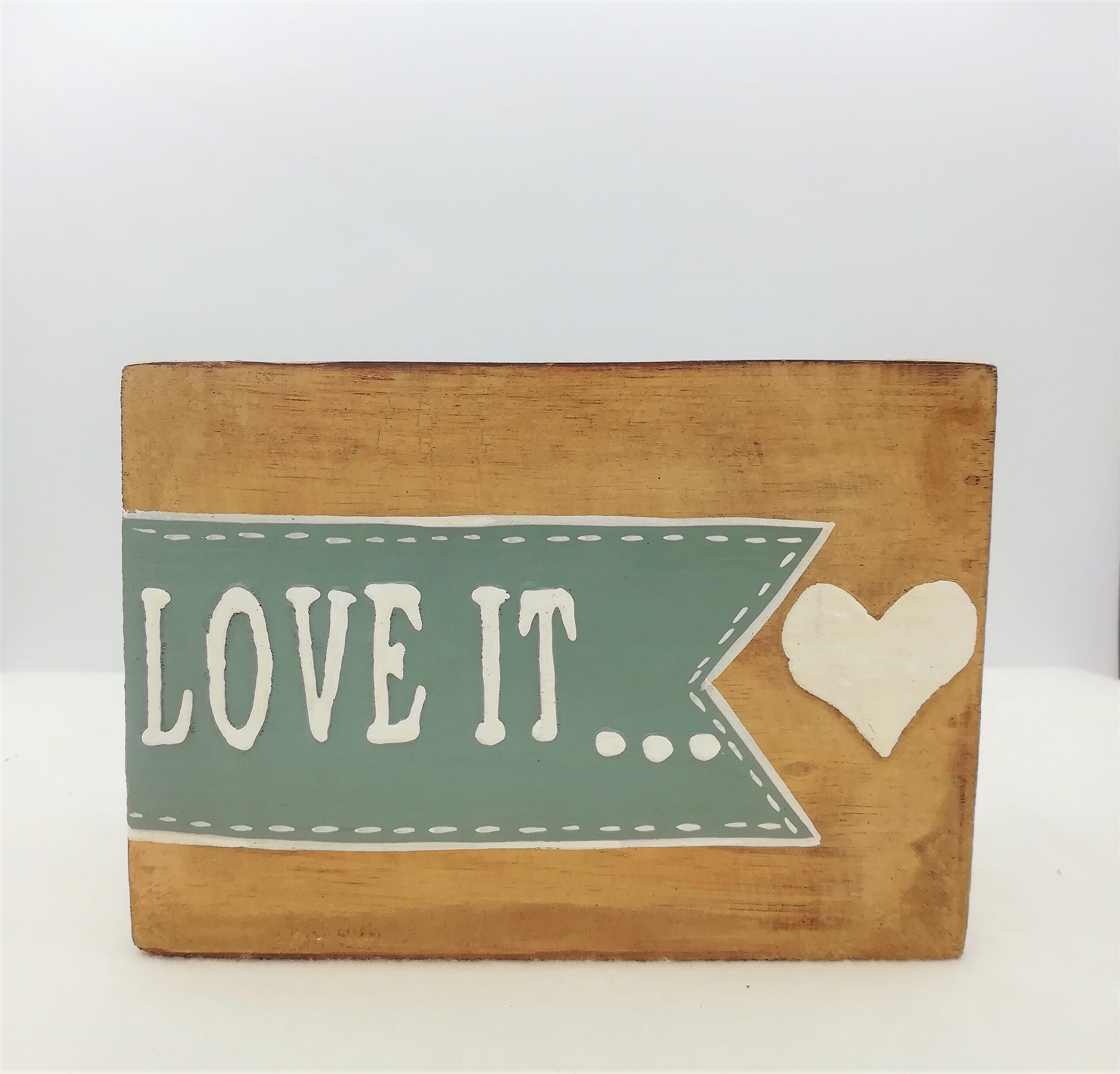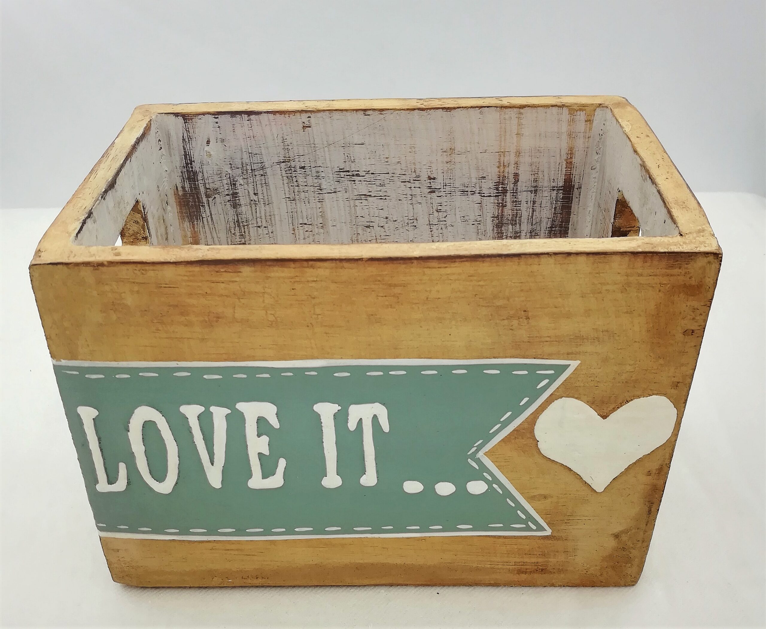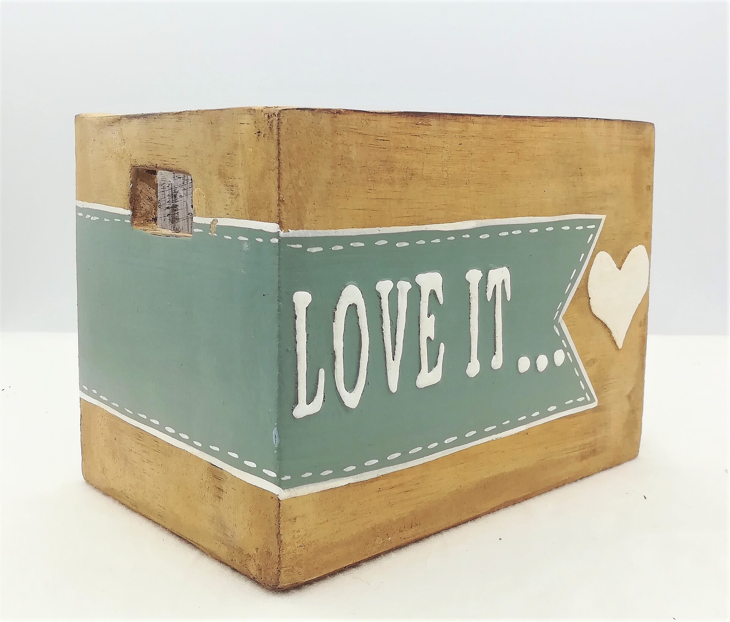 Scatola da utilizzare come contenitore aperto, realizzata in legno artigianalmente in Indonesia,dipinte a mano con la scritta “love it” su sfondo verde salvia