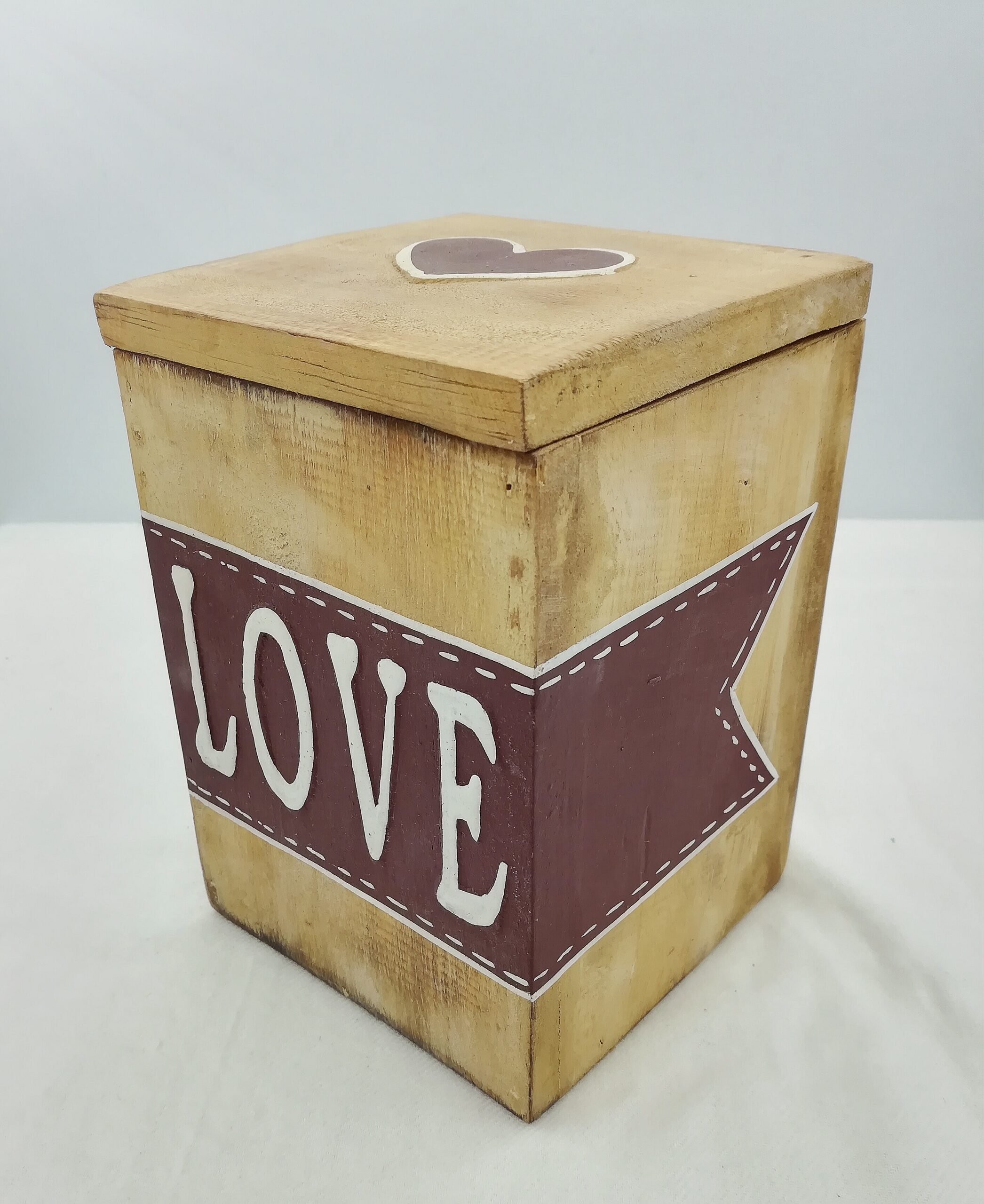 Scatola in legno con coperchio, realizzata artigianalmente in Indonesia, color naturale e bordeaux con scritta love