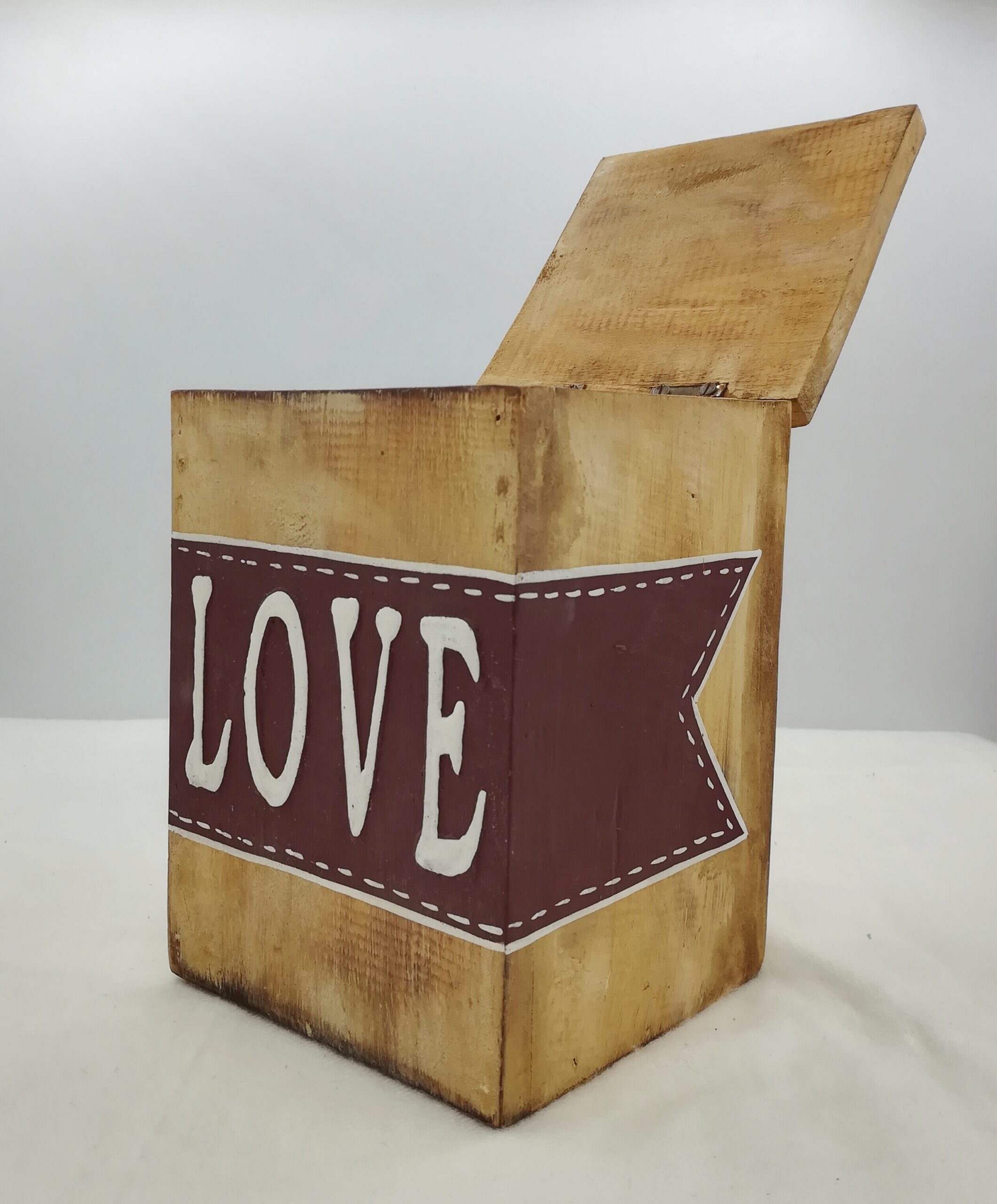 Ha una forma rettangolare con linee pulite e ben definite, lasciata al legno naturale che crea un meraviglioso contrasto con un tocco di bordeaux e bianco che le dona vivacità e luminosità. Il coperchio, anch’esso in legno, è rifinito da un disegno a cuore.
