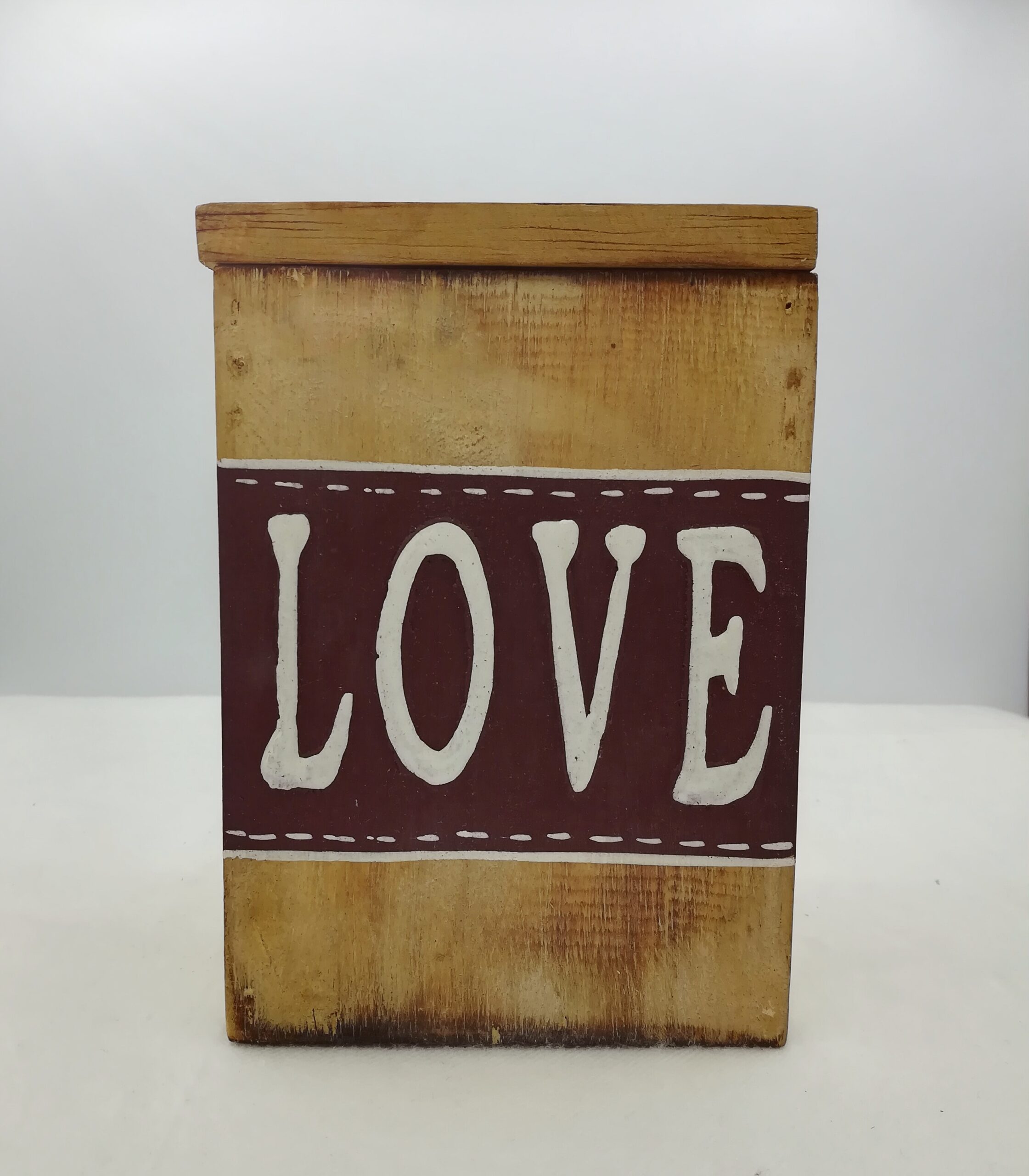 Al centro della scatola spicca la scritta “Love” in caratteri delicati, dipinta a mano.