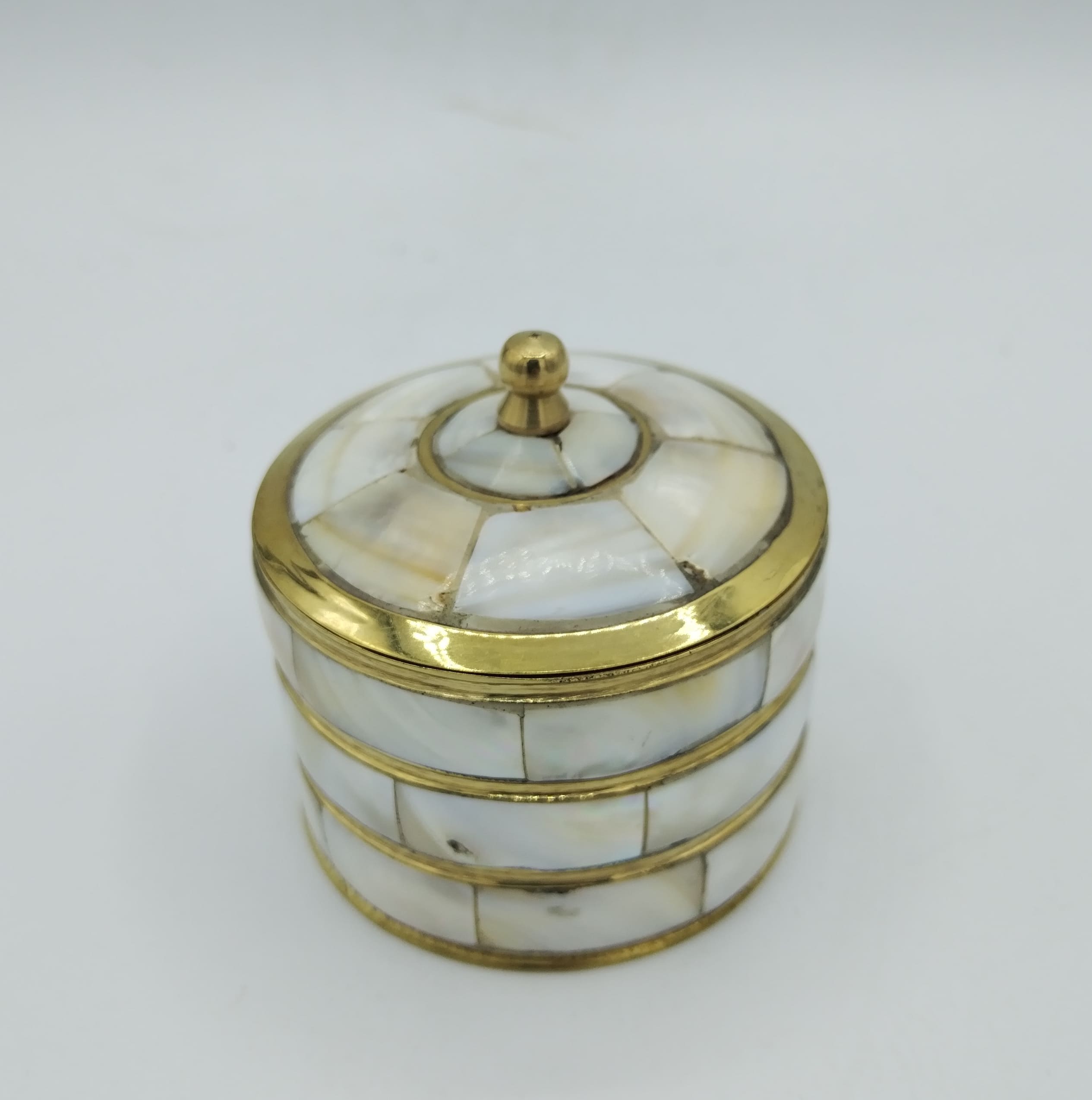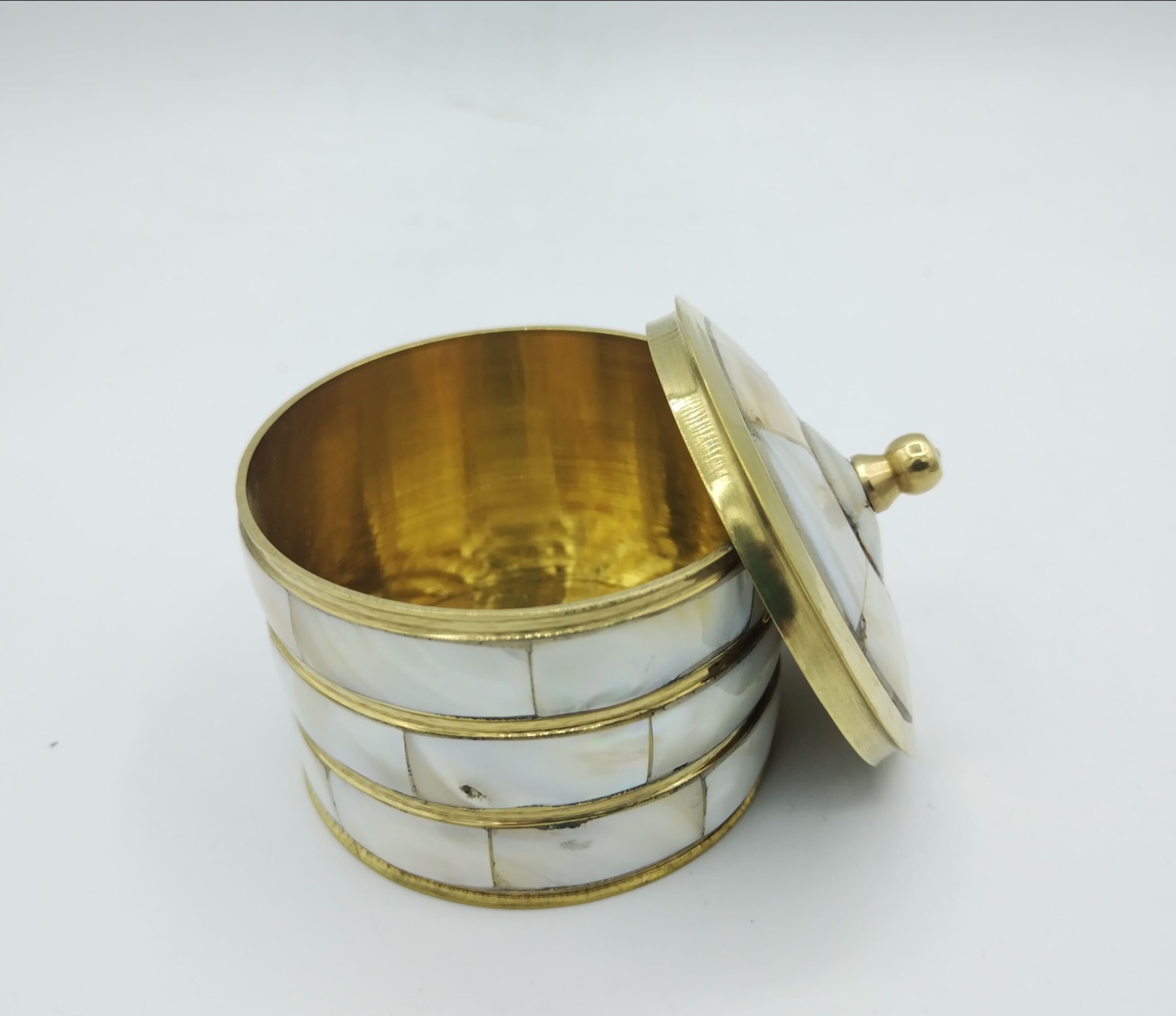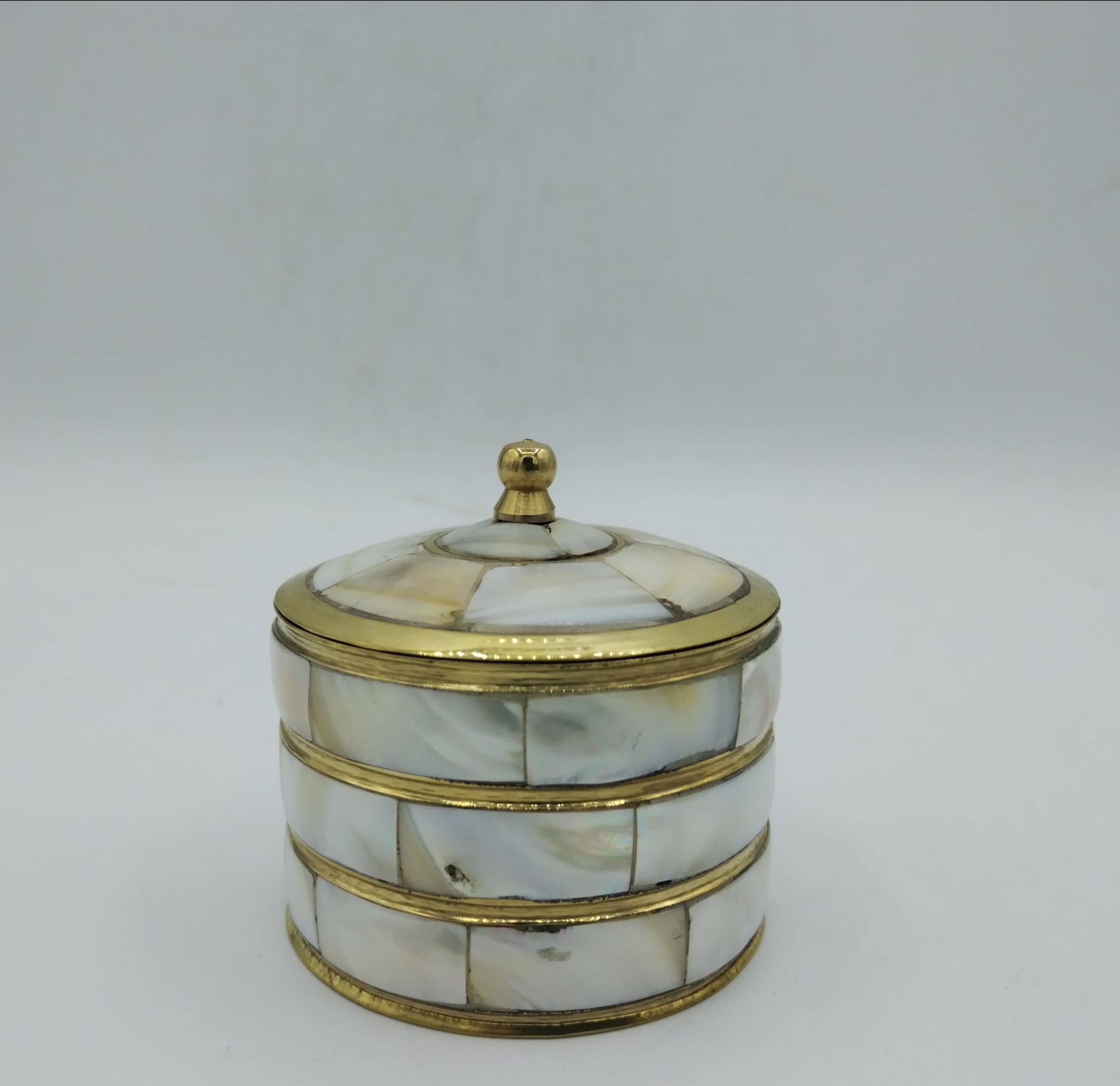 Scatola realizzata artigianalmente in Marocco, in metallo dorato impreziosito da inserti in madreperla