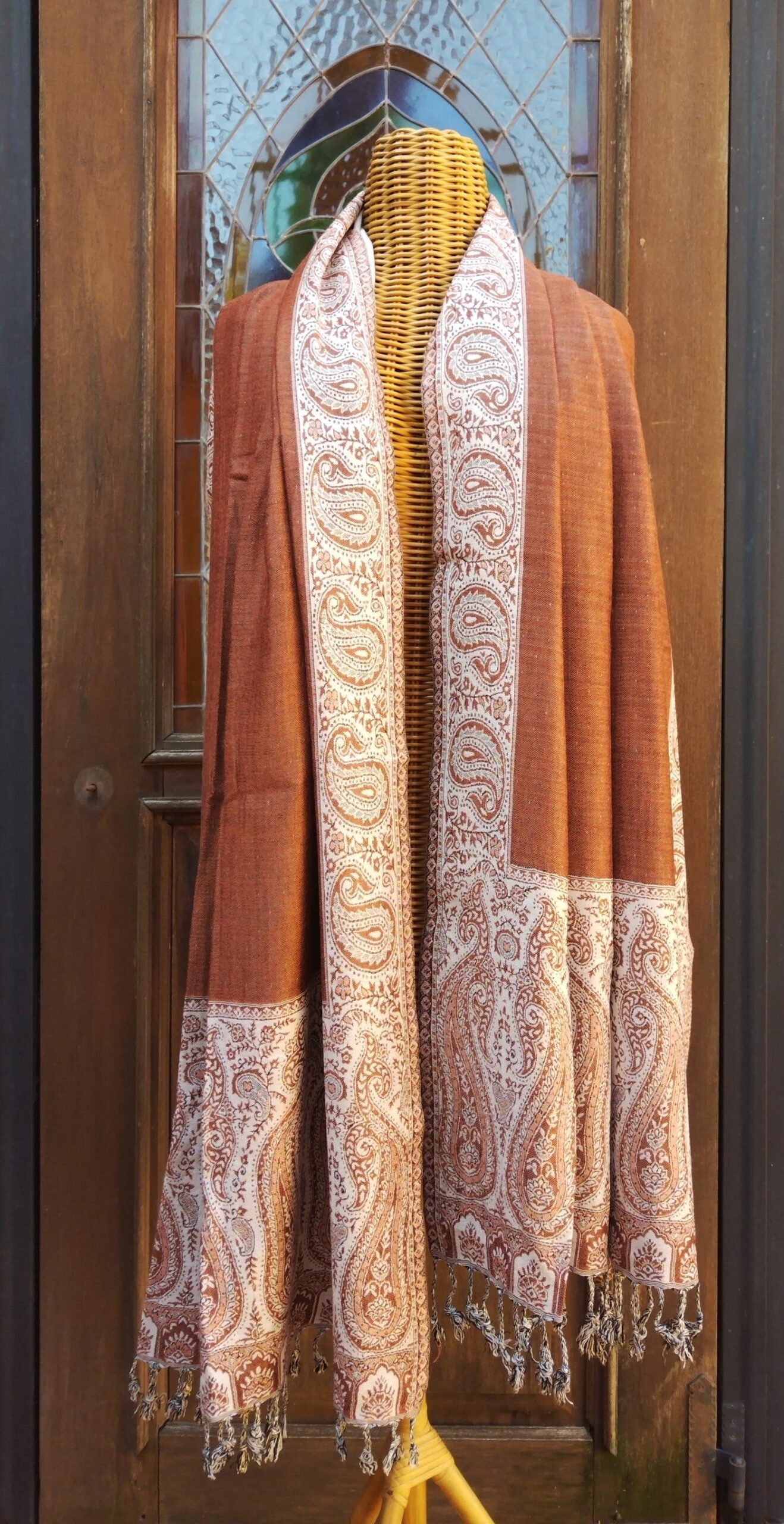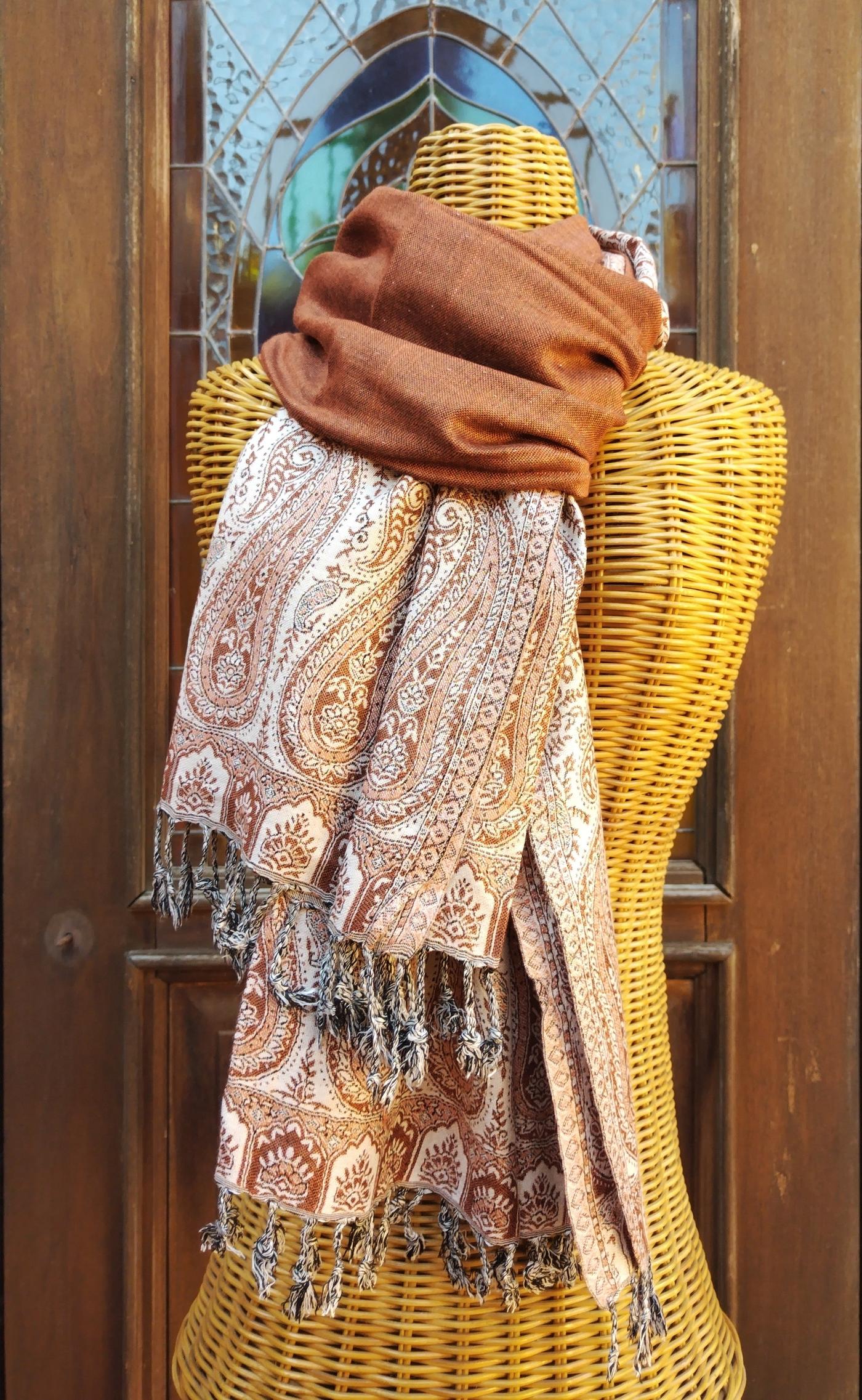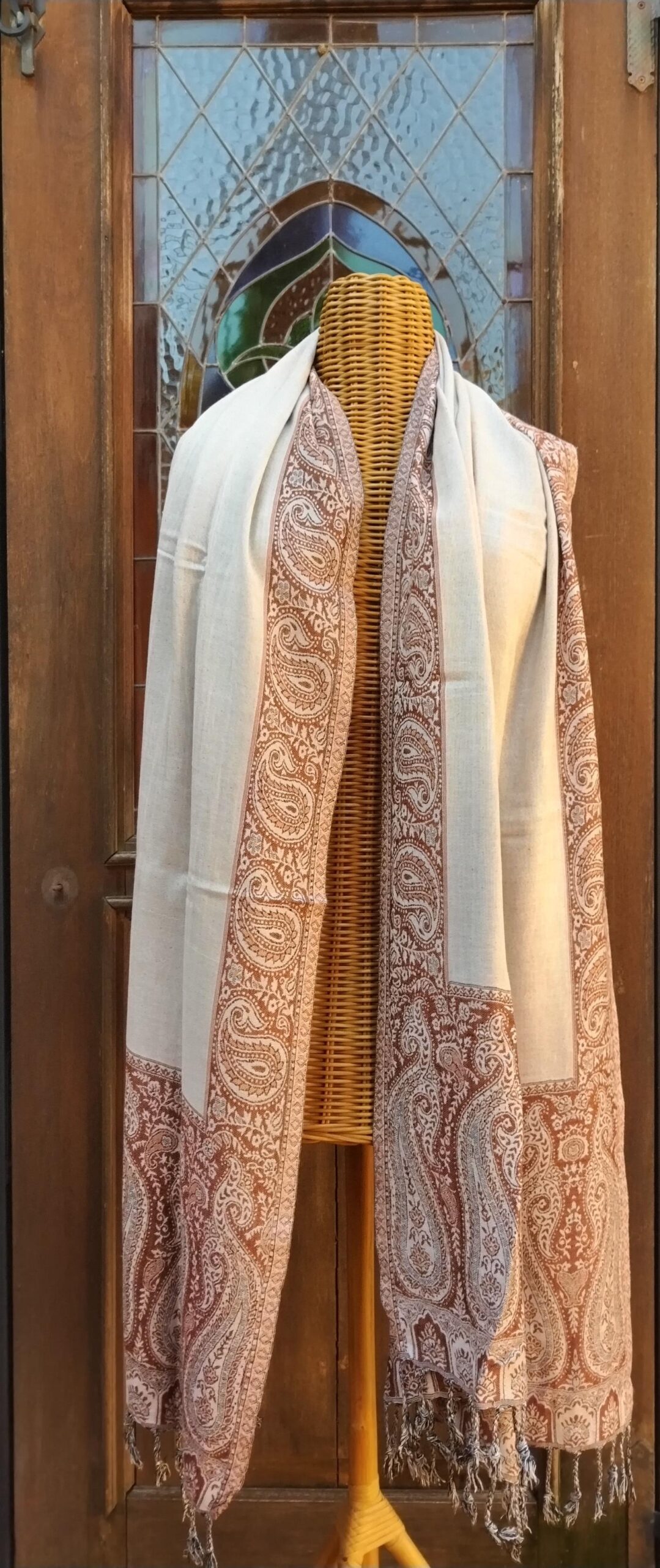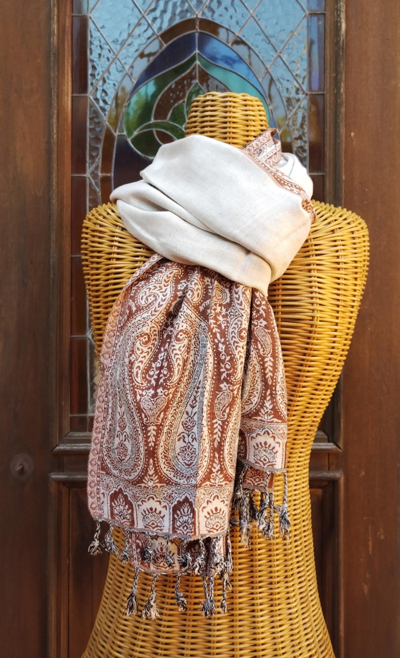 Sciarpa realizzata in India in cotone e seta double face color marrone e bianca con disegni cachemire lungo la fascia di contorno
