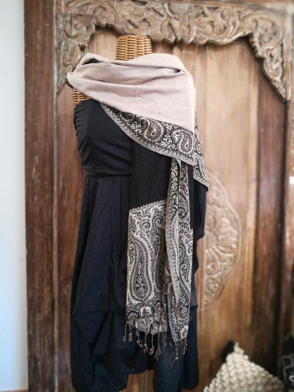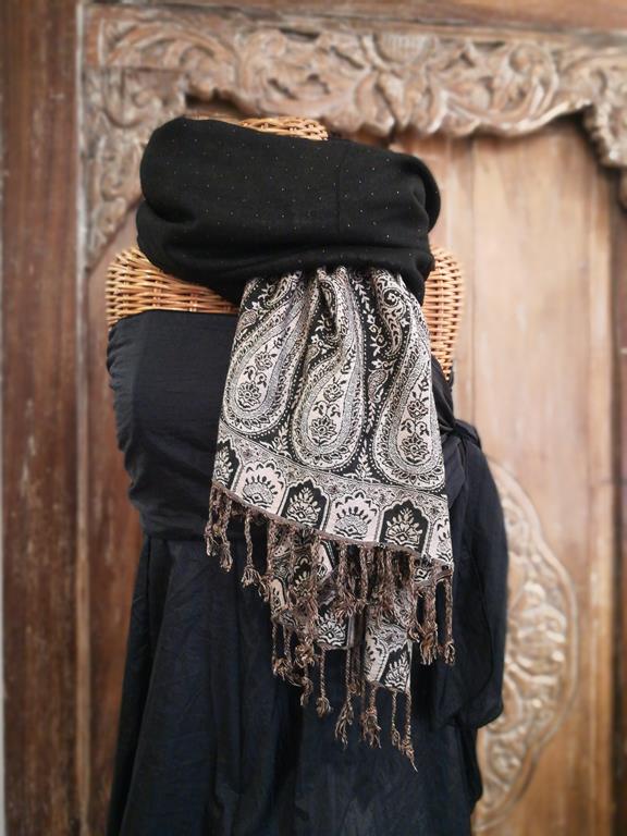 Sciarpa realizzata in India in cotone e seta double face color nero e oro con disegni cachemire lungo la fascia di contorno