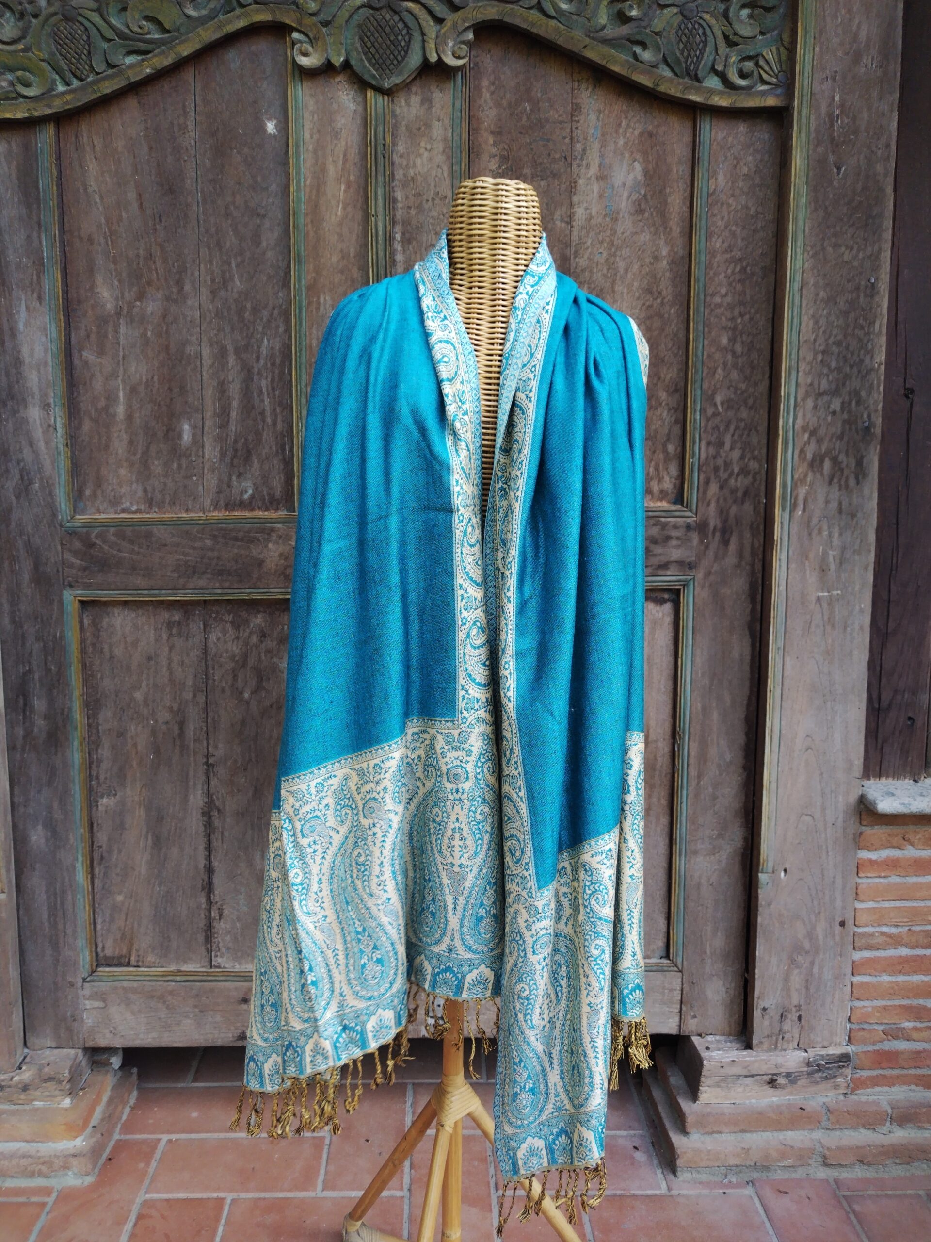 La bellezza di questo modello è data dall’intensità dei suoi colori, dal modello “chiaro scuro” ovvero double face, da una parte verde acqua e dall’altra dorato, e dalla ricchezza del suo disegno, a tinta unita al centro ma in stile cachemire lungo tutta la fascia di contorno, andandosi ad ingrandire in corrispondenza delle frange.