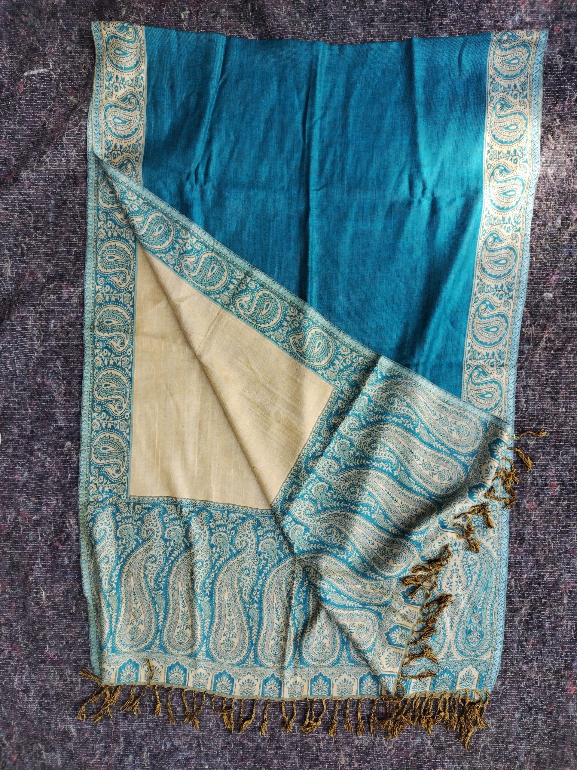 Sciarpa realizzata in India in cotone e seta double face color turchese acceso e oro con disegni cachemire lungo la fascia di contorno