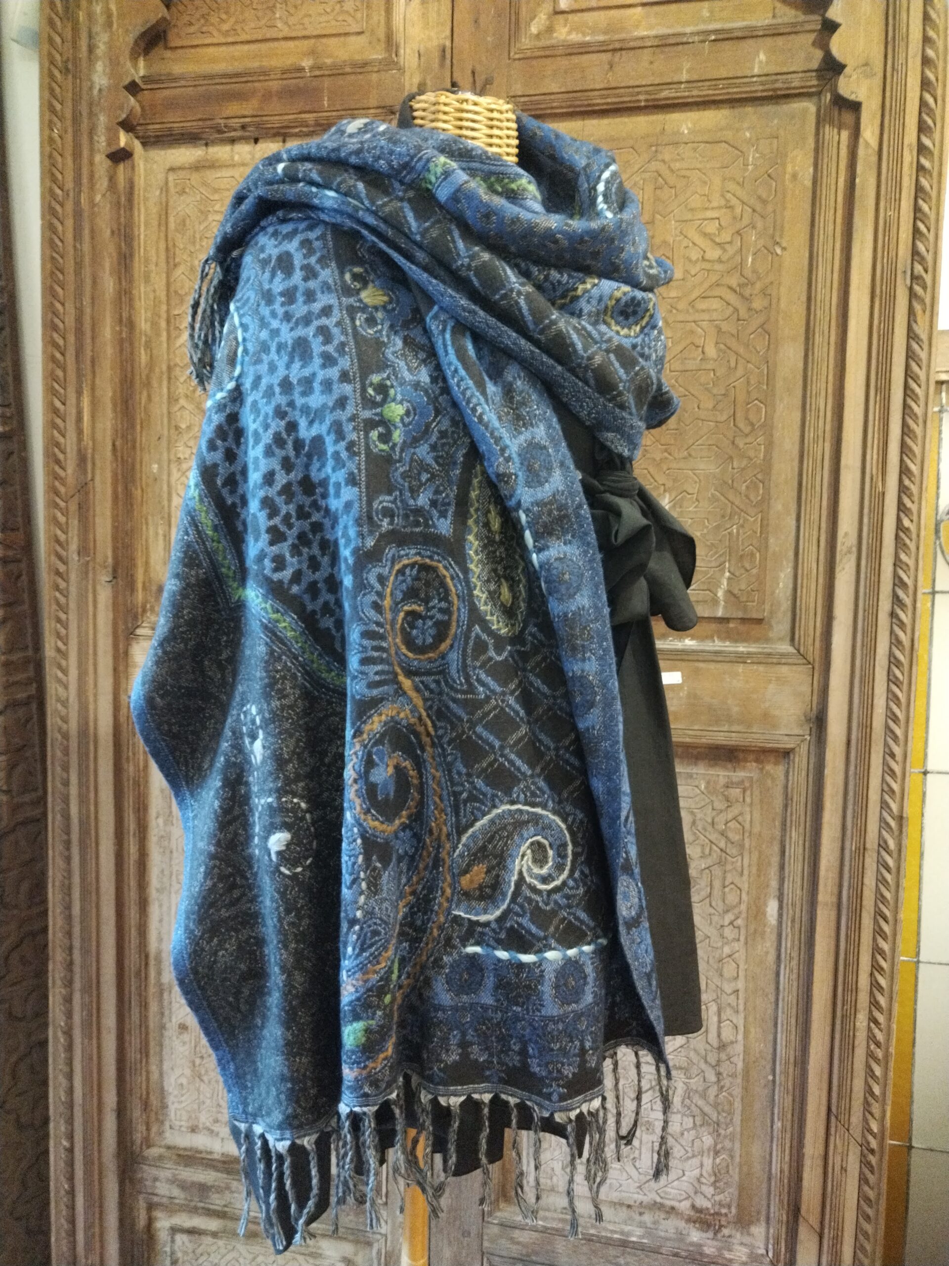 Il design è caratterizzato da motivi cachemire, tipici dell’arte tessile orientale, che donano alla sciarpa un fascino senza tempo. A impreziosire ulteriormente il tessuto vi sono ricami realizzati con fili di lana grossi, che creano un effetto tridimensionale e conferiscono profondità e ricchezza alla trama. La palette cromatica gioca sui toni del blu e nero, combinando nuance intense e raffinate.