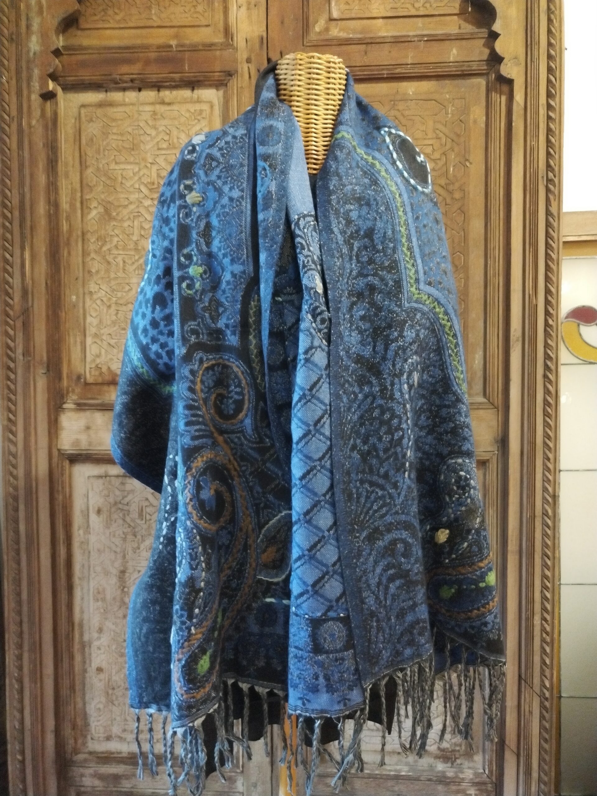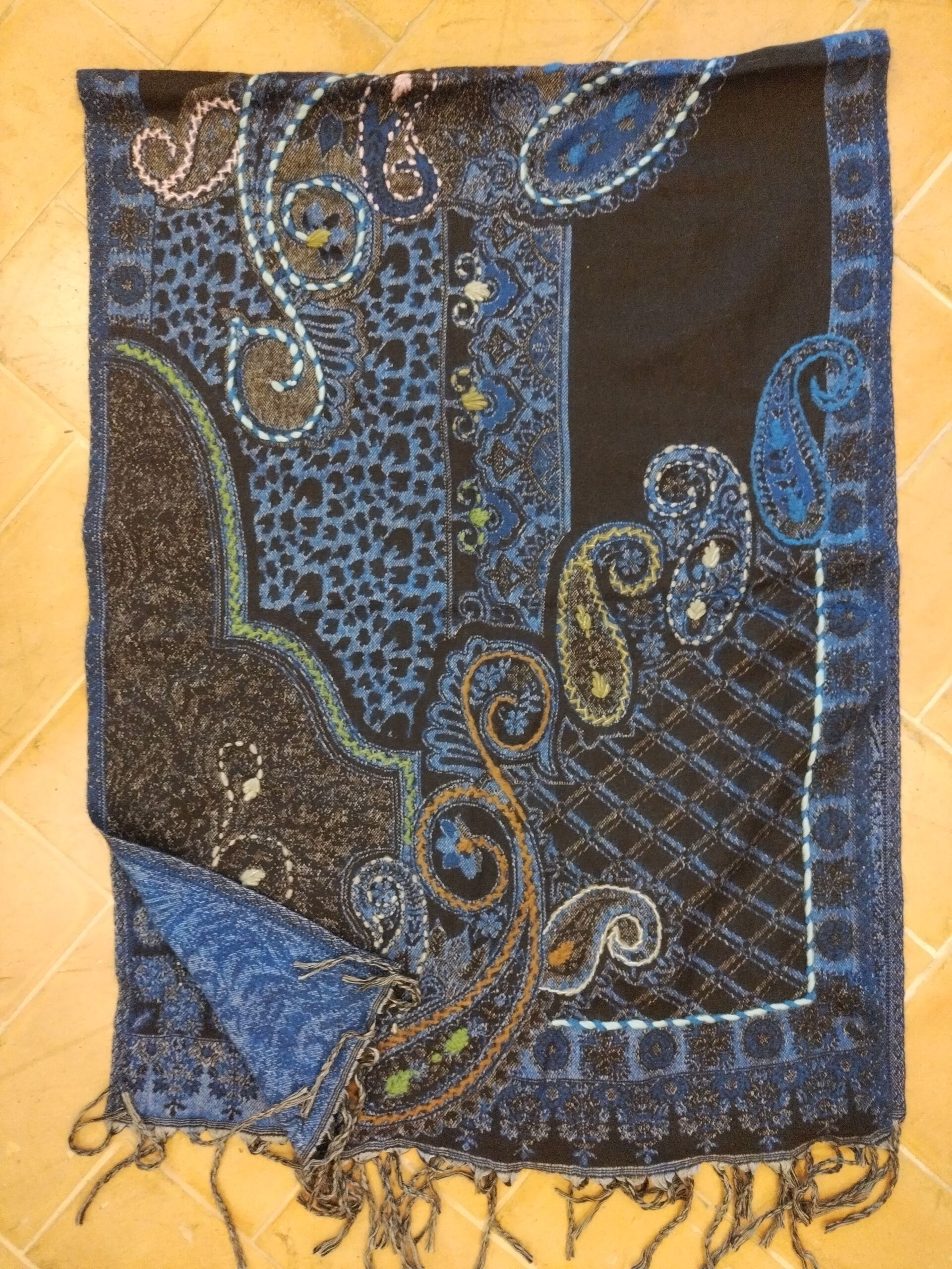 Sciarpa indiana grande in cachemire e lana con disegni cachemire, con ricami fatti con fili di lana grossi sui toni del blu, nero e un tocco di verde e arancio; double face sui toni più chiari