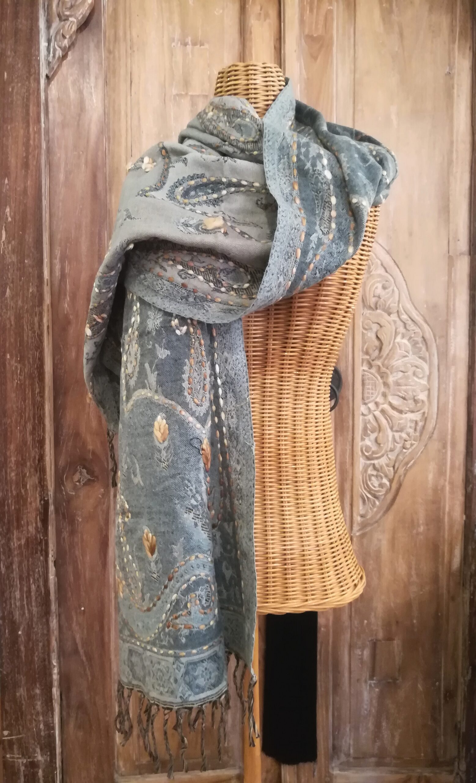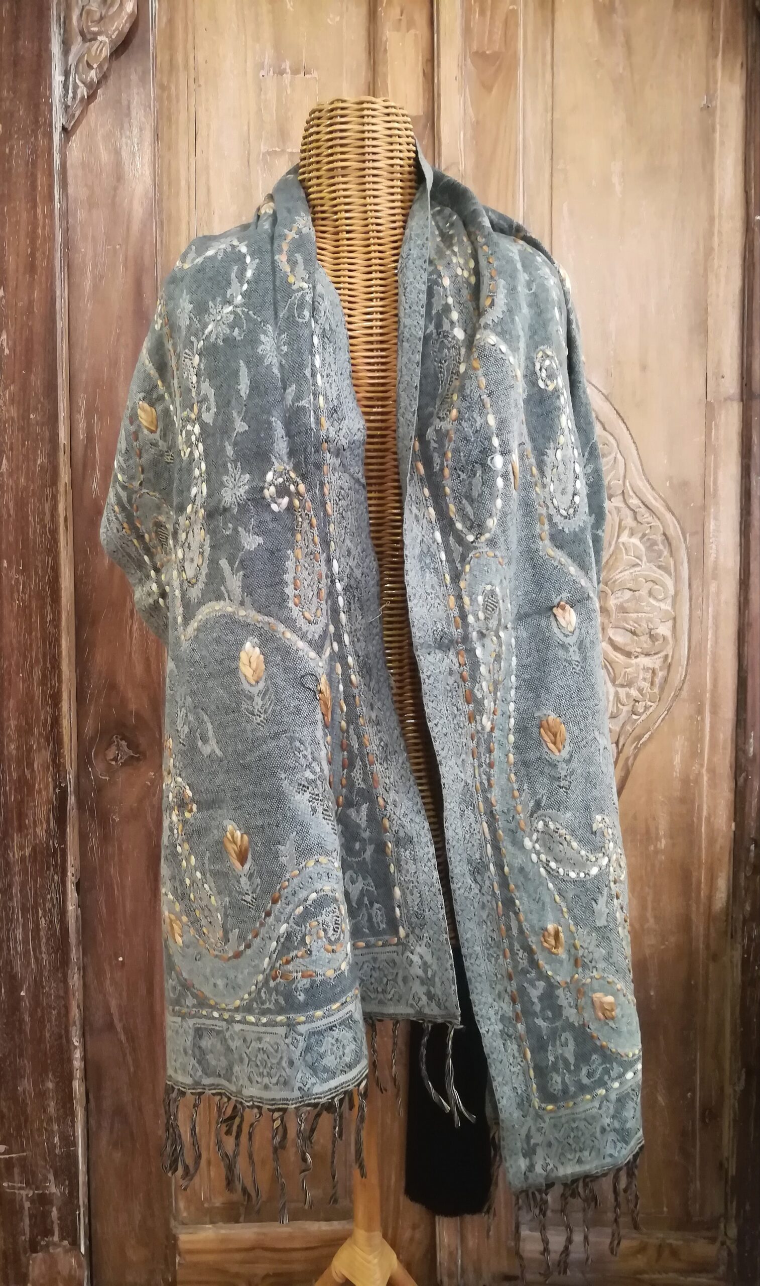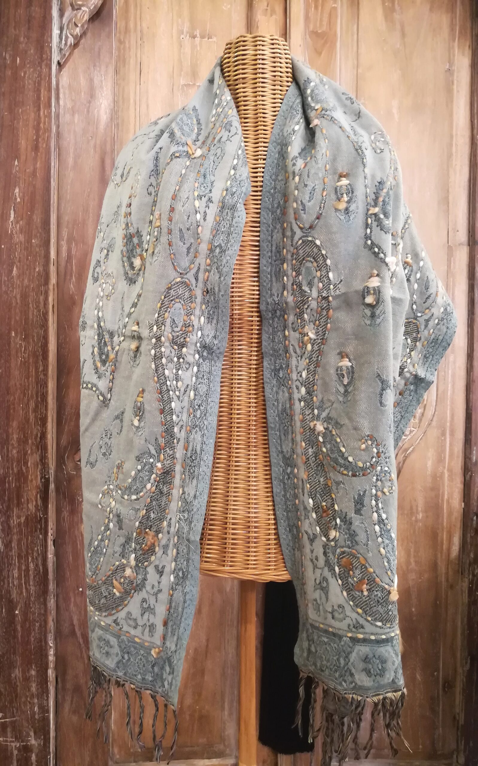Sciarpa indiana grande in cachemire e lana con disegni cachemire, con ricami fatti con fili di lana grossi sui toni del beige, double face color carta da zucchero e grigia