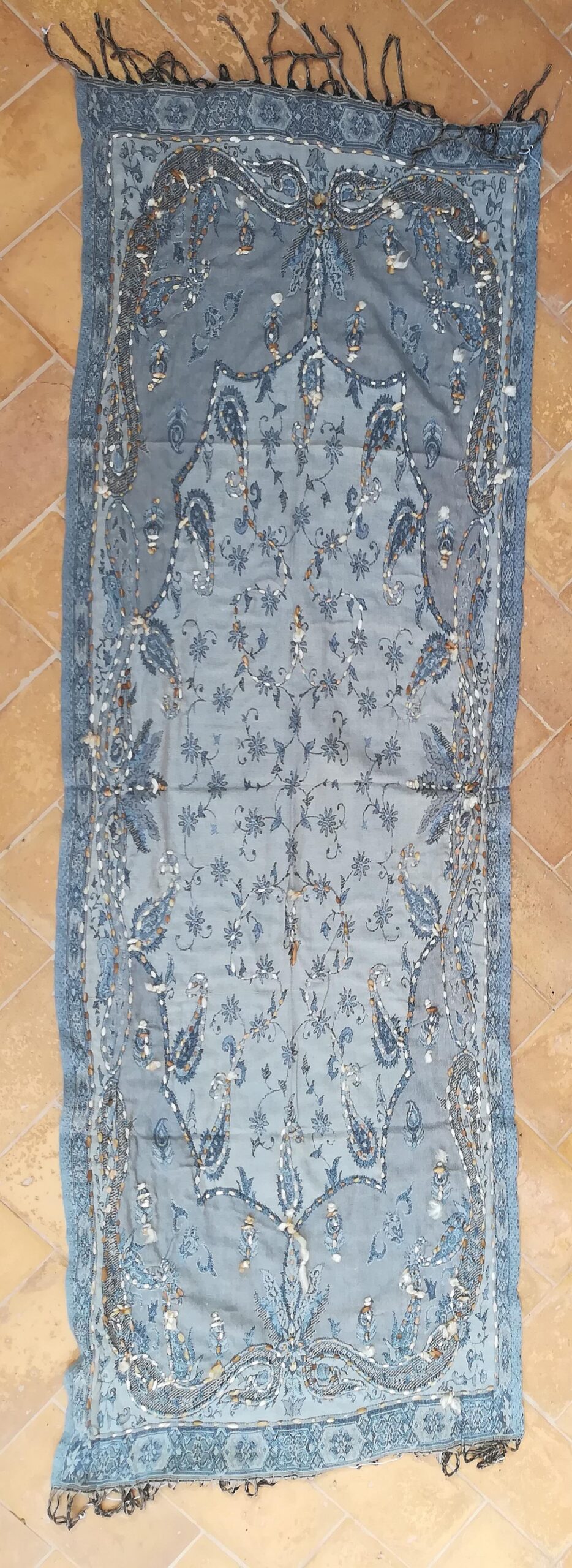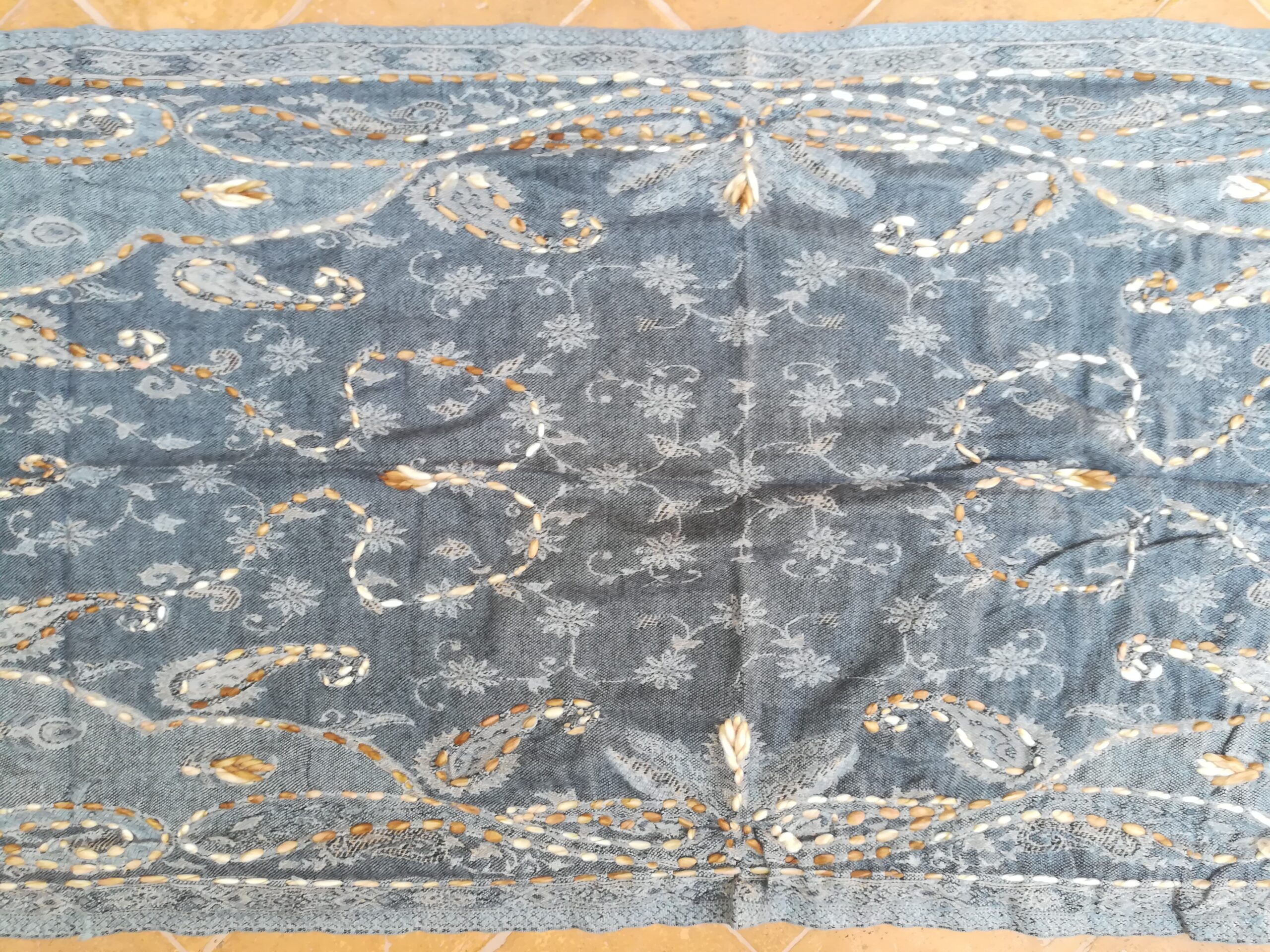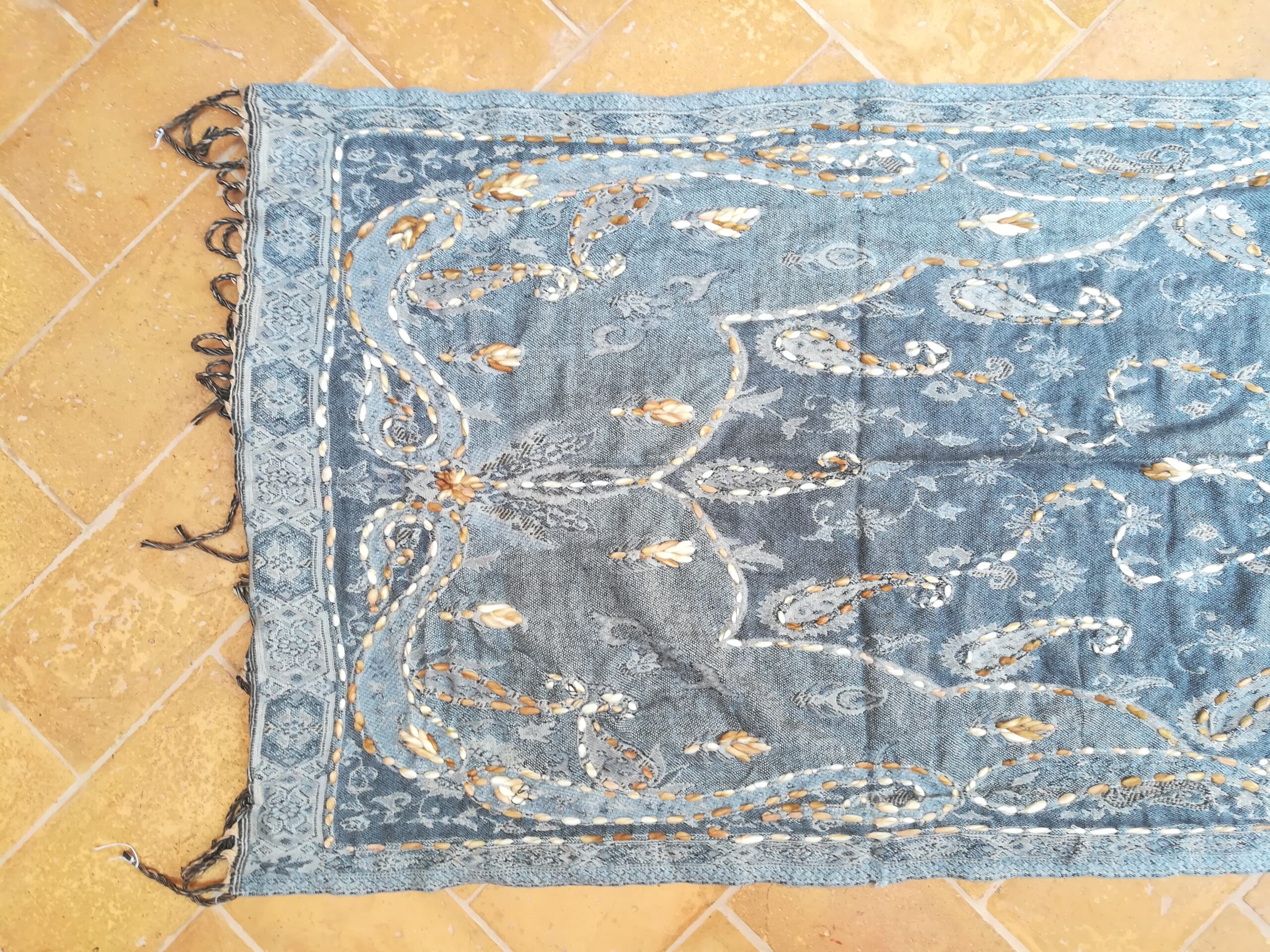 Sciarpa indiana grande in cachemire e lana con disegni cachemire, con ricami fatti con fili di lana grossi sui toni del beige, double face color carta da zucchero e grigia