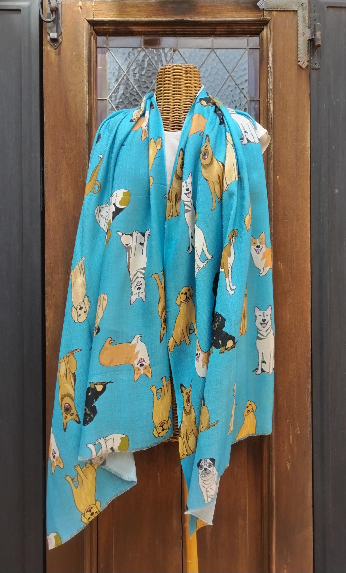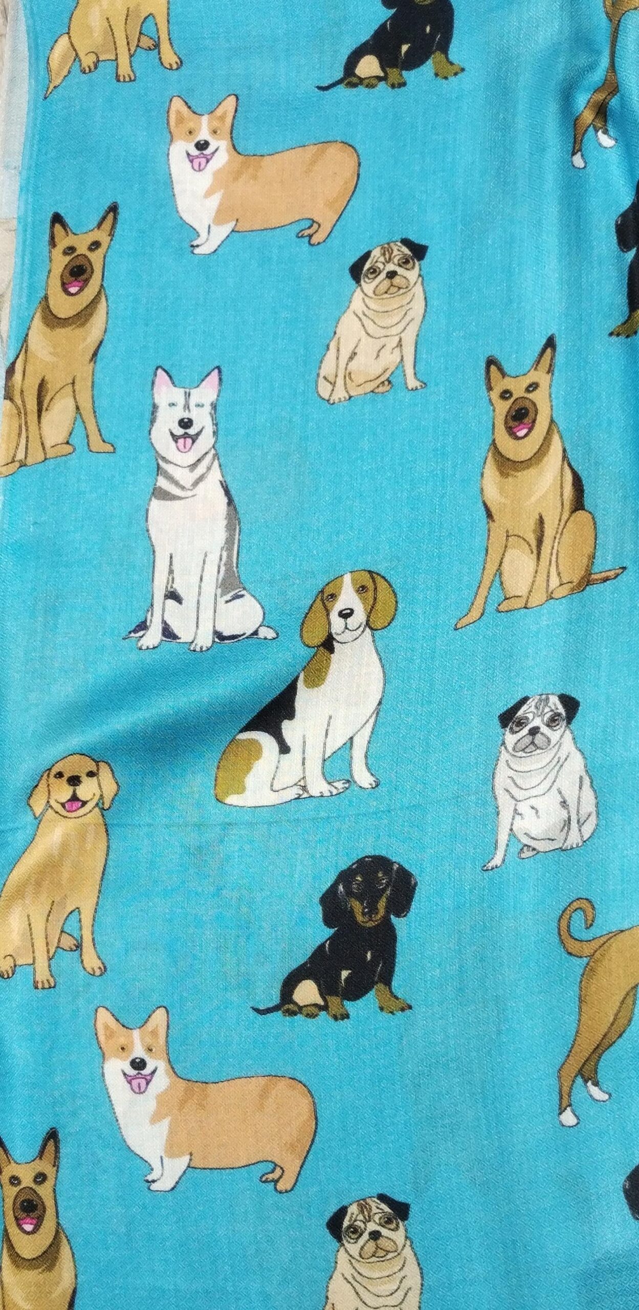 Sciarpa realizzata in India in modal color azzurro, con disegni di cani