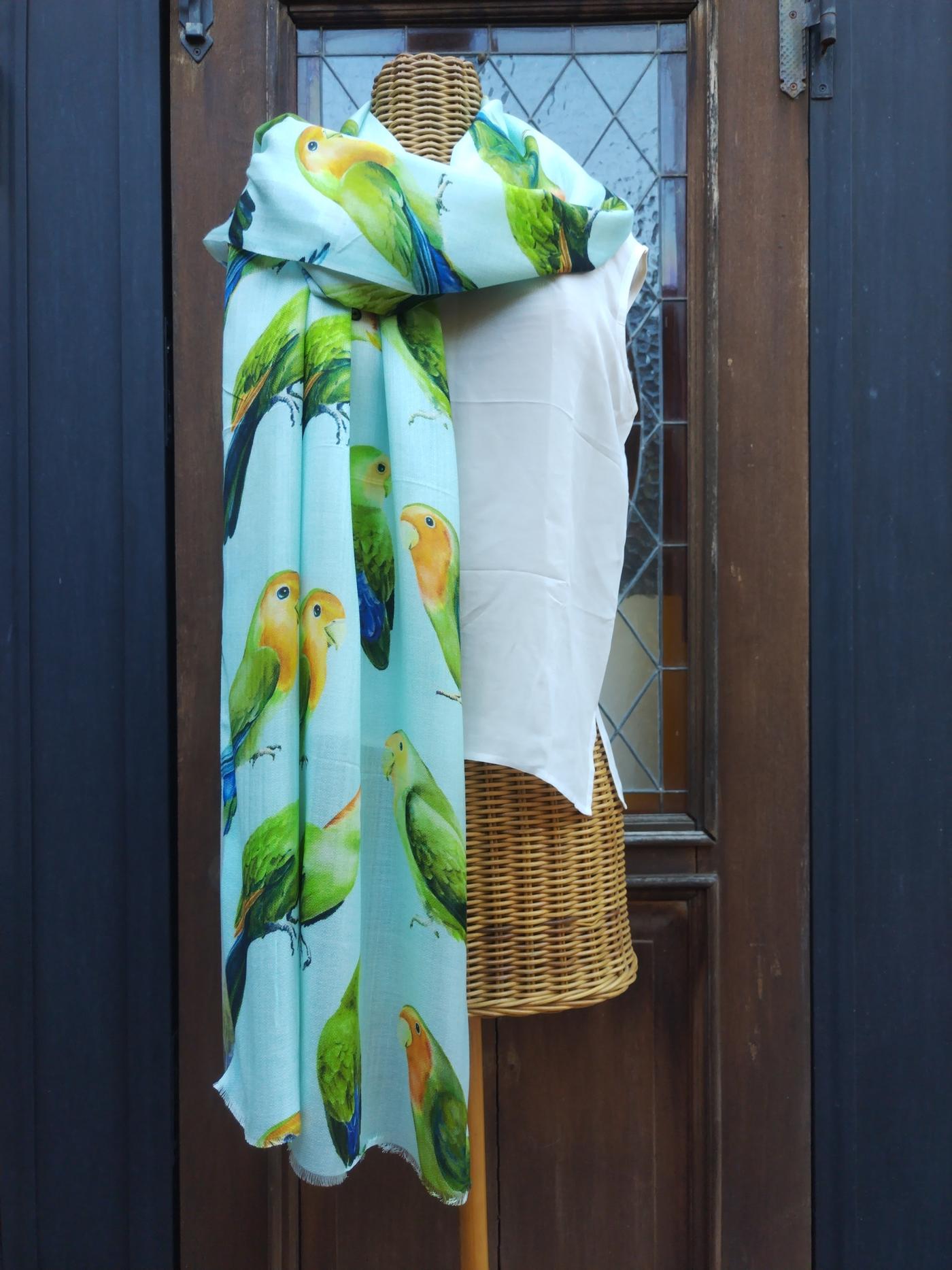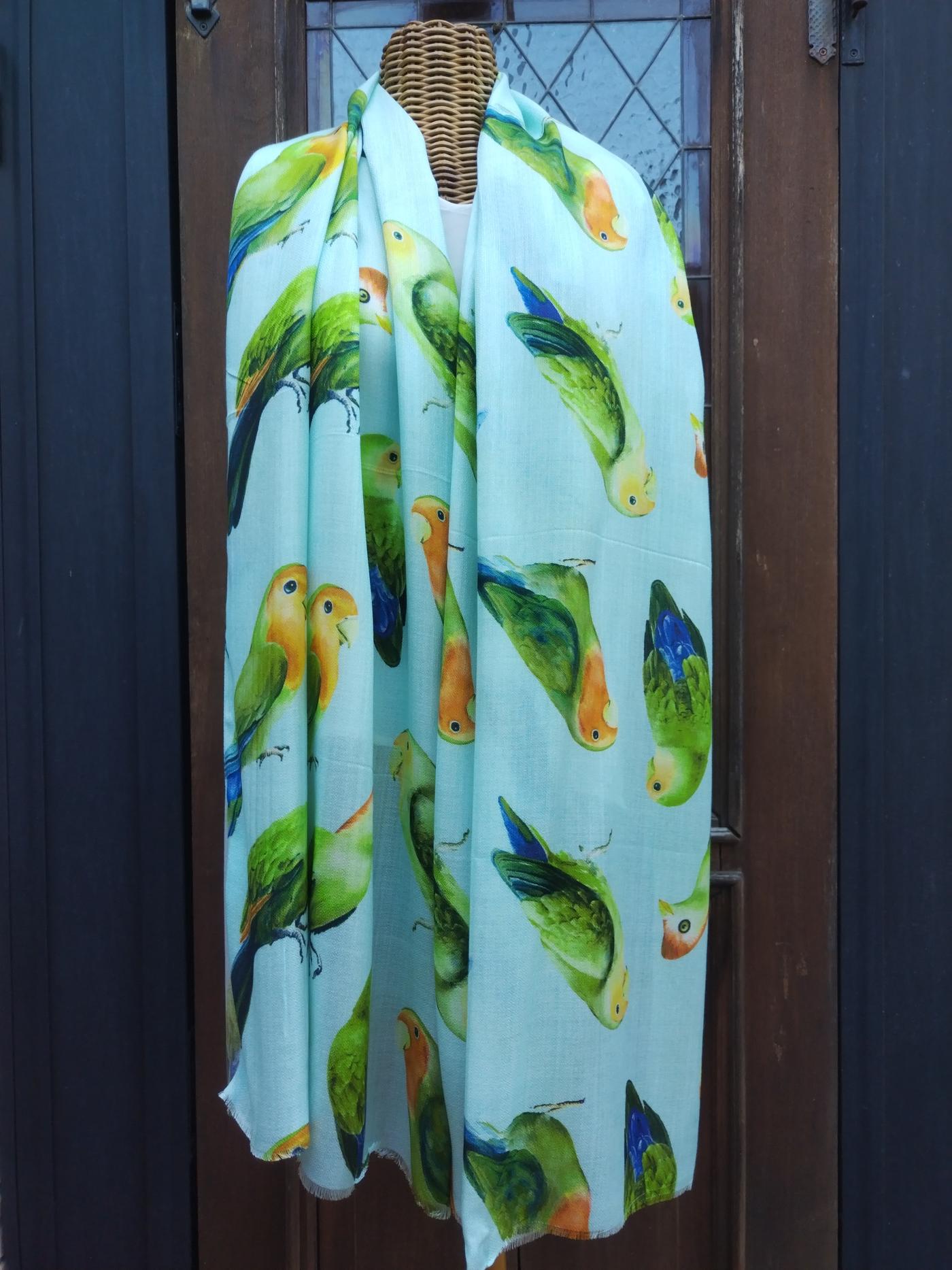Sciarpa realizzata in India in modal color verde acqua chiaro, con disegni di pappagalli