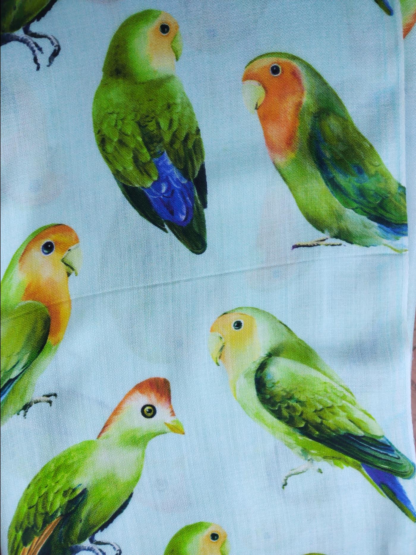 A renderla unica sono i deliziosi disegni di pappagalli lungo il tessuto, aggiungendo un tocco giocoso e originale.