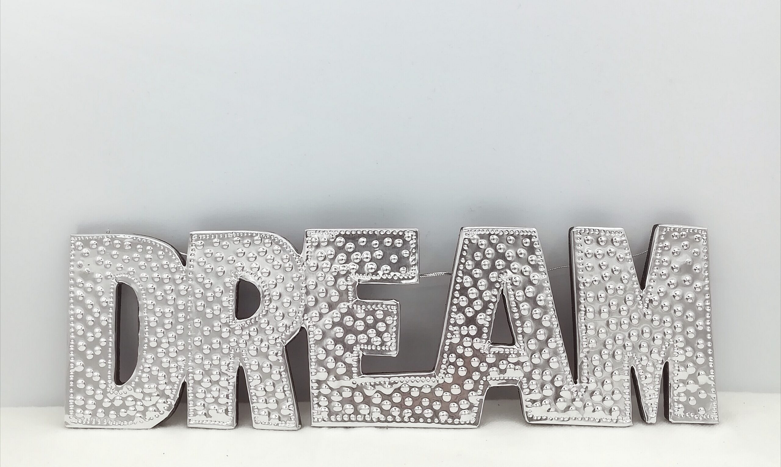 Scritta “dream” decorativa da appendere, su base in legno con decoro sbalzato in latta, prodotta in Indonesia