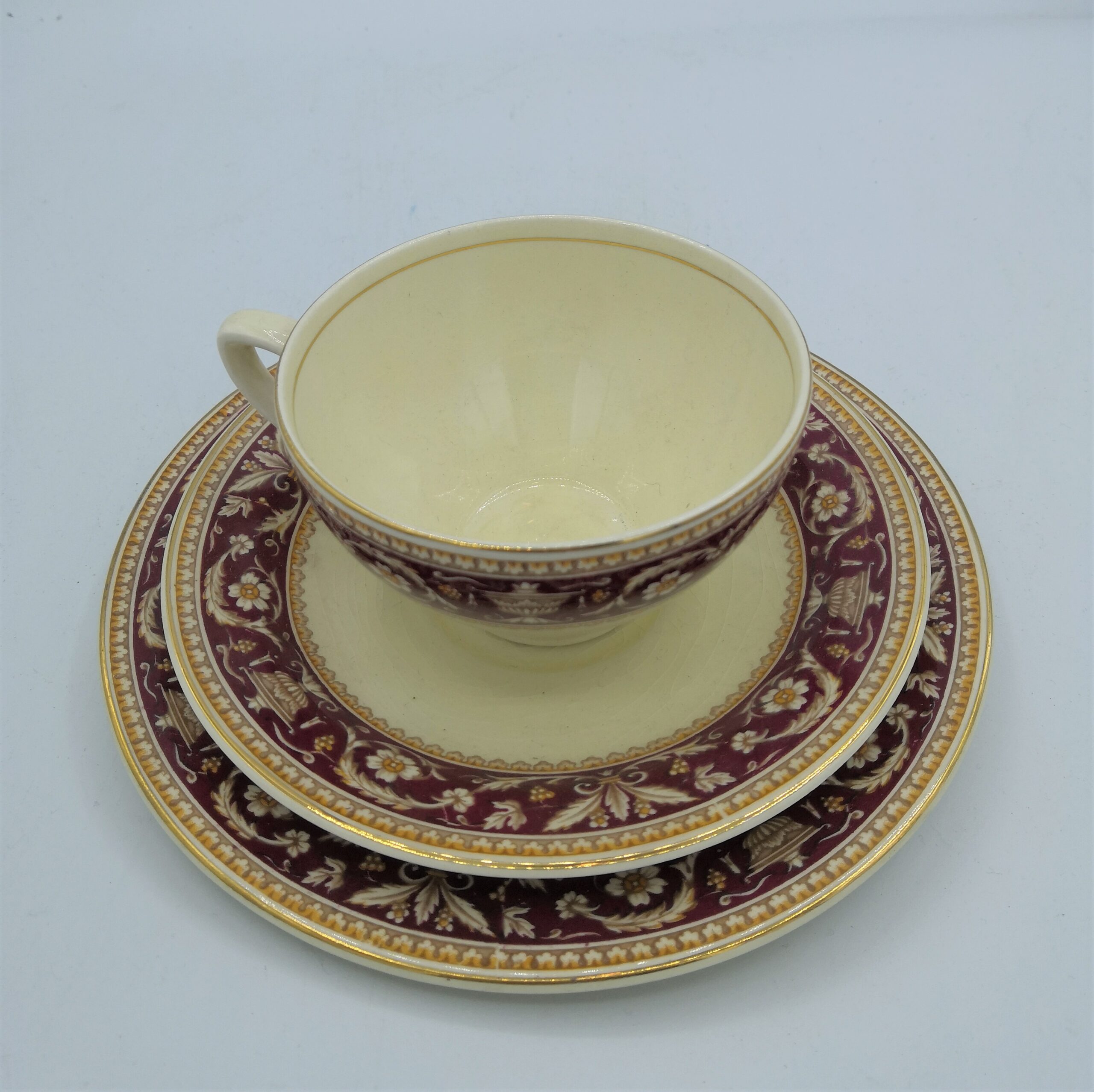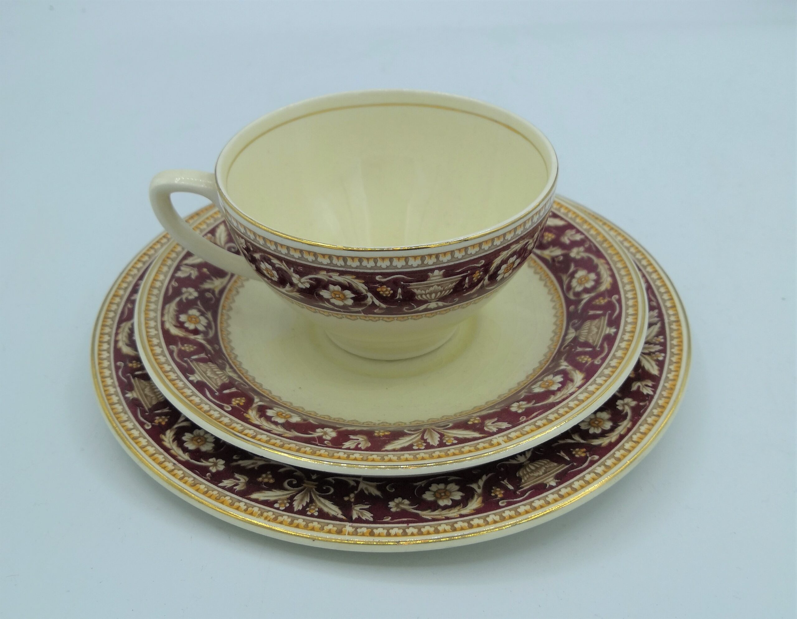 Il servizio da tea Annie è inglese, completo di sei tazzine in ceramica con doppio piattino, decorate finemente con foglie e fiori sui toni del panna, giallo e bordeaux.