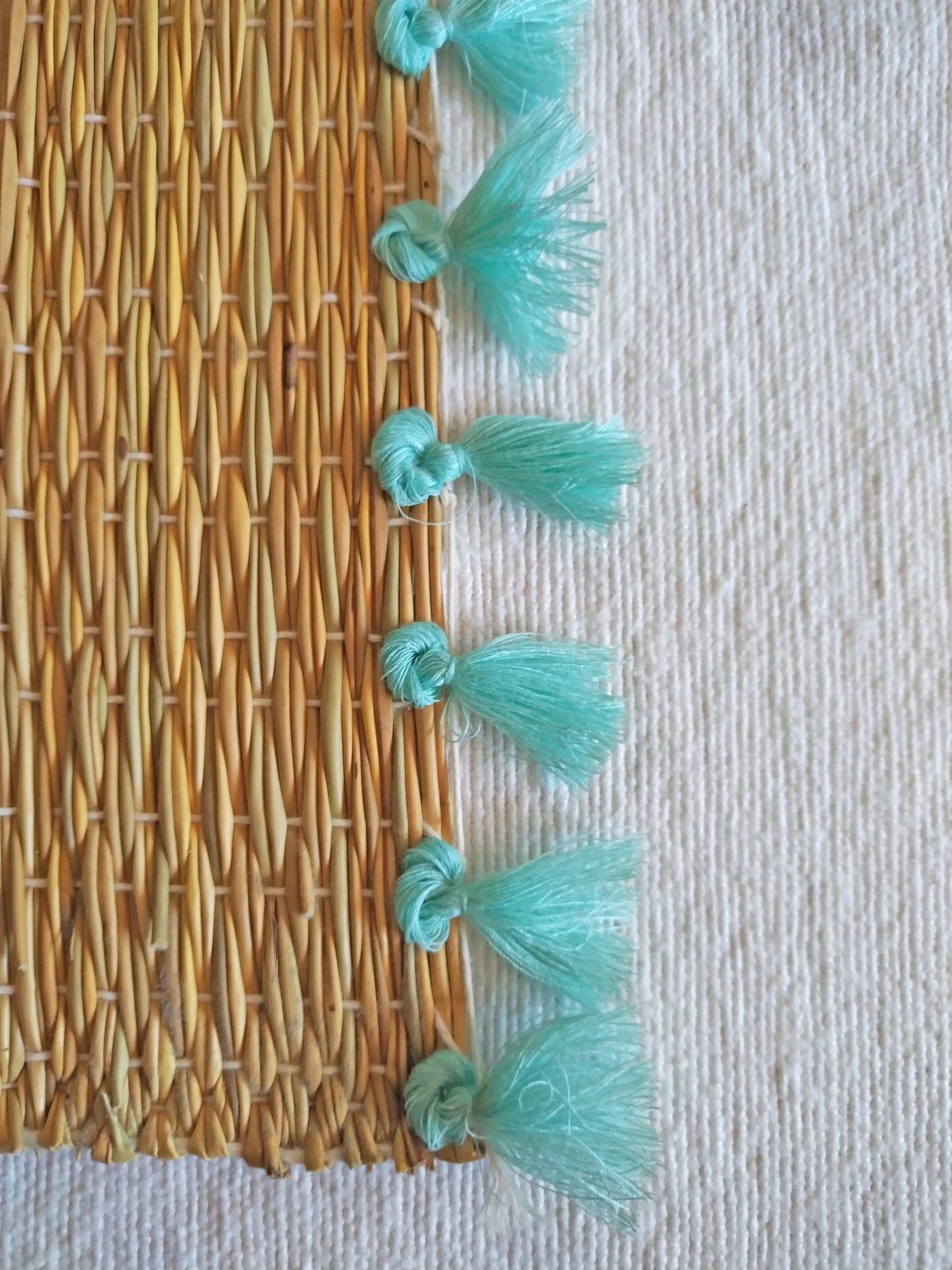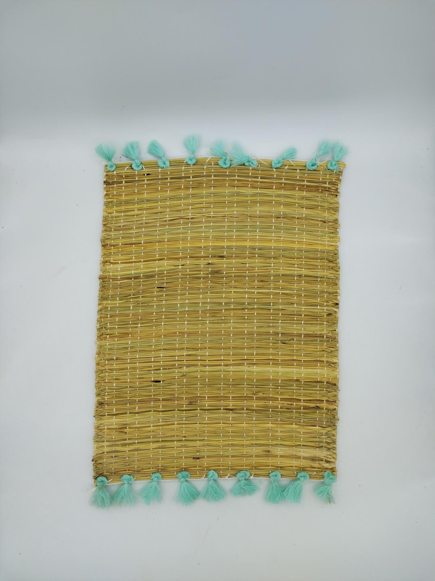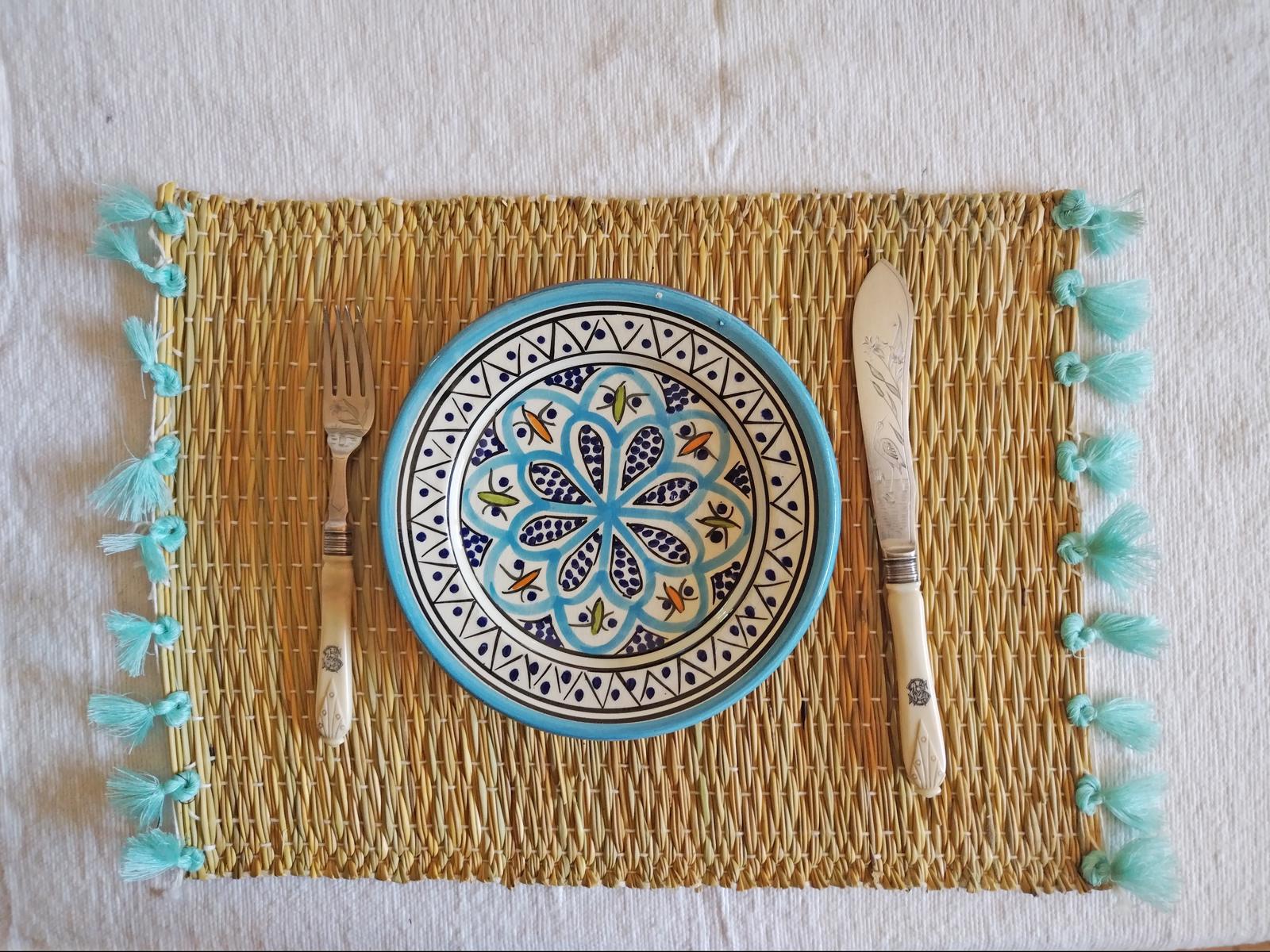 Sottopiatti rettangolari in paglia ornati lateralmente con nappine in cotone color celeste, realizzati artigianalmente in Marocco