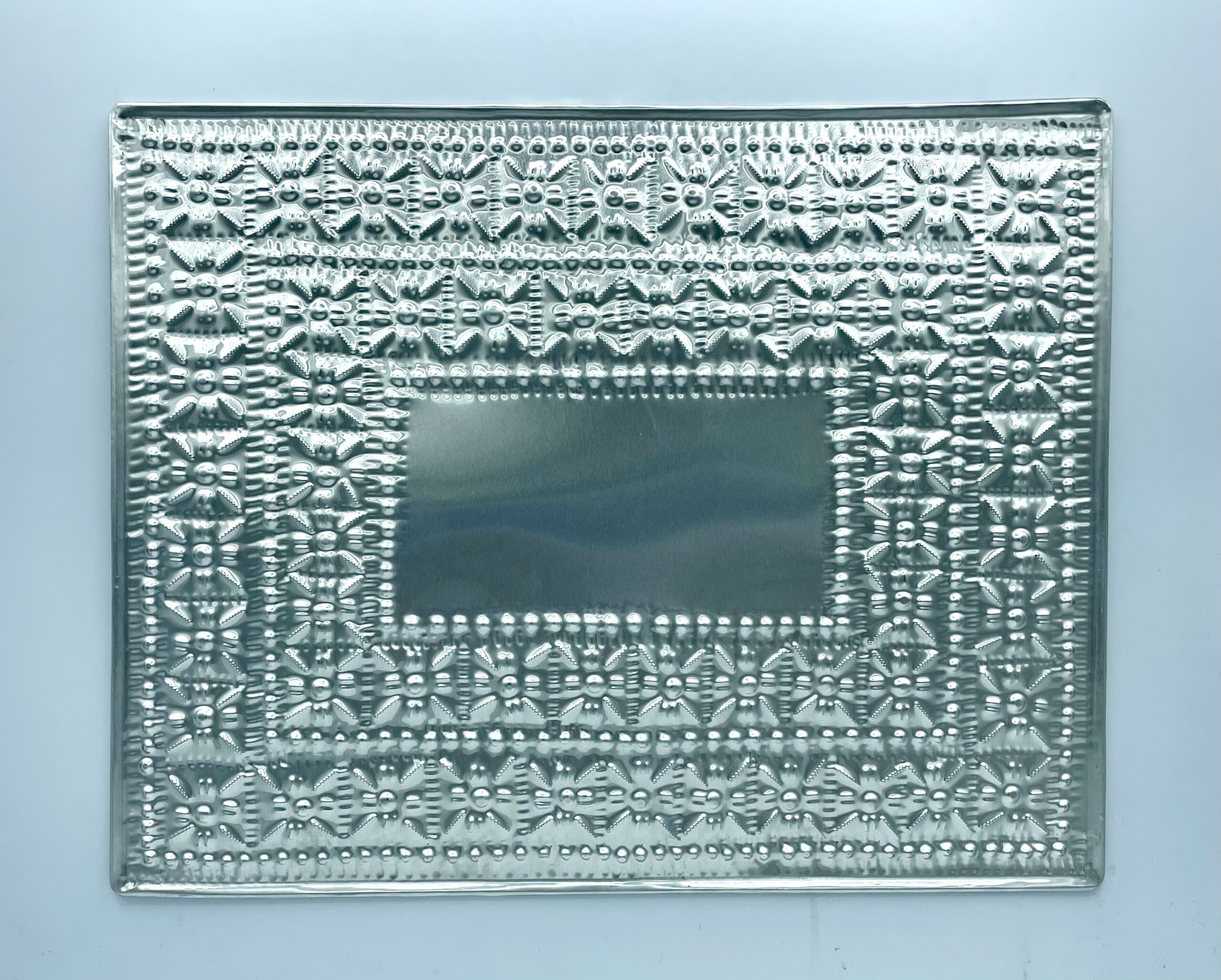 Sottopiatti rettangolari in latta sbalzata con decorazioni floreali, prodotti in Indonesia