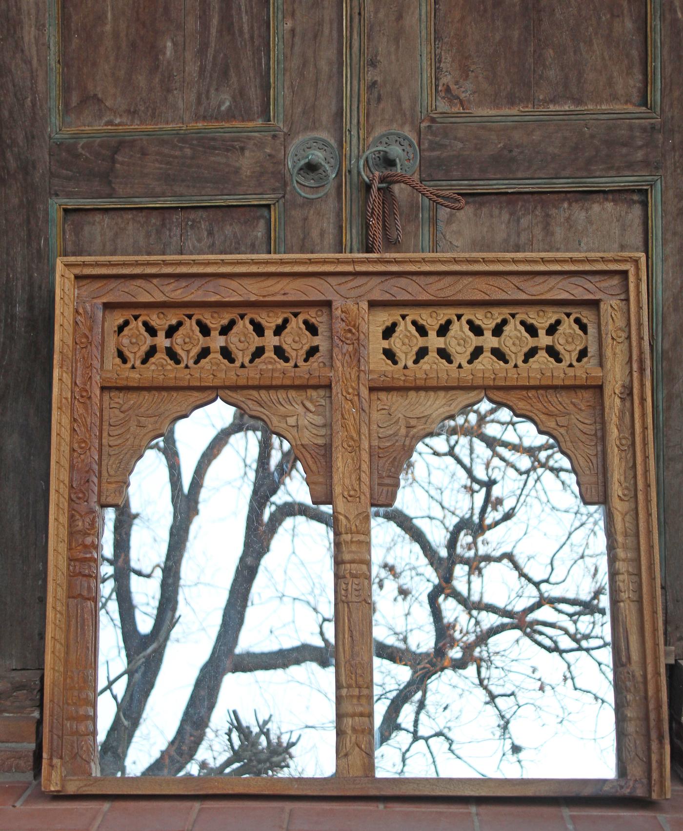 Specchio indiano con due archi, in legno di teak naturale, cornice interamente intagliata