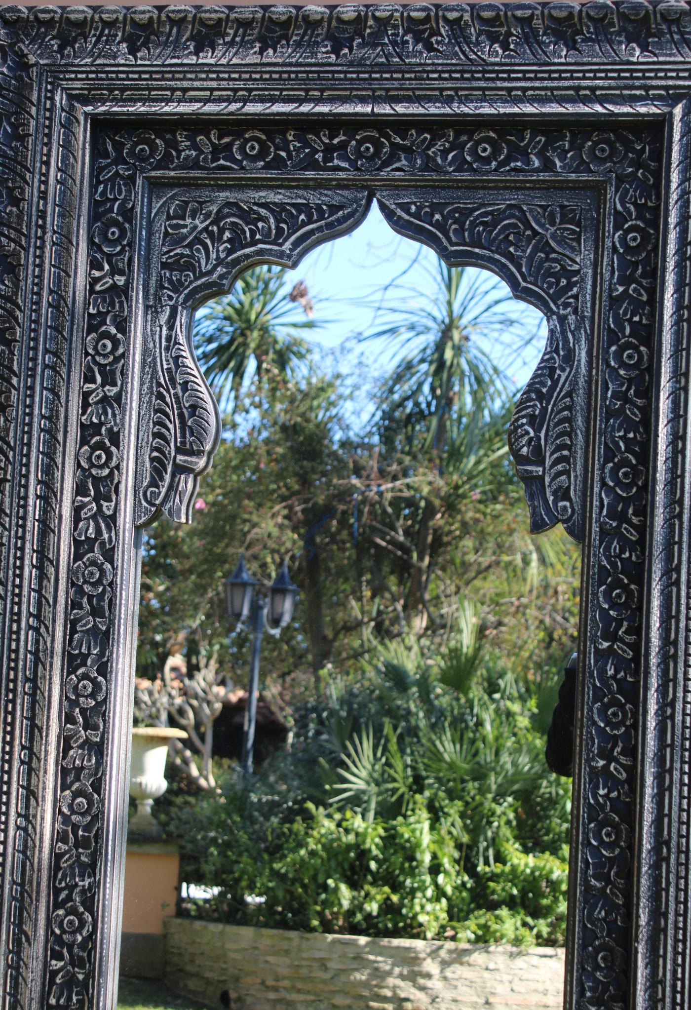Uno degli elementi più distintivi della cornice è l’arco orientale, elemento tipico dell’architettura indiana, che si sviluppa nella parte superiore, conferendo allo specchio un aspetto maestoso e affascinante.