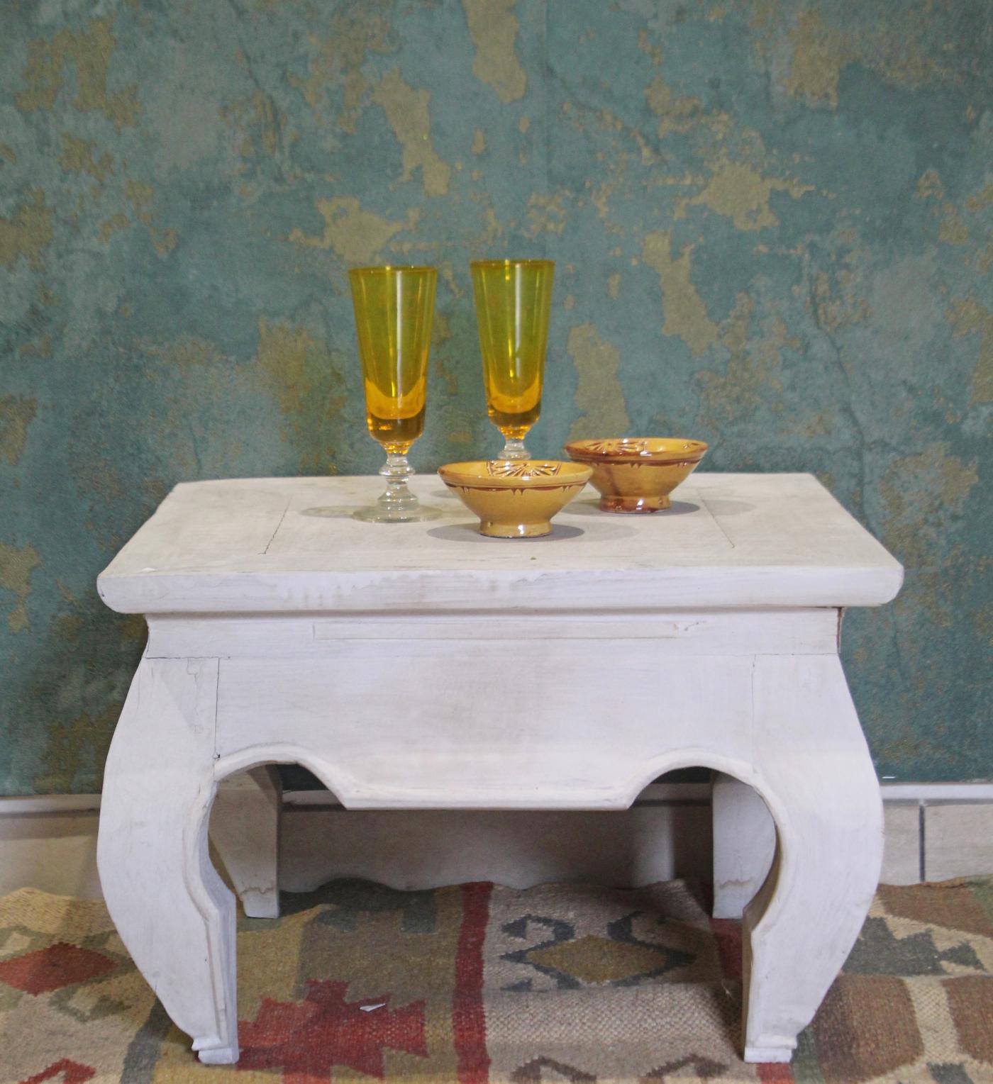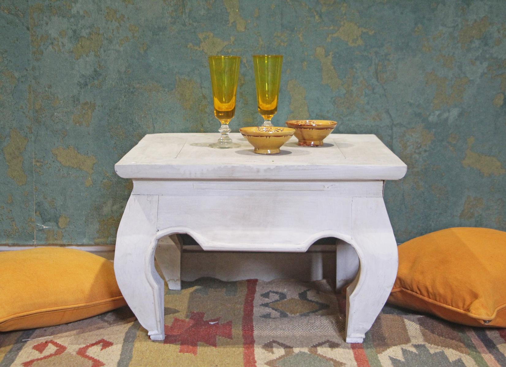Tavolino piccolo quadrato indonesiano ad oppio in legno di teak decapato bianco, con gambe ricurve