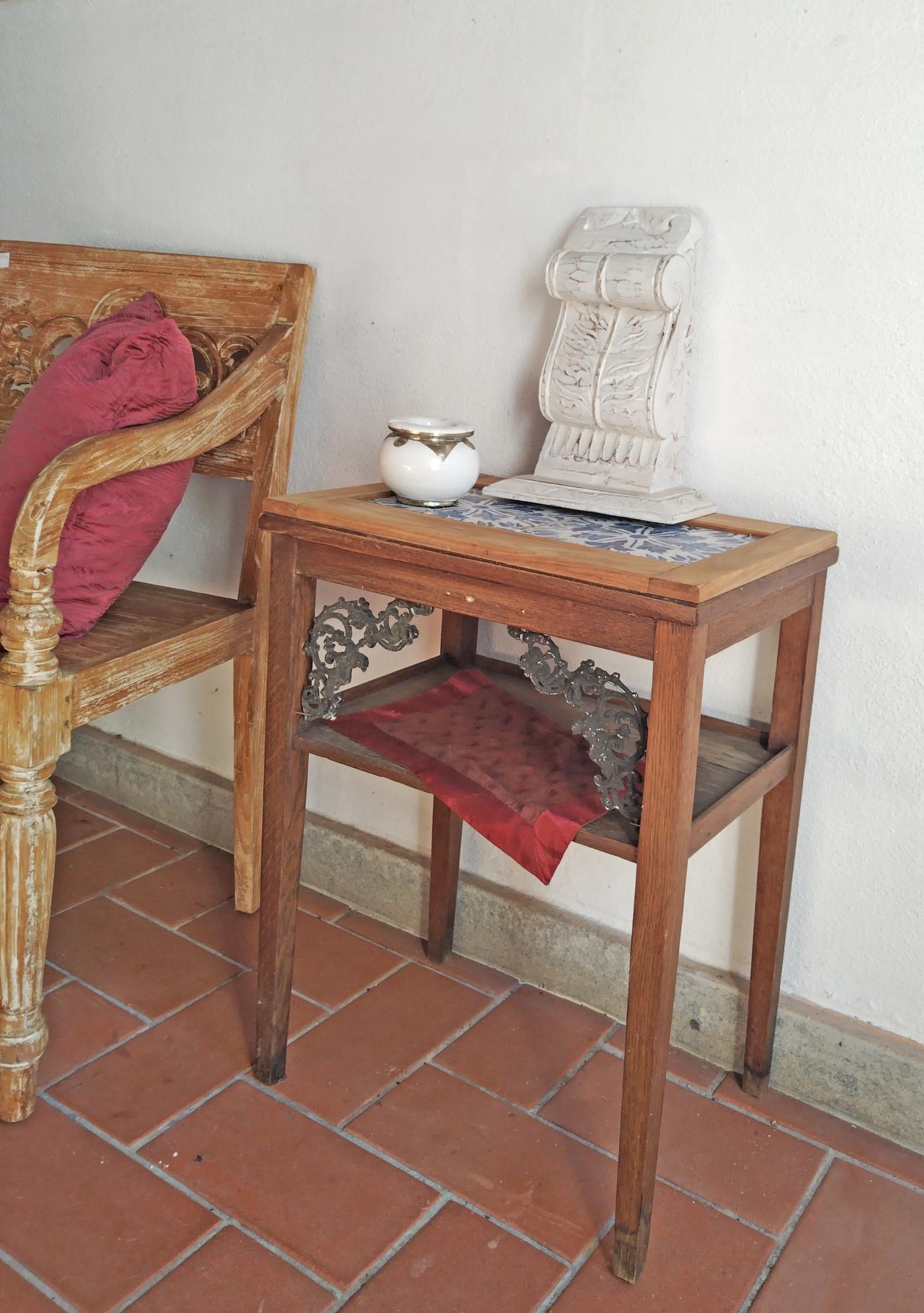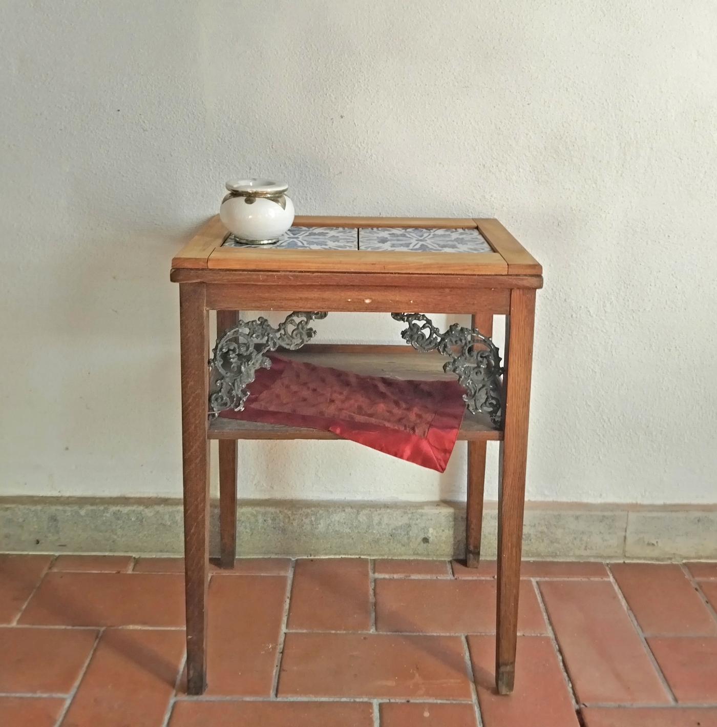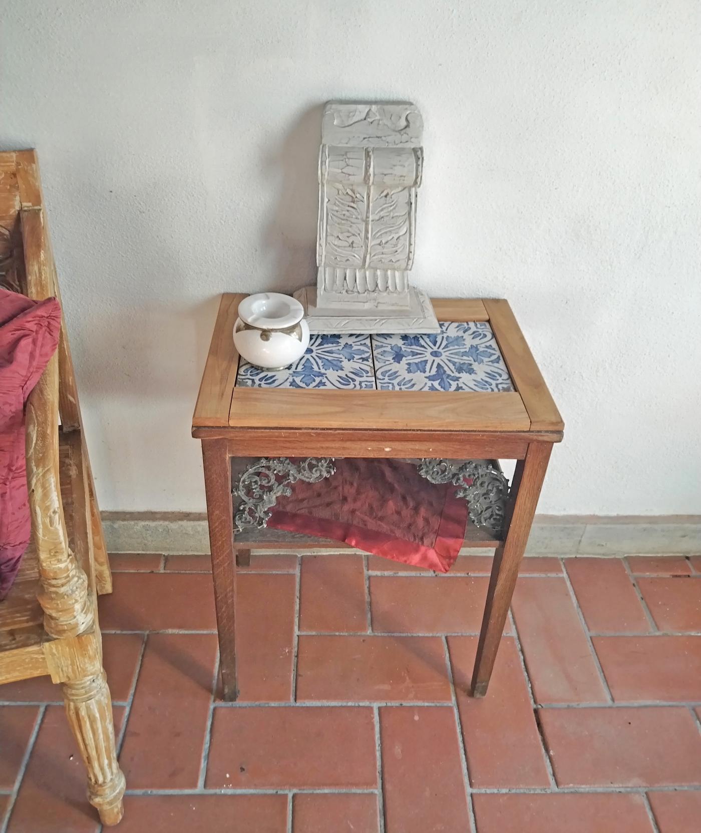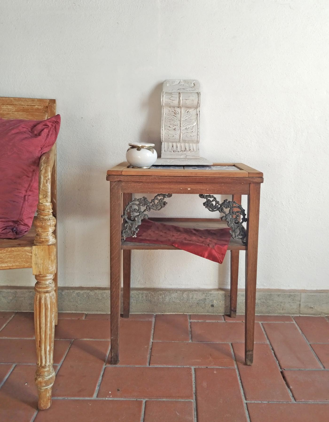 Tavolino piccolo in legno realizzato in India, con piano in maioliche e dettagli in ferro.